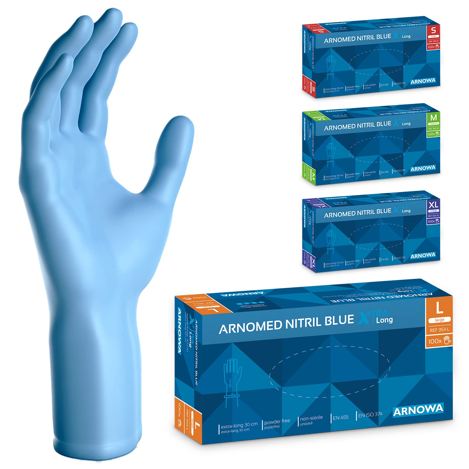 ARNOMED Einweghandschuhe Blau Extra Lang, 30cm Lange Einmalhandschuhe in L, Nitrilhandschuhe Einweg Extra Dick, 100 Stk/Box, Gummihandschuhe Lang Einweg, Nitrilhandschuhe Langer Schaft in S, M, L & XL