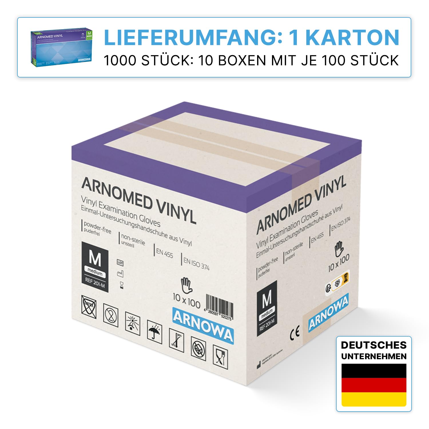 ARNOMED Einweghandschuhe M, Vinyl Handschuhe 1000 Stk (10x100 Stk), Einmalhandschuhe, Handschuhe Einweg puderfrei, Gummihandschuhe Einweg latexfrei, Einweg Handschuhe, Einmalhandschuhe in S, M, L, XL