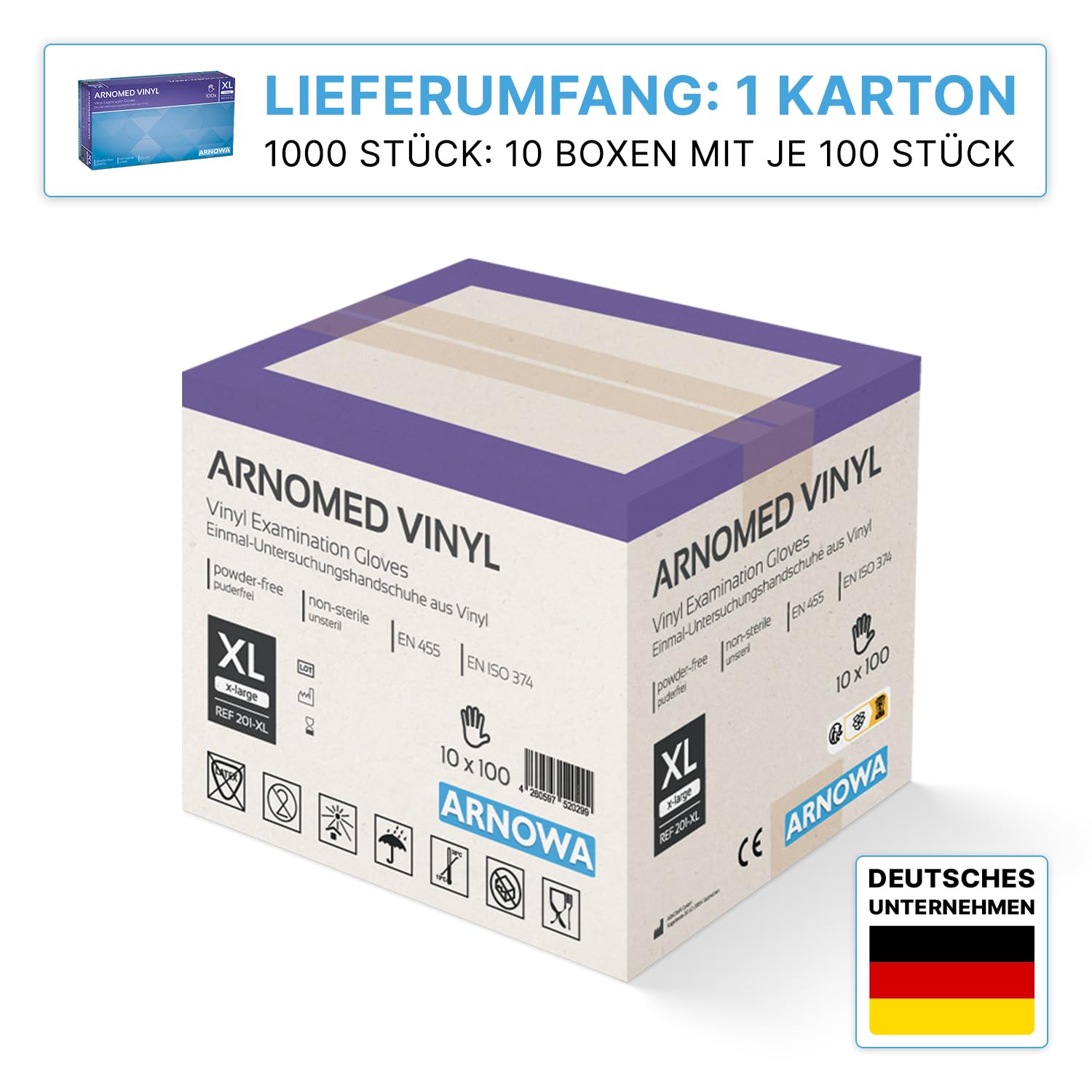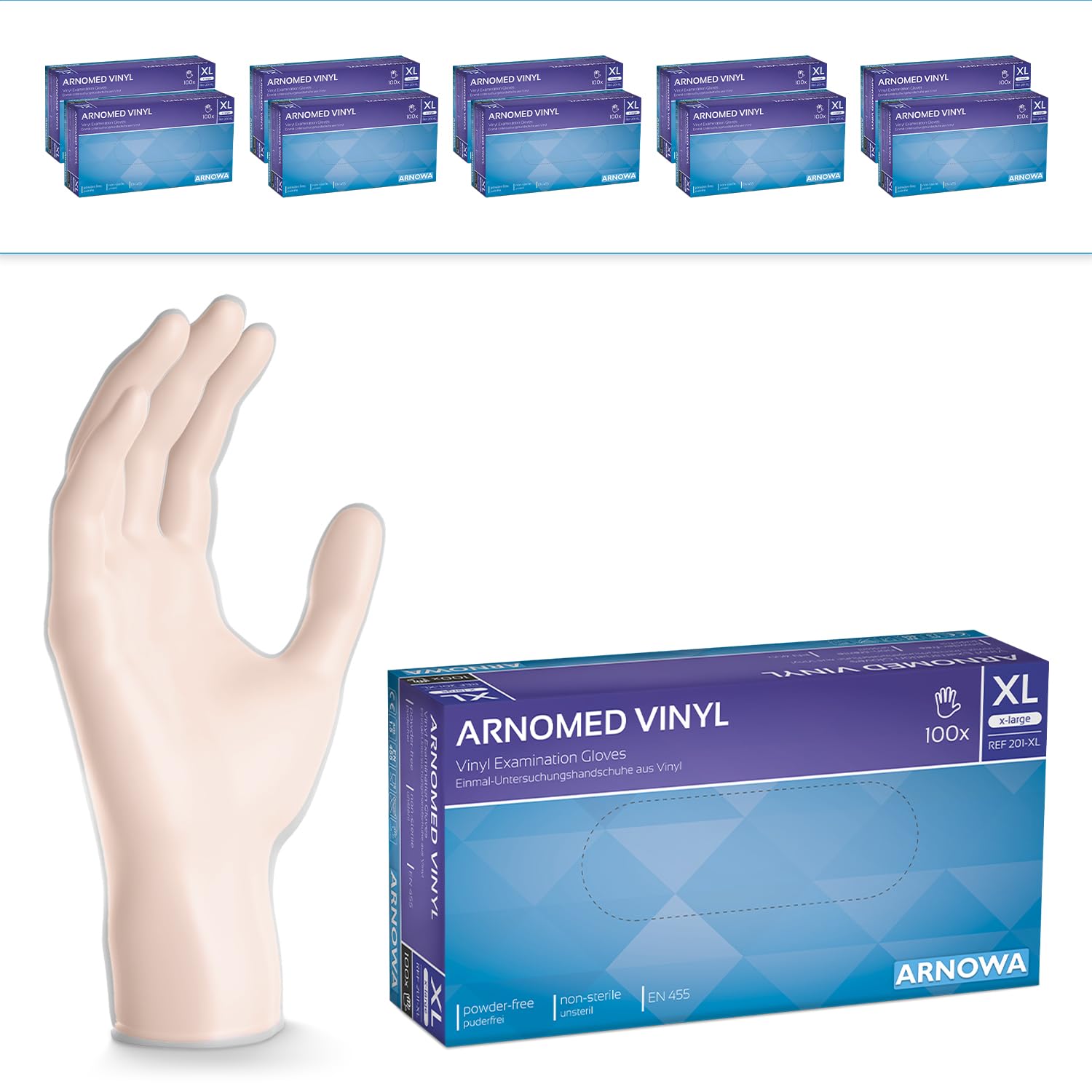ARNOMED Einweghandschuhe XL, Vinyl Handschuhe 1000 Stk (10x100 Stk), Einmalhandschuhe, Handschuhe Einweg puderfrei, Gummihandschuhe Einweg latexfrei, Einweg Handschuhe, Einmalhandschuhe in S, M, L, XL