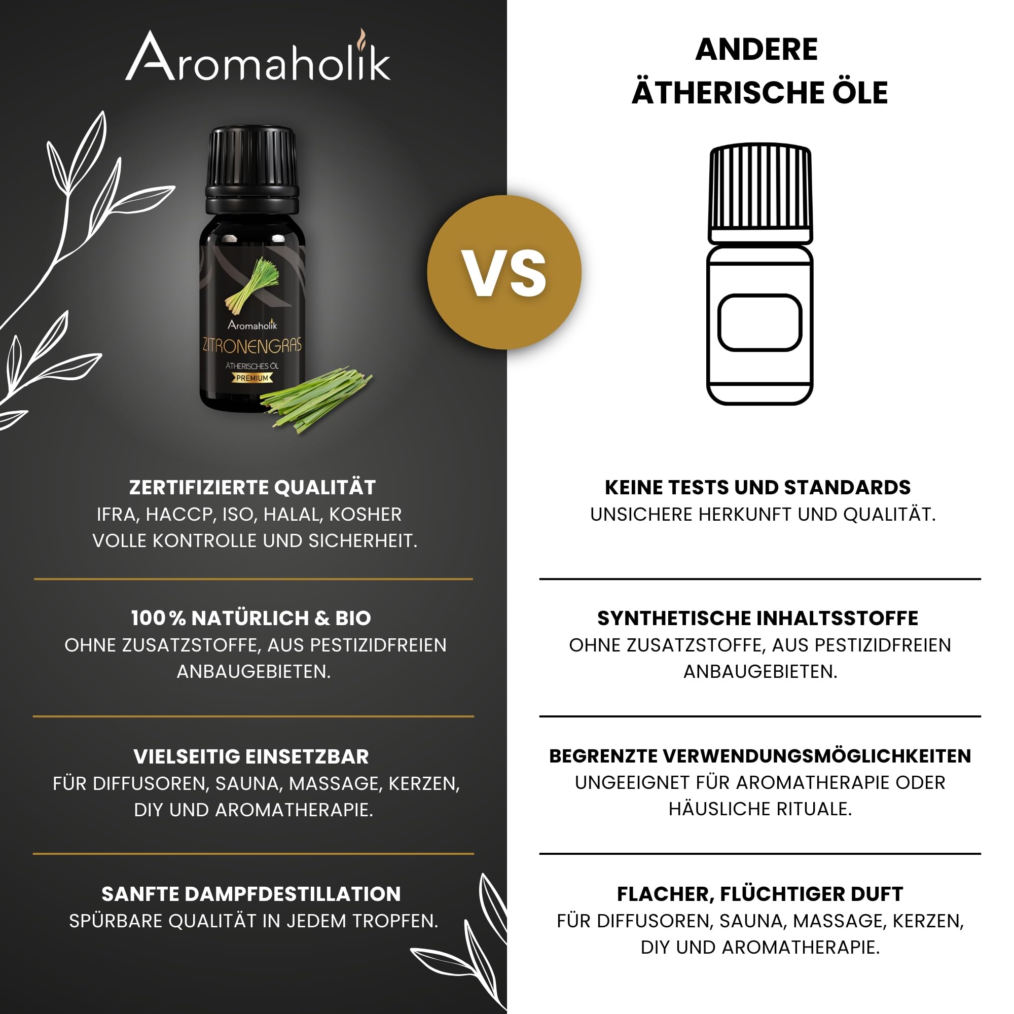 Aromaholik Zitronengrasöl BIO 100% naturrein – Ätherische Öle für Diffuser & Aroma Diffuser – Zertifiziertes ätherisches Öl aus Indien – Lemongrass Essential Oils 10ml für Sauna & Massage