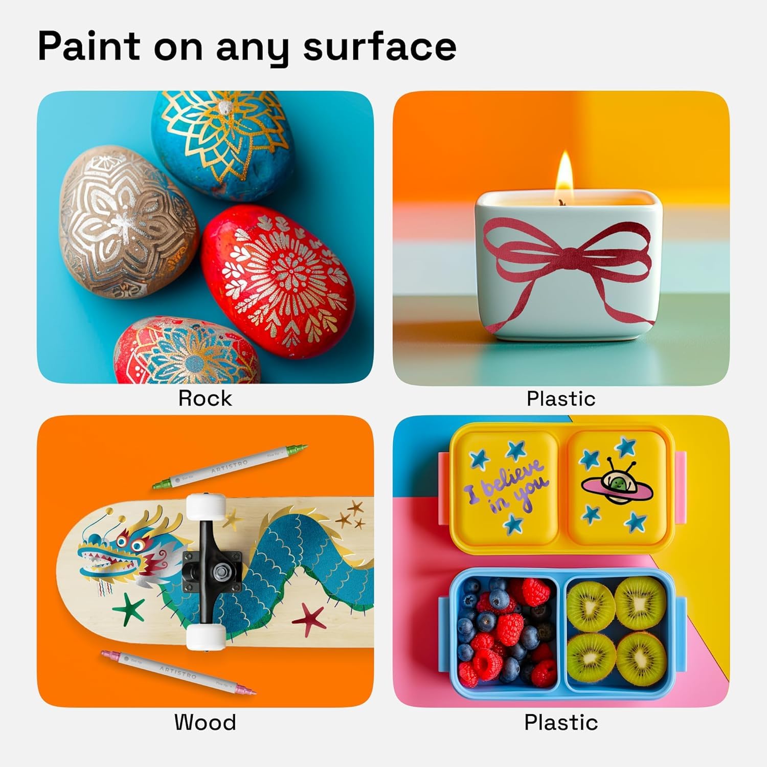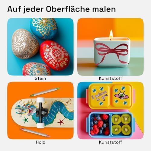 - FUNKTIONIERT AUF FAST ALLEN OBERFLÄCHEN: Diese vielseitigen Acrylmalstifte gleiten mühelos über Papier, Leinwand, Stoff, Holz, Glas, Metall, Keramik und Stein – mit gleichmässiger, lichtbeständiger Farbabdeckung.