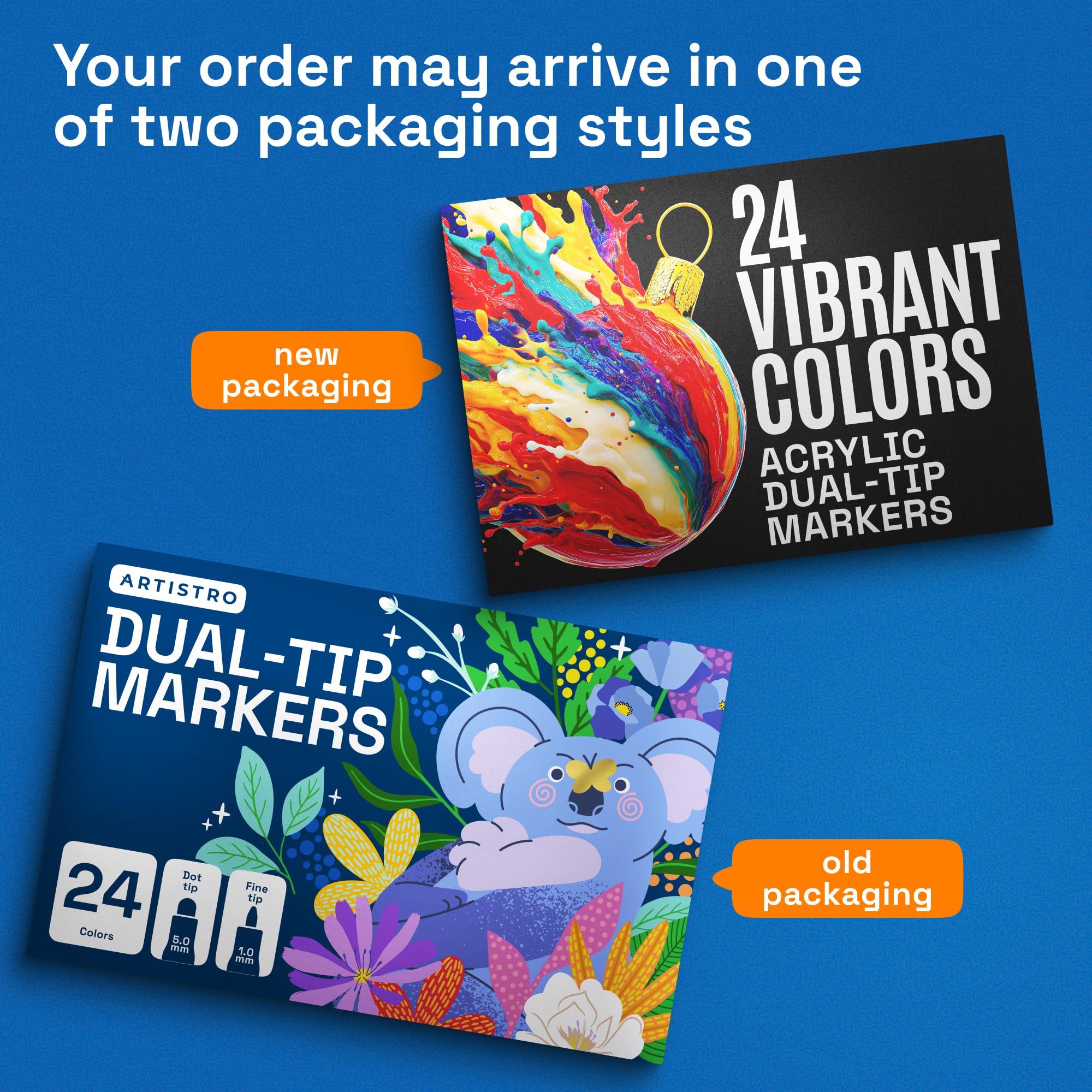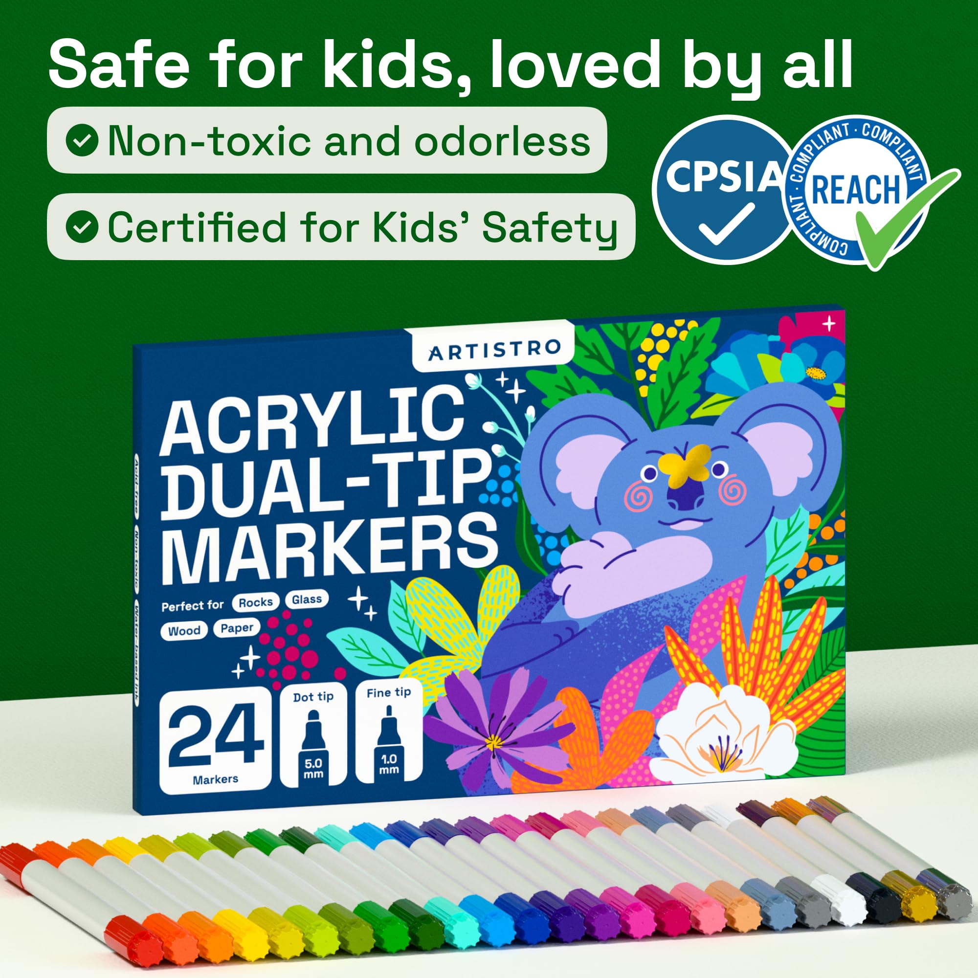 ARTISTRO 24 Acrylstifte, Acrylmarker mit Doppelspitze (Pinsel + fein 1 mm), Zeichenset, Acrylmarker für Stoff, Leinwand, Stein, Glas, Holz, Papier, Farbmarker für Kinder und Erwachsene