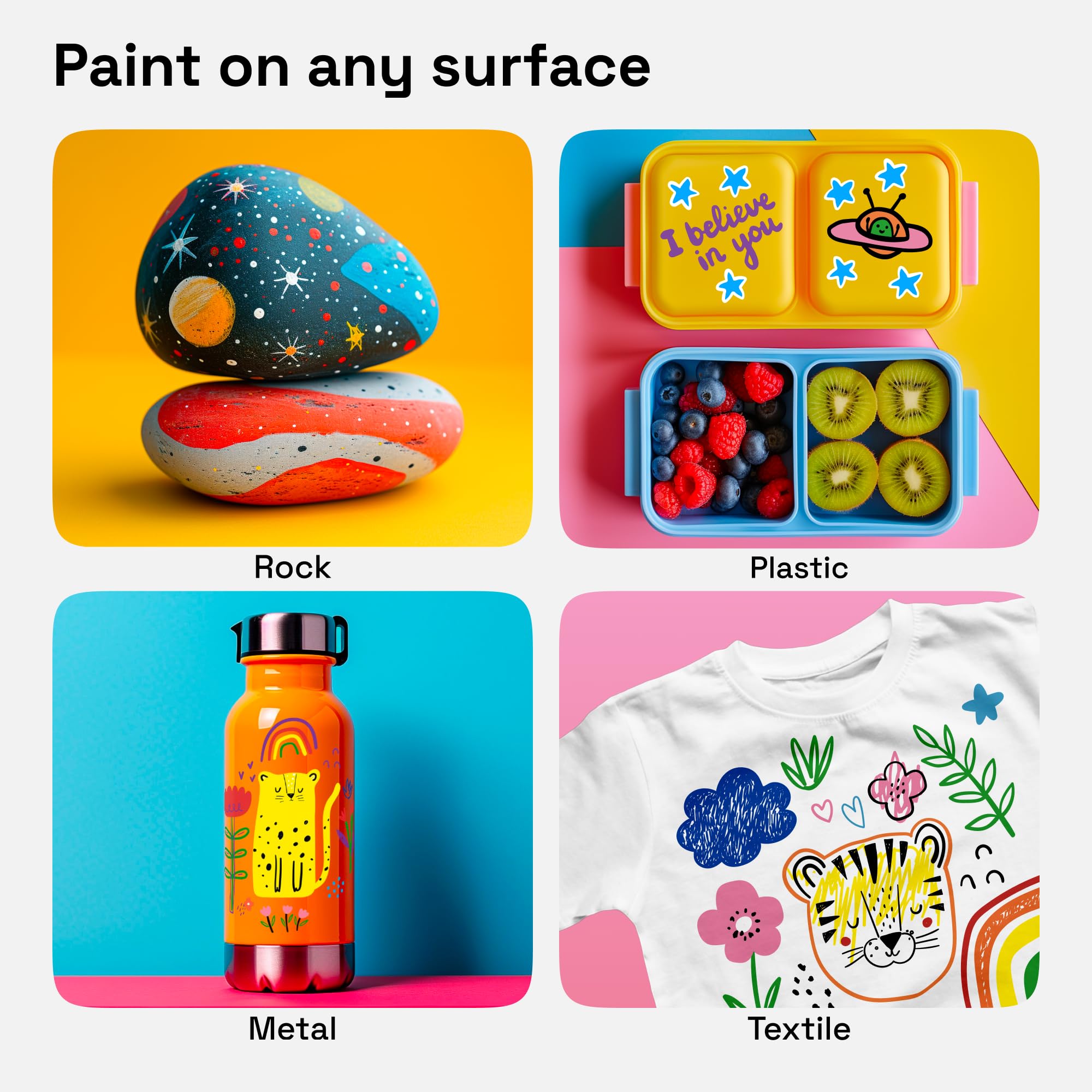 • FUNKTIONIERT AUF FAST ALLEN OBERFLÄCHEN: Diese vielseitigen Acrylmalstifte gleiten mühelos über Papier, Leinwand, Stoff, Holz, Glas, Metall, Keramik und Stein – mit gleichmässiger, lichtbeständiger Farbabdeckung.