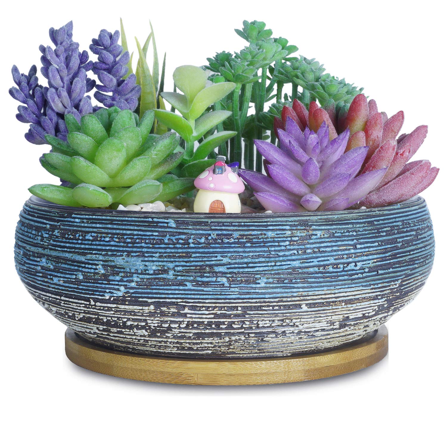 Dekorieren Sie Ihr Zuhause. Der Artkettys Blumentopf kann mit schönen Sukkulenten, Kakteen und kleinen Bonsaibäumen gefüllt werden, die Ihren Schreibtisch, Ihre Fensterbank, Ihr Bücherregal und Ihren Garten schmücken und Ihrem Wohnraum einen Hauch von Vitalität und Energie verleihen. Die Bambusuntertasse hält den Topf perfekt und fängt Tropfen von Pflanzen auf.