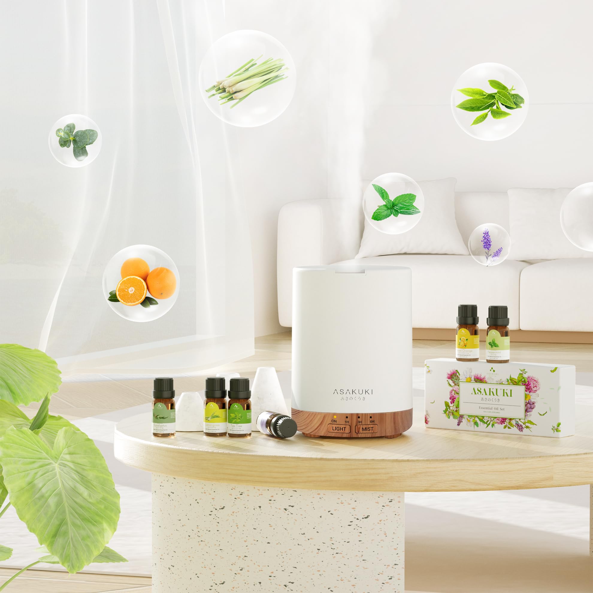 ASAKUKI 300ML Aroma Diffuser mit 6 * 10ML Ätherische Öle Set, Ätherische Öl Diffusor,Ultraschall-Luftbefeuchter für Home Office, 15 Farbe LED mit 4 Timer Einstellung