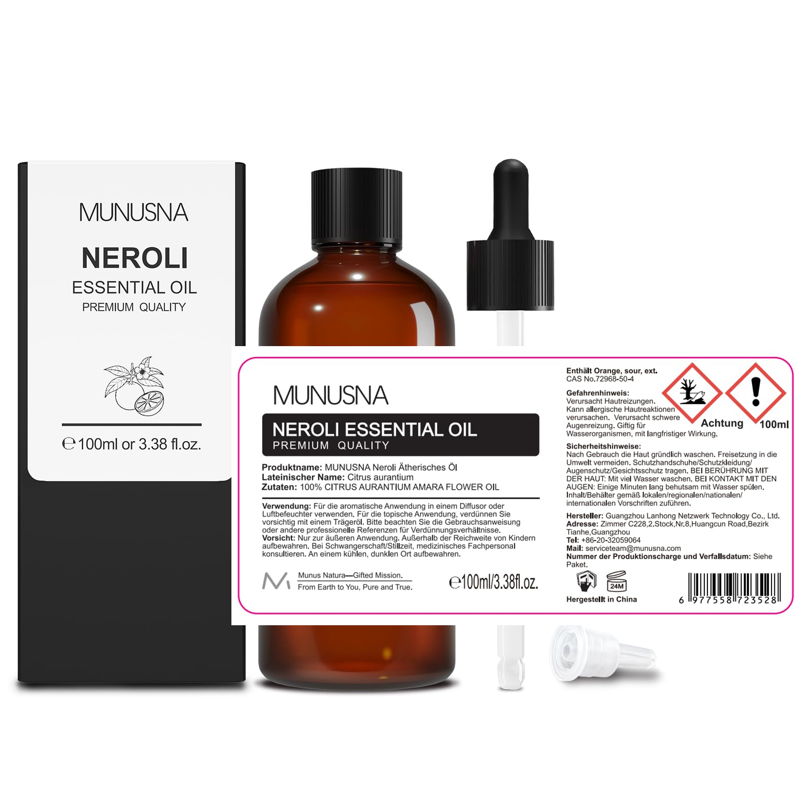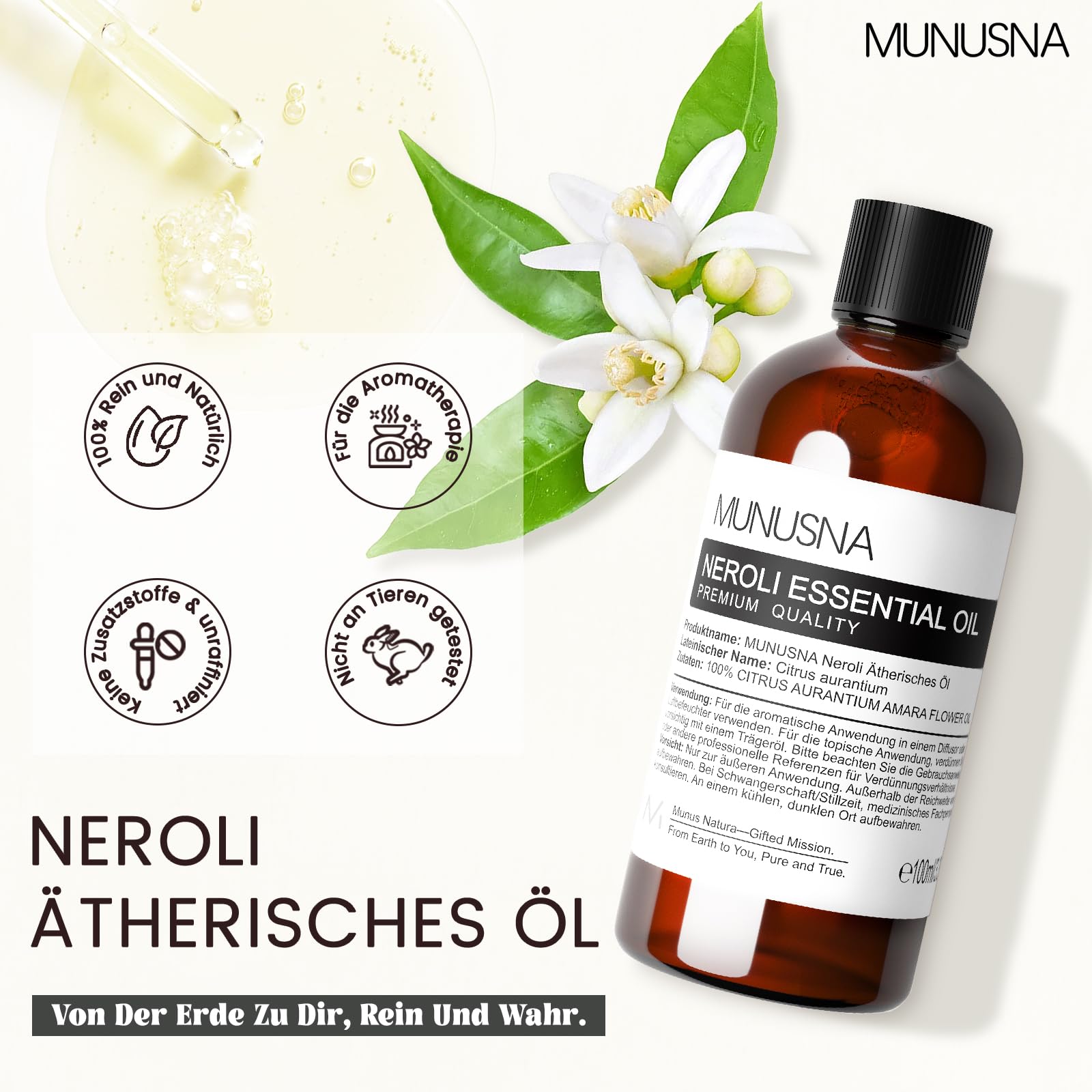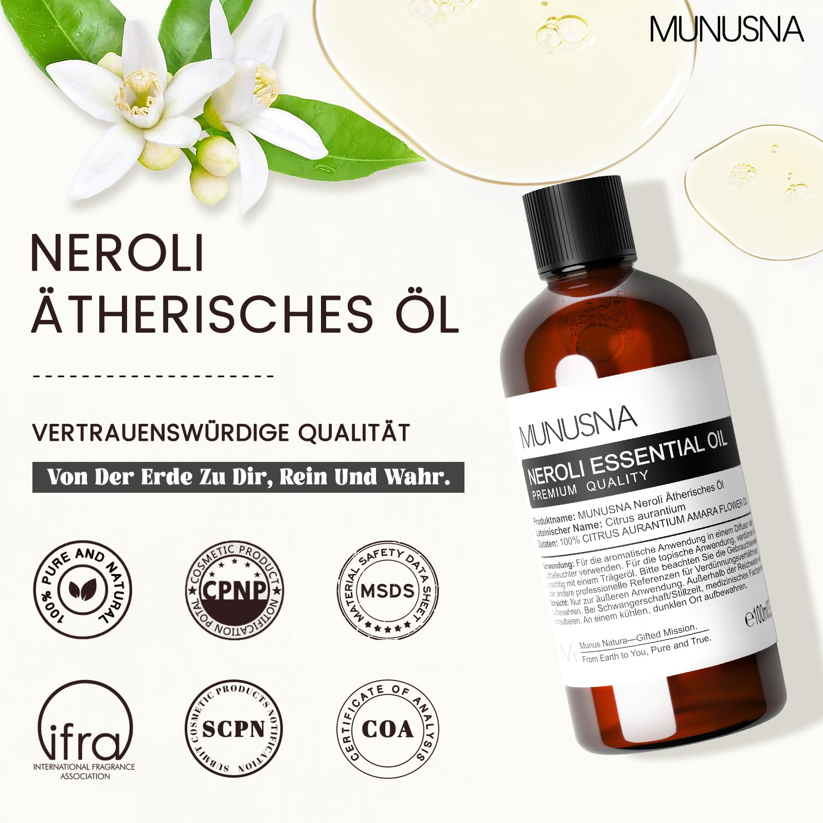 Ätherisches Öl Neroliöl 100ML, MUNUSNA Ätherische Öle Neroli Rein Naturrein für Aroma Diffuser, Duftöl Orangenblütenöl für DIY Seifen, Kerzen, Neroli Oil