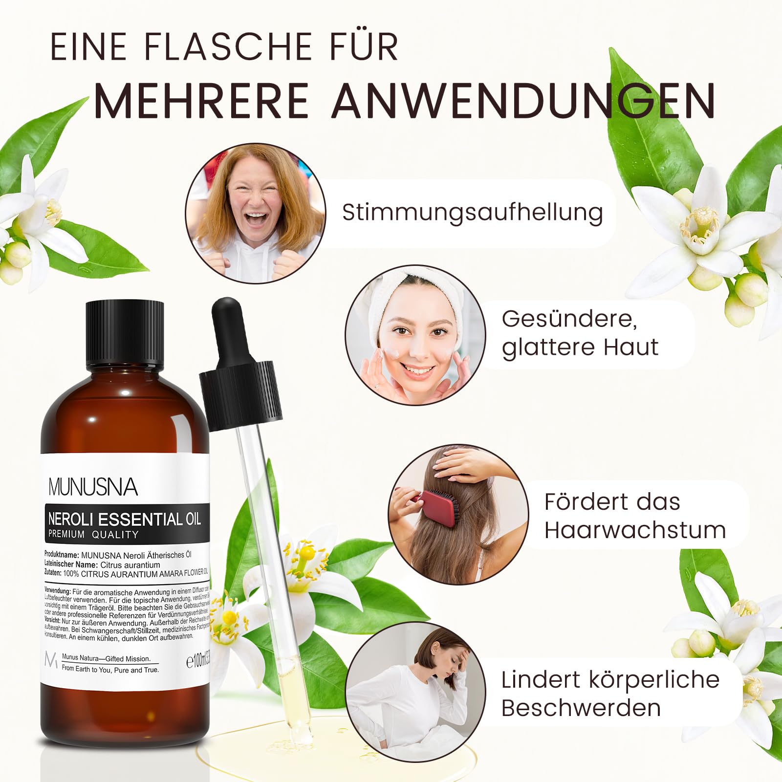 "MUNUSNA Neroli Ätherisches Öl 100ML, 100% reines und natürliches Aroma Neroli Öl, auf Inhaltsstoffe getestet, frei von Füllstoffen, Zusatzstoffen und unverdünnt, um Ihnen erstklassige und hochwertige ätherische Öle Neroli zu bieten. Perfekt für Raumdüfte, Schönheitspflege, feuchtigkeitsspendendes Haar, DIY-Kerzen, Seifen und vieles mehr. MUNUSNA Destillierte ätherische Öle: Durch Wasserdampfdestillation gewonnen, behalten sie mehr Nährstoffe natürlicher Pflanzen und haben ein milderes krautiges Aroma mit einem angenehmen und erfrischenden Aroma. Ätherische Öle für Diffuser: Wenn Sie Ihren Kissen, Diffusoren und Luftbefeuchtern die richtige Menge an Duftöl hinzufügen, können Sie den Raum mit einem beruhigenden Duft füllen, der zur Entspannung beiträgt. Pflanzliches ätherisches Öl zum Waschen von Kleidung: Wenn Sie während der Wäsche 3 Tropfen reines, natürlich blumiges, duftendes ätherisches Öl hinzufügen, können Sie Ihrer Garderobe einen natürlichen Duft verleihen, der den ganzen Tag anhält. Ätherische Öle für Massageöl: 2-4 Tropfen Aromaöl mit 10 ml Trägeröl oder Massageöl verdünnen und am ganzen Körper einmassieren, um Muskelkater zu lindern. Ätherische Öle für Haaröl: Mischen Sie das Duftöl mit einem Shampoo oder Conditioner und massieren Sie es in die Kopfhaut ein, um die Kopfhaut zu nähren und trockenes, krauses und geschädigtes Haar weich zu machen, so dass das Haar weich und glänzend wird. Einzigartige hausgemachte Duftprodukte: Natürliches ätherisches Öl kann zur Herstellung einer Vielzahl von Haushaltsprodukten wie Duftkerzen, Seifen, Körperlotionen, Cremes und Badesalzen verwendet werden. Notizen: Das Produkt ist nur zur äusserlichen Anwendung bestimmt. Vermeiden Sie den Kontakt mit den Augen. Wenn Sie einsteigen, spülen Sie sofort mit klarem Wasser ab. Wenn es Anzeichen von Reizungen gibt, stellen Sie die Anwendung ein."
