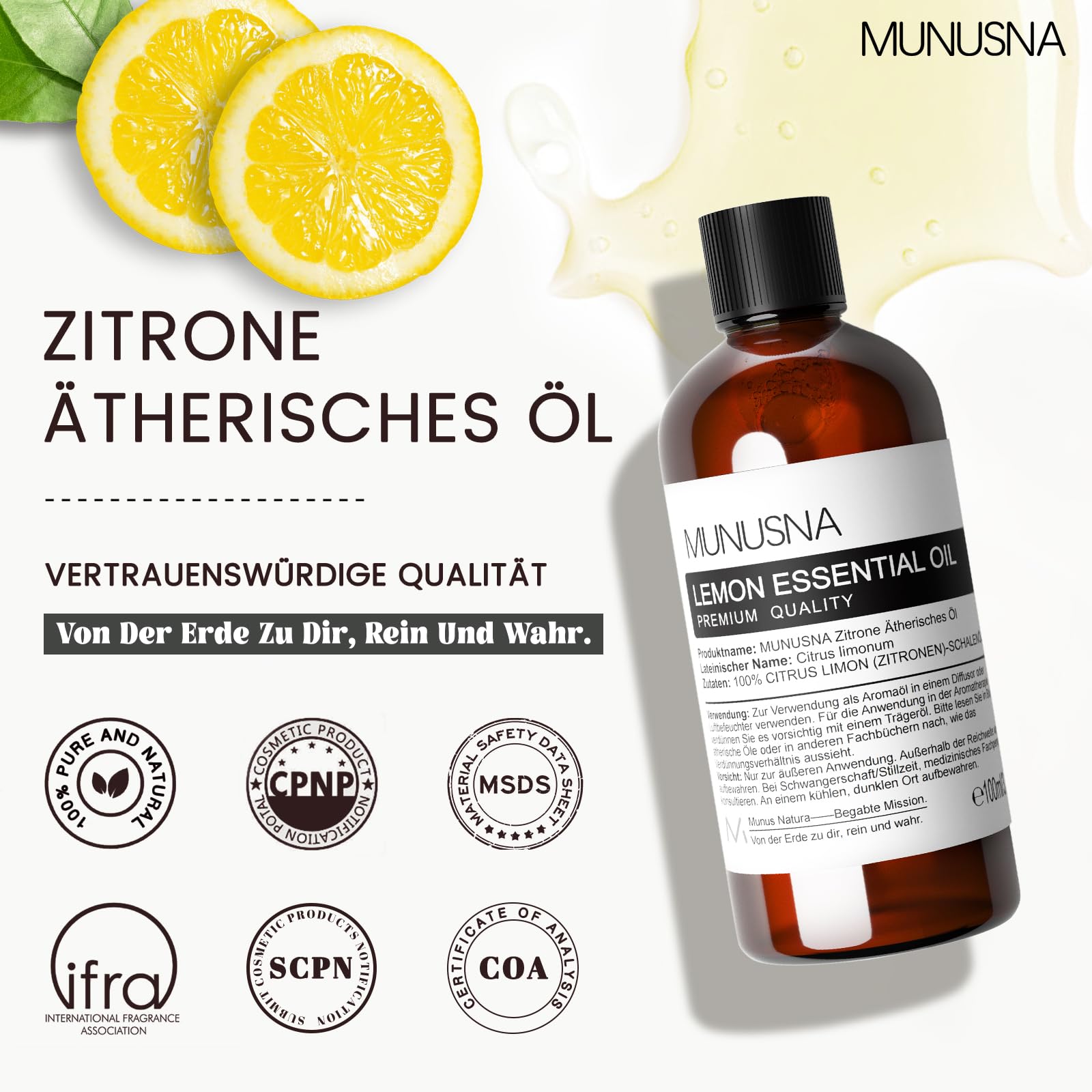• ✅ Reine natürliche ätherische Öle Zitrone - Das MUNUSNA-Team weiss, dass Qualität der einzige Weg ist, um die Liebe der Kunden langfristig zu gewinnen! Zu diesem Zweck haben wir uns umfangreichen Langzeitscreenings und -tests unterzogen, um jeden Tropfen ätherisches Öl durch Destillation mit hochwertigen Rohstoffen, ohne Zusatzstoffe und ohne Verdünnung zu extrahieren, um Ihnen ein hochkonzentriertes, reines und natürliches Zitronenöl zu liefern.
