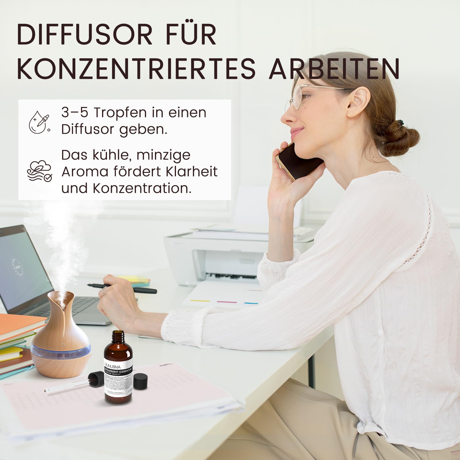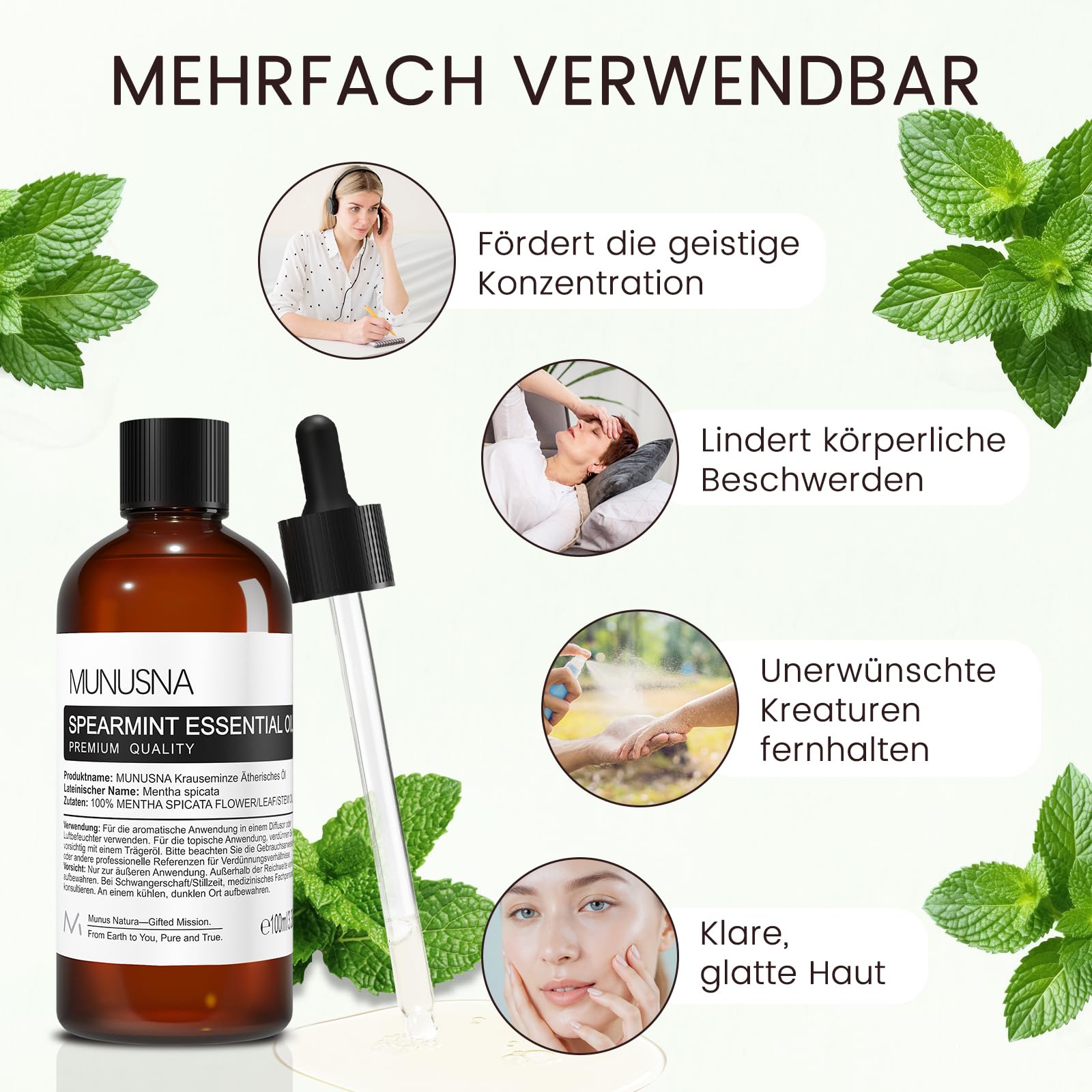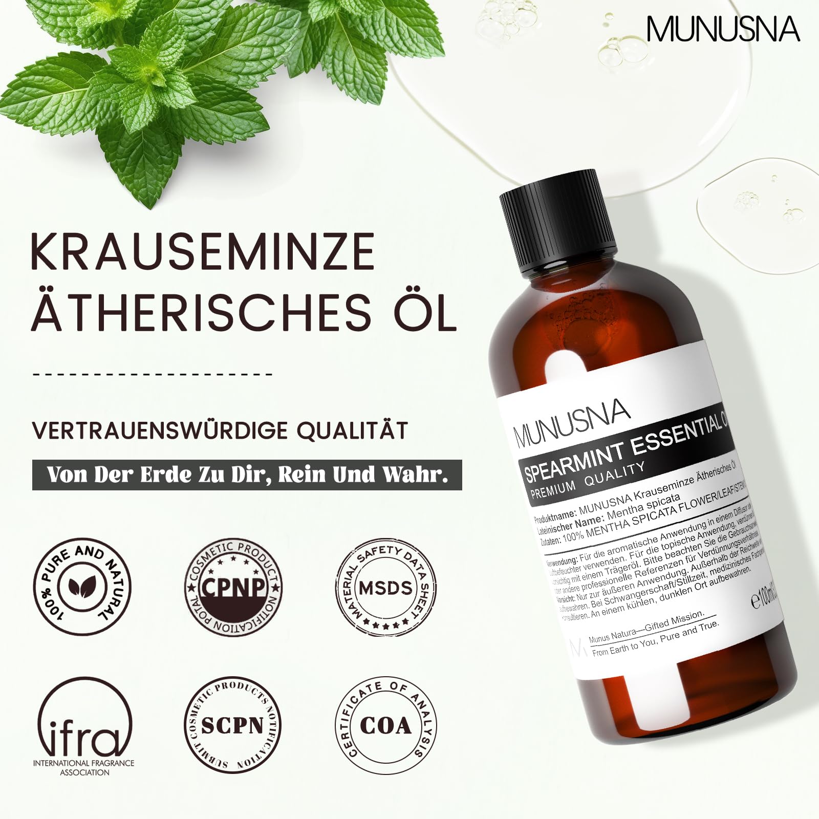 Ätherisches Öl Grünes Minzöl 100ML, MUNUSNA Ätherische Öle Spearmintöl Rein Naturrein für Geist Beruhigen, Duftöl Krauseminze für Aroma Diffuser, Raumdüfte, Spearmint Oil