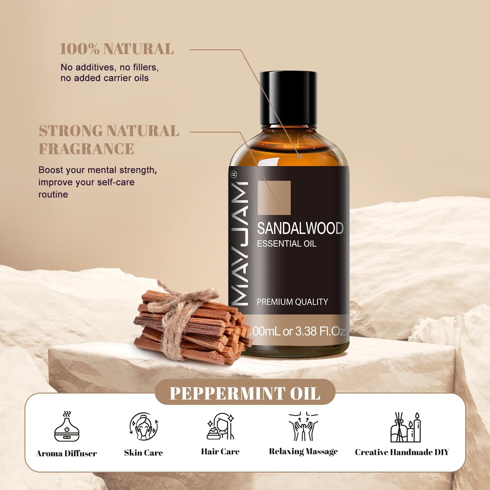 Ätherisches Öle Sandelholz 100ML, MAYJAM Sandelholzöl 100% Rein, Ideal für Klarheit der Inspiration Aromatherapie Diffuser Duftöl Massage