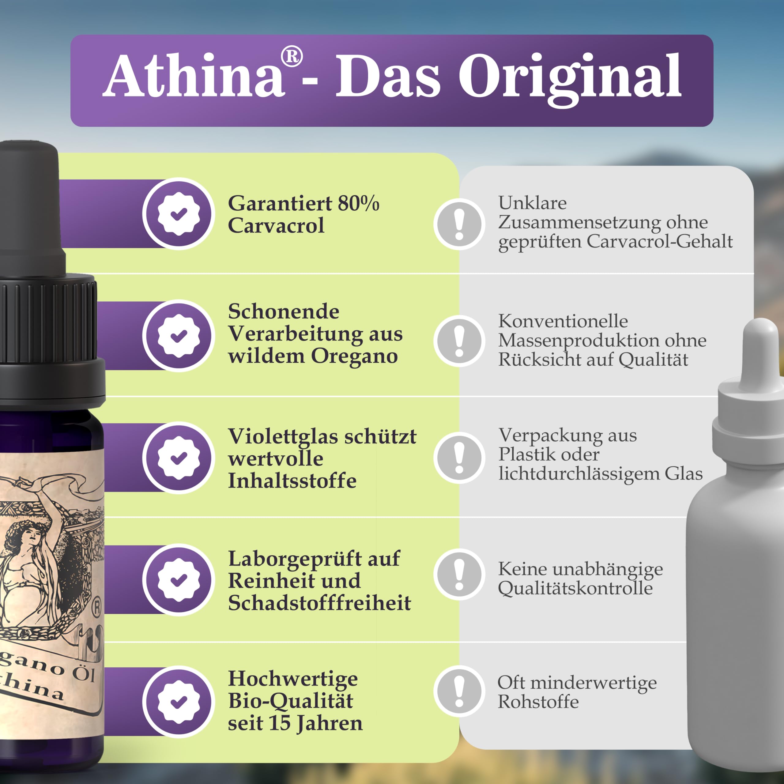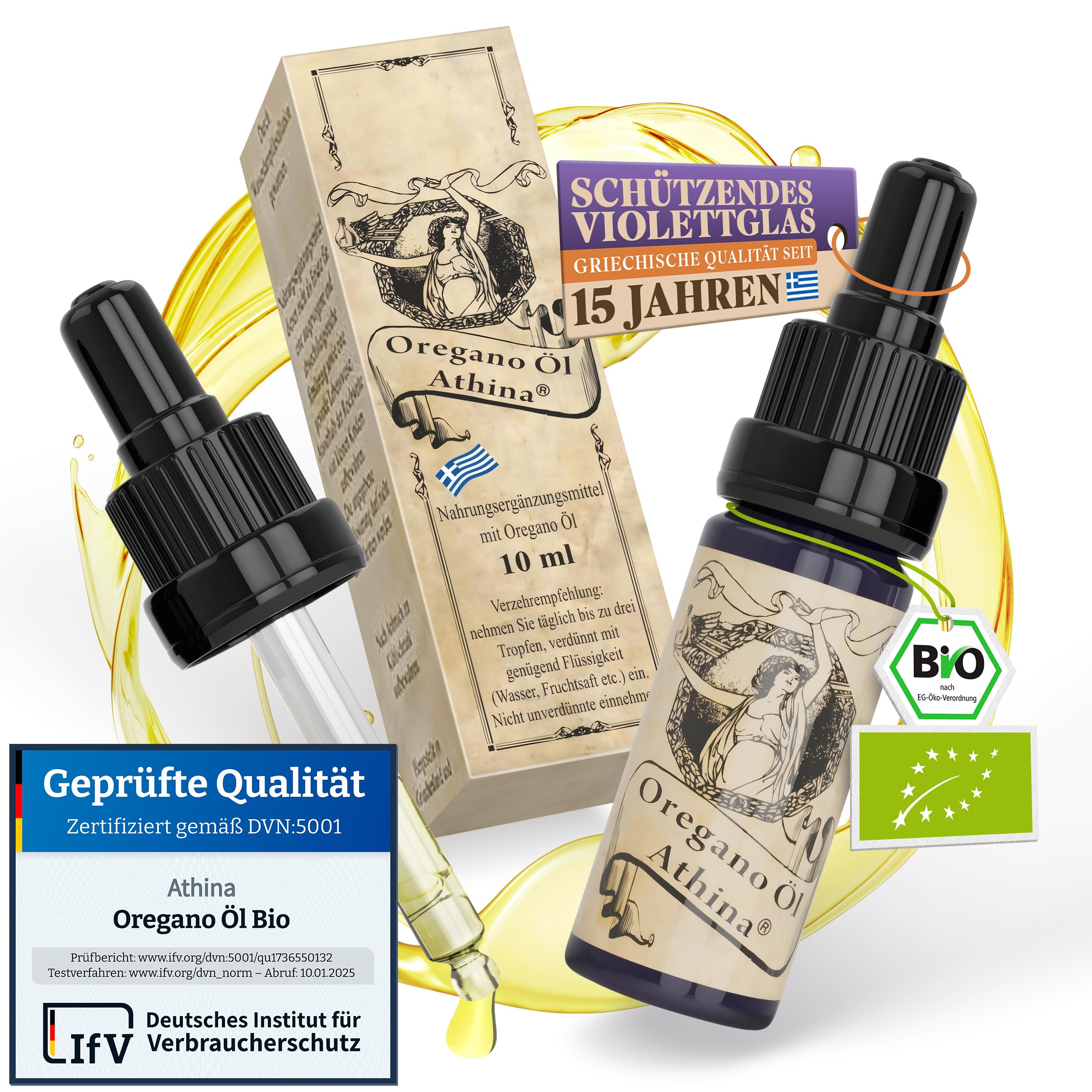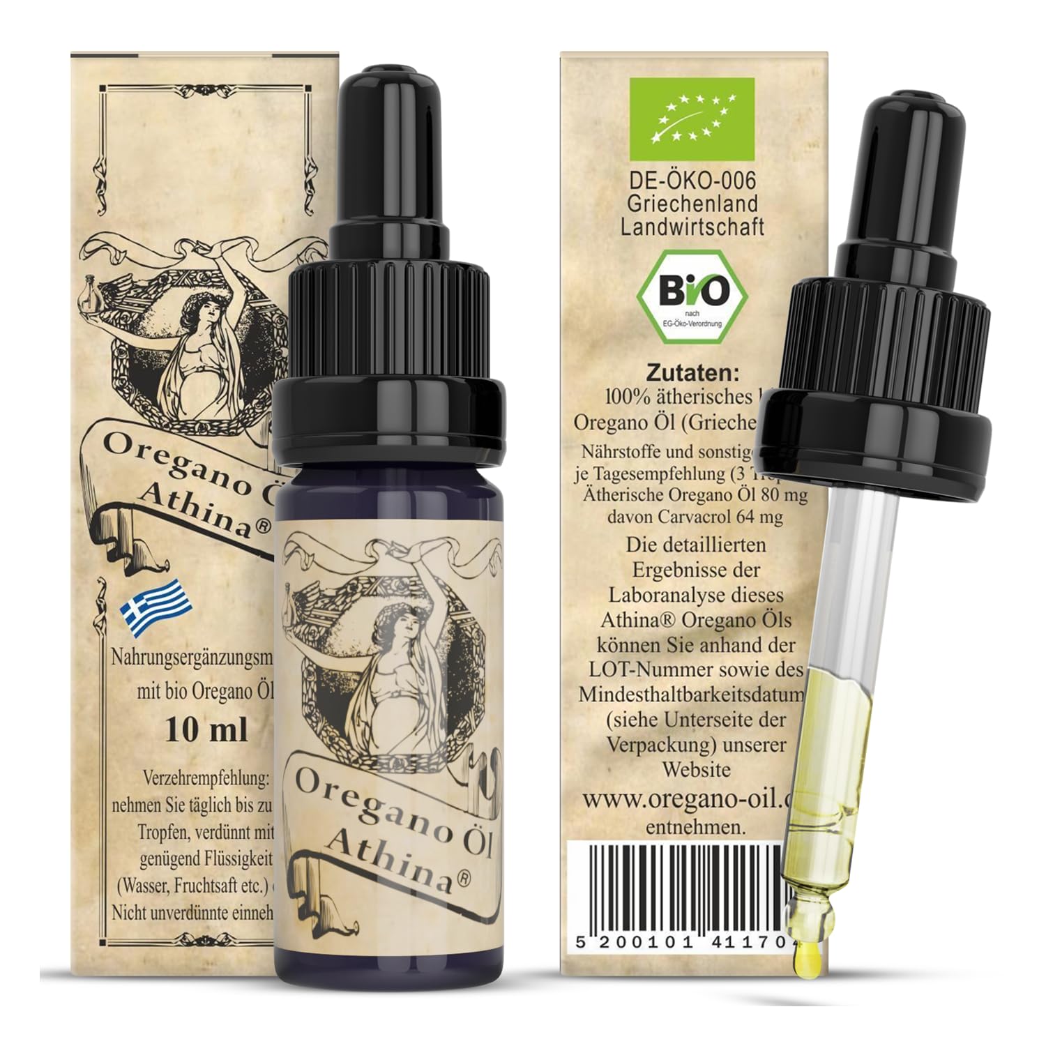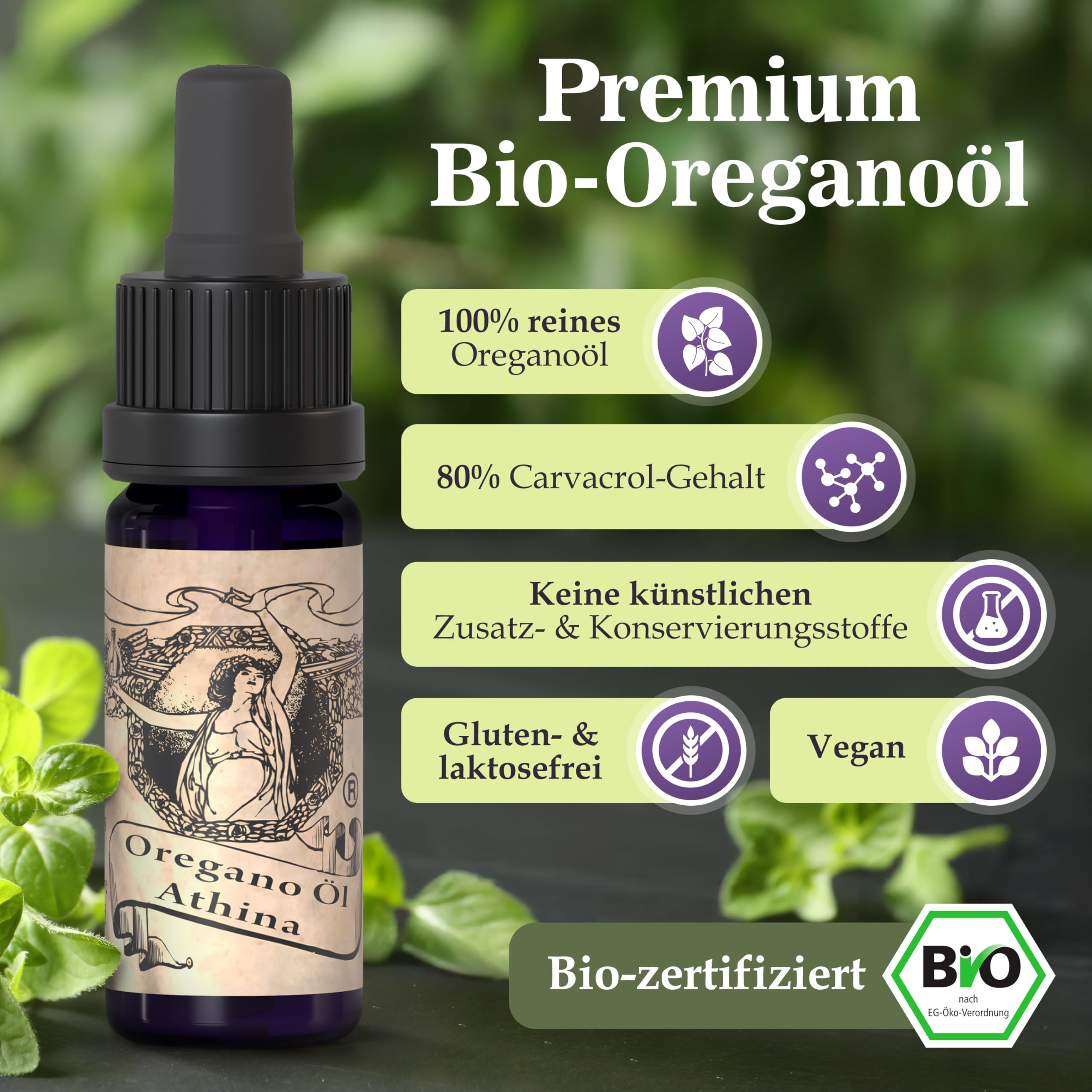 Athina® Oregano Öl Bio DE-ÖKO-006 I 1 x 10 ml ätherisches Oreganoöl I Origanum vulgare hirtum aus Nordgriechenland I 80% Carvacrol I Oreganoöl Bio Tropfen