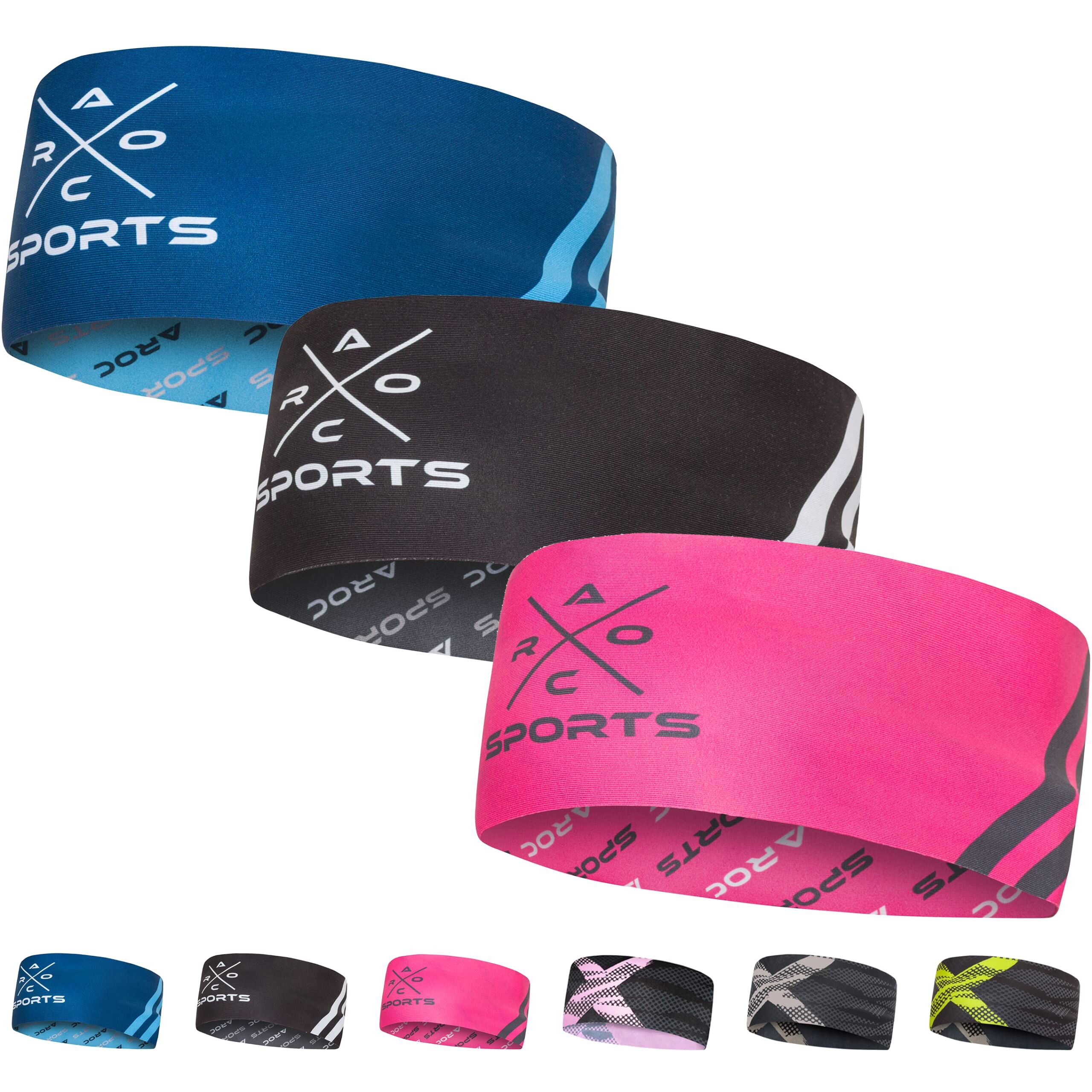 3er Set atmungsaktives Sport Stirnband Damen & Herren - schnelltrocknendes Kopfband zum Wenden - elastisches Haarband, Schweißband Stirn (blau, schwarz, pink)