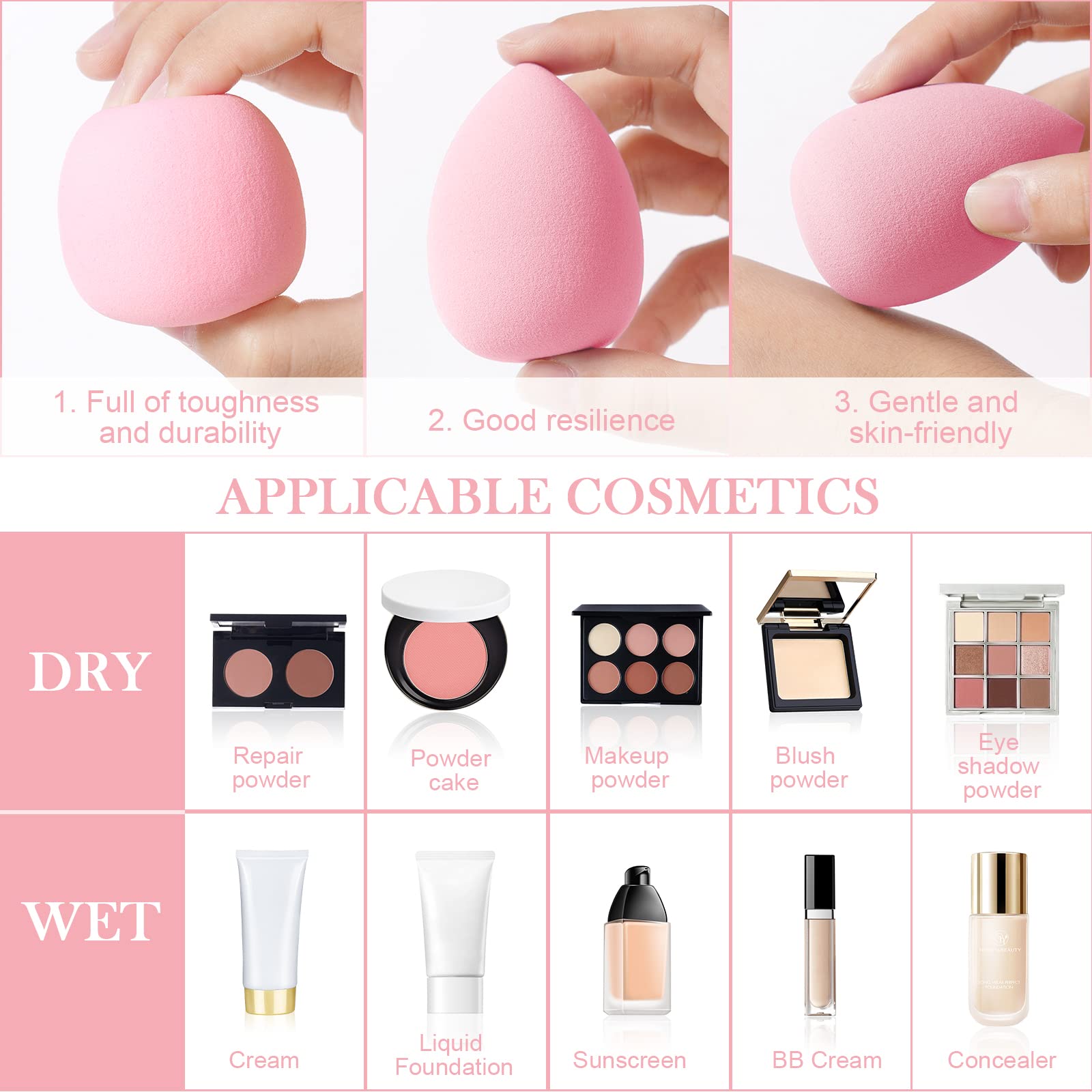 Die Make-up-Schwaemme bestehen aus hochwertigem hydrophilem Polyurethan und sind vollstaendig latexfrei. Das Material ist weich, elastisch und besonders hautfreundlich. Es ist nicht reizend und eignet sich auch fuer empfindliche Haut. Nach dem Einweichen in Wasser nehmen die Schwaemme ihre urspruengliche Form wieder an und sorgen fuer optimale Elastizitaet beim Auftragen.