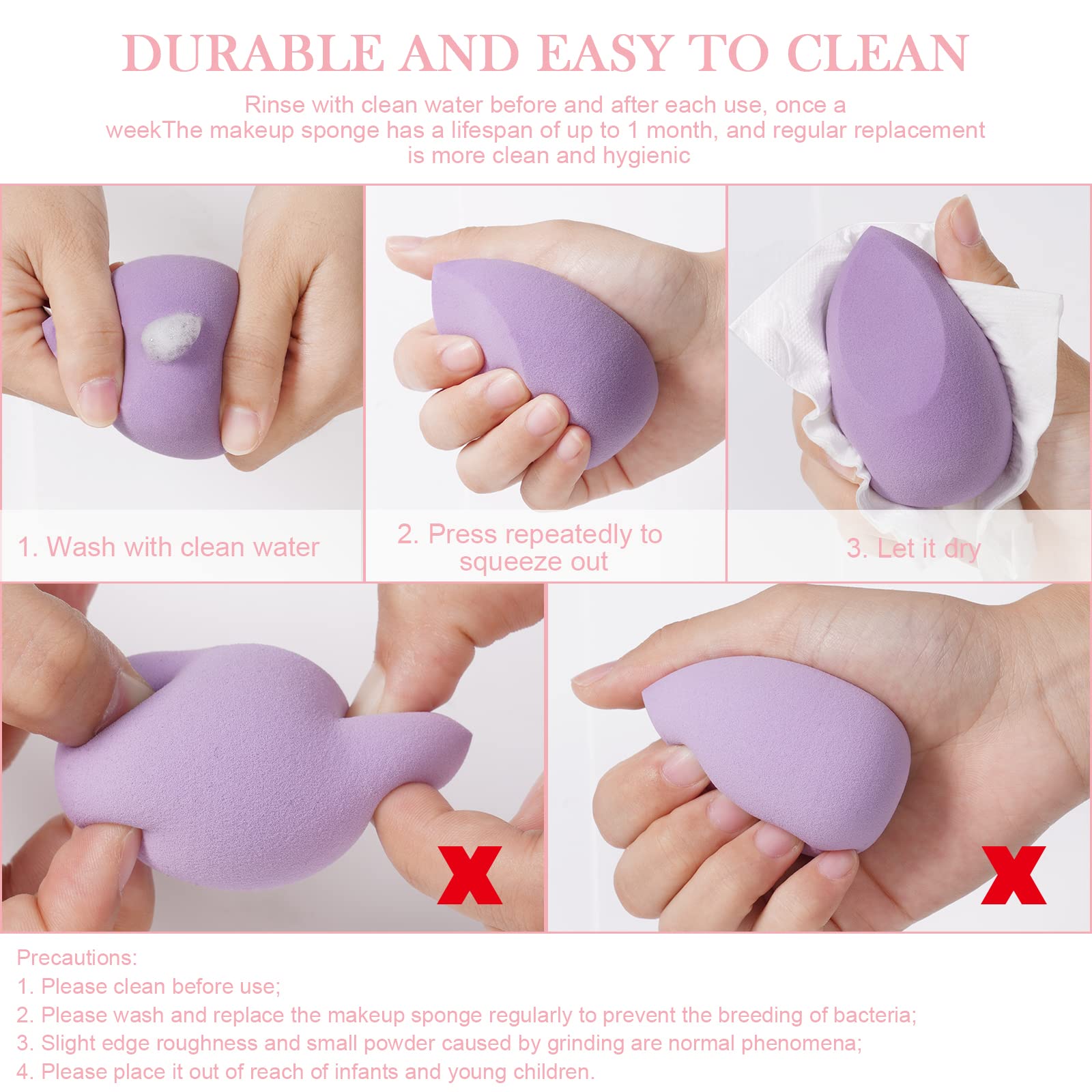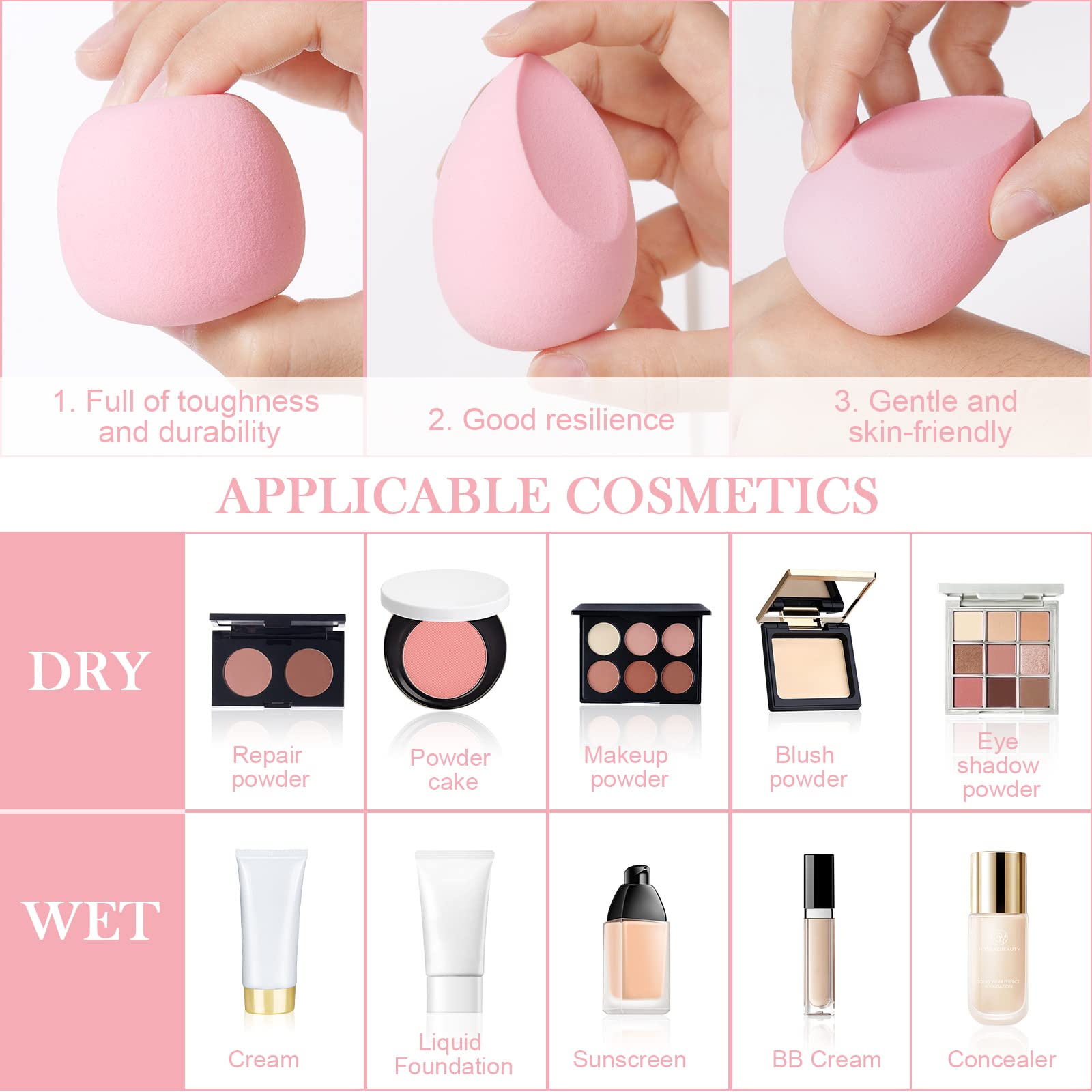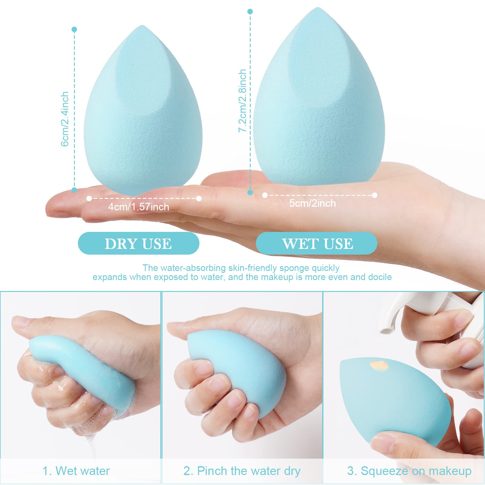 Die Make-up-Schwaemme bestehen aus hochwertigem hydrophilem Polyurethan und sind vollstaendig latexfrei. Sie sind weich, elastisch und besonders hautfreundlich. Das Material ist nicht reizend und eignet sich auch fuer empfindliche Haut. Nach dem Einweichen in Wasser nehmen die Schwaemme ihre urspruengliche Form wieder an und bieten optimale Elastizitaet.