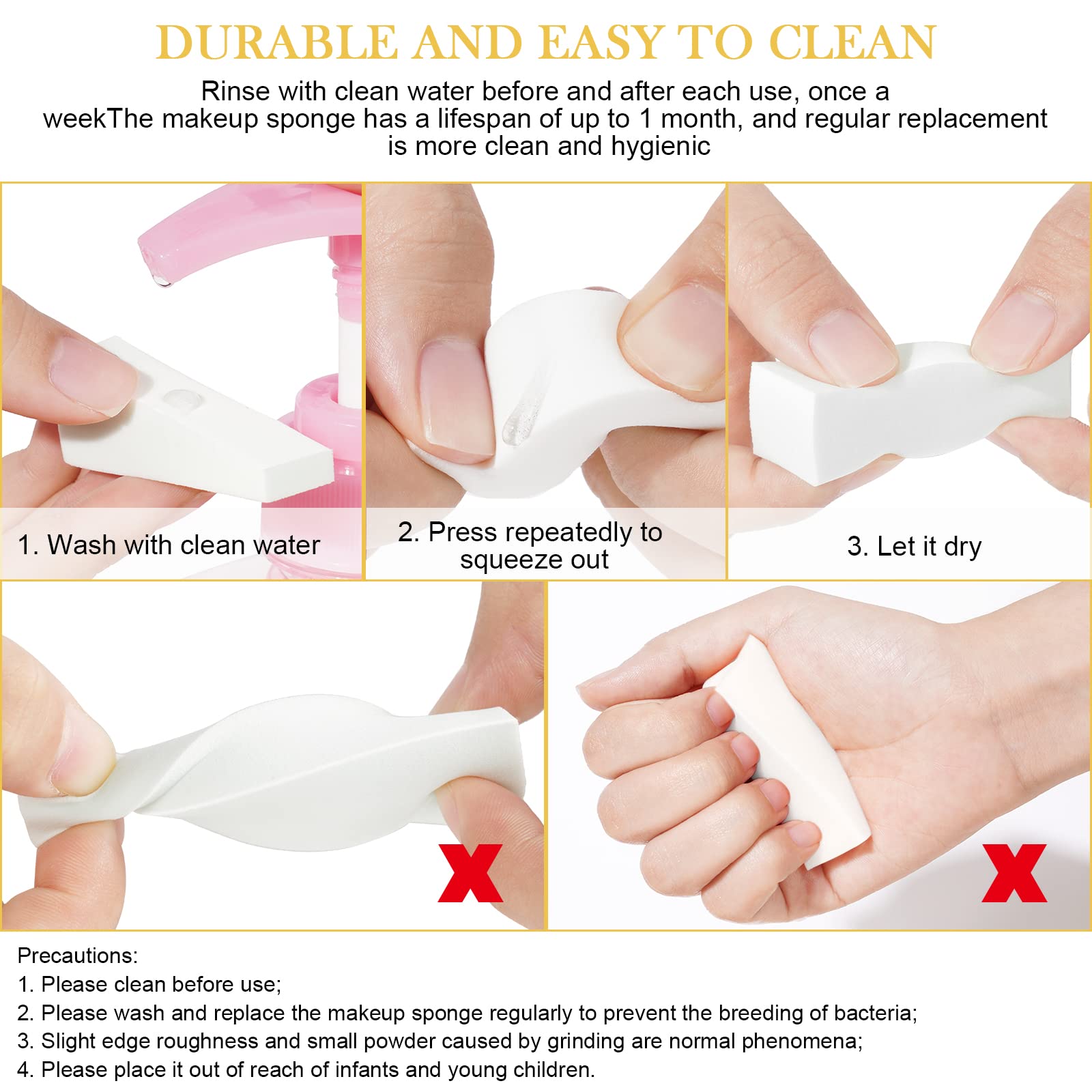 Alle Make-up-Schwaemme bestehen aus hochwertigem hydrophilem Polyurethan und sind vollstaendig latexfrei. Das Material ist weich, elastisch und besonders hautfreundlich. Es ist nicht reizend und eignet sich auch fuer empfindliche Haut. Nach dem Einweichen in Wasser nehmen die Schwaemme ihre urspruengliche Form wieder an und bieten optimale Elastizitaet.