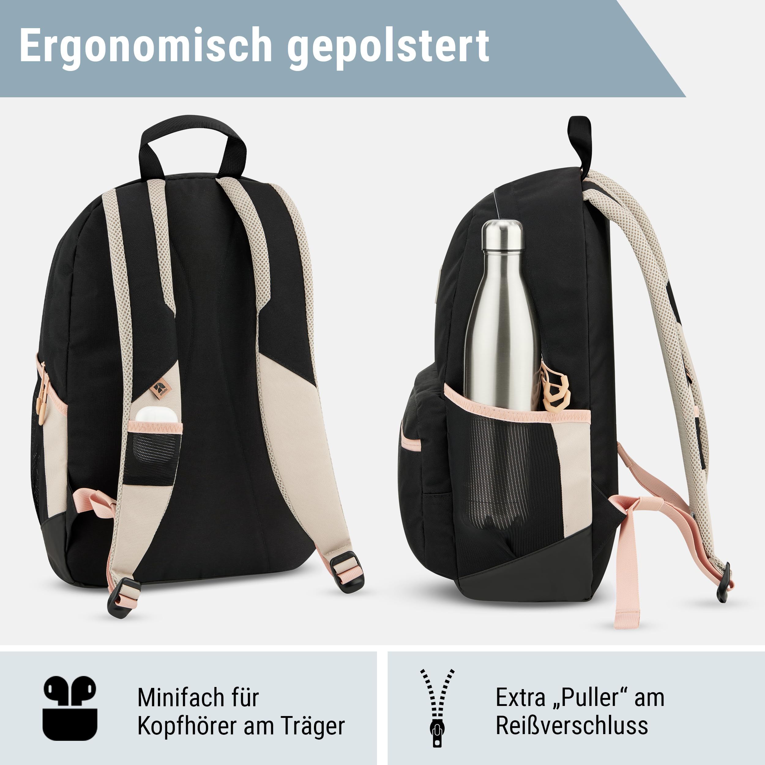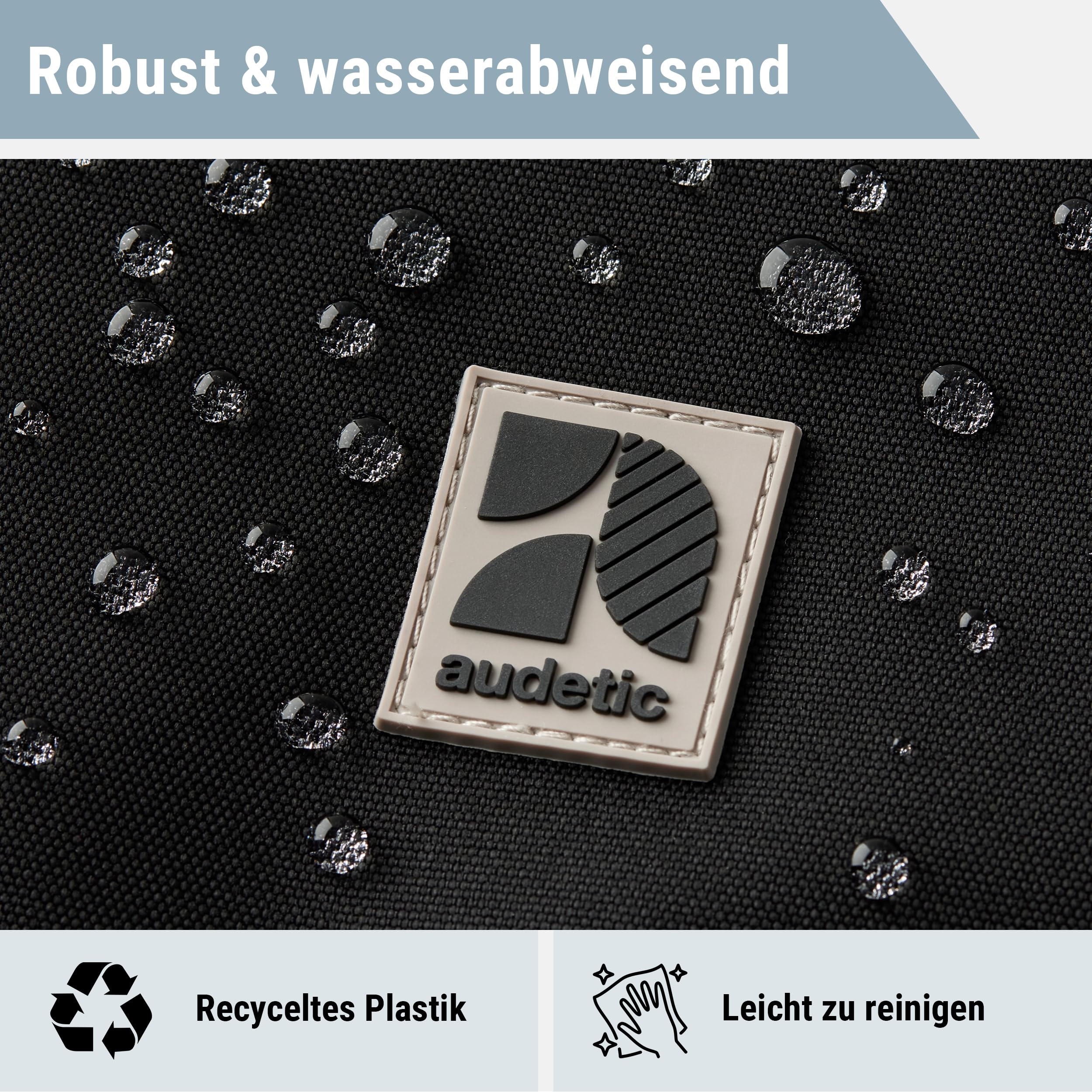 Audetic Schulrucksäcke für Mädchen & JungenWir sind Audetic. Authentisch. Technisch. Cool. Ergonomische Rucksäcke für die Schule oder Freizeit. Designed in Hamburg, Germany. Der Audetic „Flex“ Schulrucksack verbindet hohe Funktionalität mit stylischem Design. Unser Anspruch war es einen Rucksack für die besonderen Bedürfnisse von Mädchen und Jungen zu entwickeln. Das heisst: Moderne Raumaufteilung mit Notebook und Smartphone-Fach, Clip im Rucksackinneren für den Schlüssel und elastische Aussenfächer. Besonderes Highlight ist die kleine Tasche am Schulterträger, in der Kopfhörer griffbereit Platz finden. Dazu hochwertige Materialien aus recycelten PET-Flaschen, die Schmutz, Regen und Hitze Widerstand leisten. Selbstverständlich hat der Rucksack eine Polsterung am Rücken und weiche, atmungsaktive Träger. Der Reissverschluss zum Hauptfach wird durch einen Regenschutz abgedeckt. Die Träger können durch ein Loop-Ende ganz einfach in der Länge verstellt werden.HighlightsStylisches & modernes Design