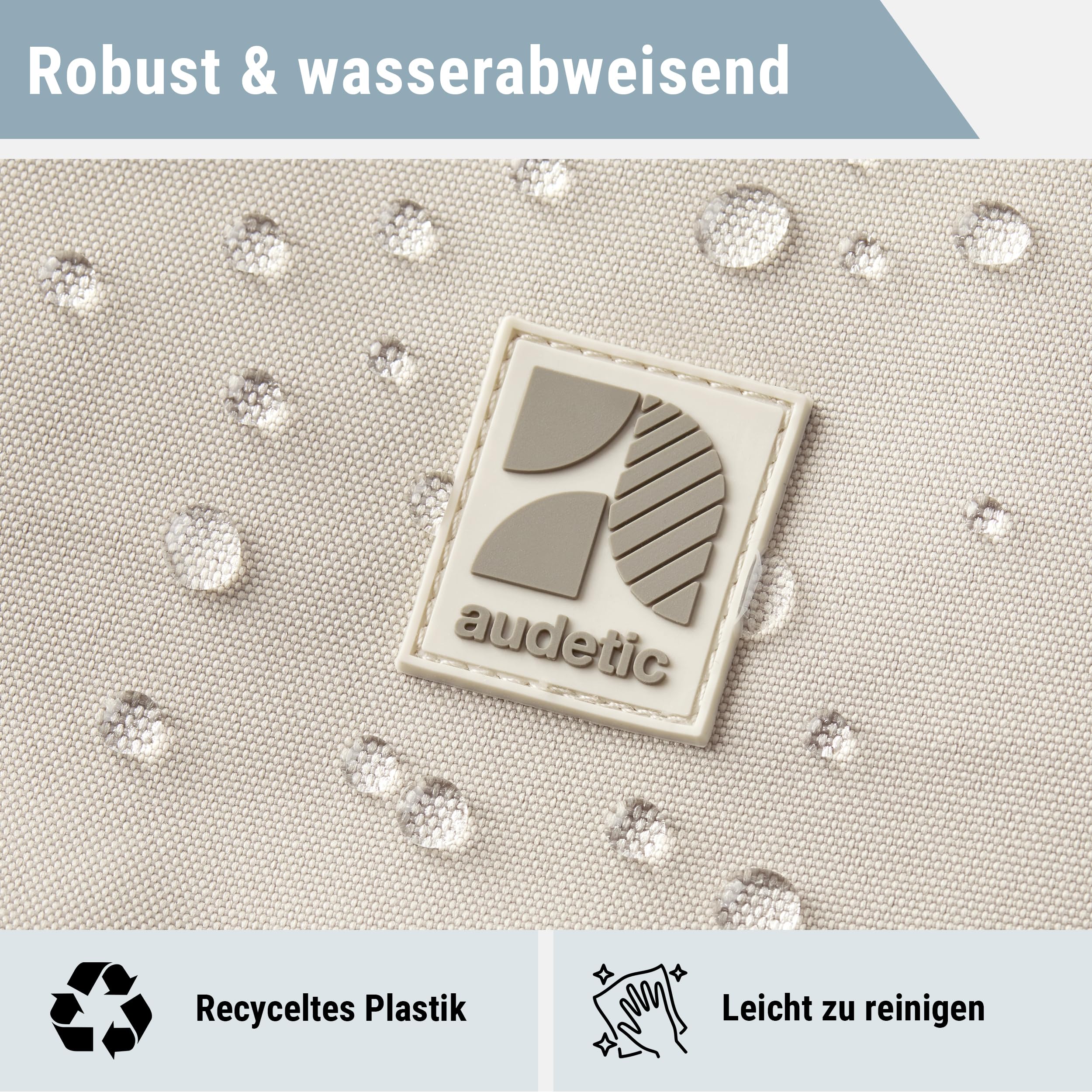 Audetic Schulrucksäcke für Mädchen & JungenWir sind Audetic. Authentisch. Technisch. Cool. Ergonomische Rucksäcke für die Schule oder Freizeit. Designed in Hamburg, Germany. Der Audetic „Flex“ Schulrucksack verbindet hohe Funktionalität mit stylischem Design. Unser Anspruch war es einen Rucksack für die besonderen Bedürfnisse von Mädchen und Jungen zu entwickeln. Das heisst: Moderne Raumaufteilung mit Notebook und Smartphone-Fach, Clip im Rucksackinneren für den Schlüssel und elastische Aussenfächer. Besonderes Highlight ist die kleine Tasche am Schulterträger, in der Kopfhörer griffbereit Platz finden. Dazu hochwertige Materialien aus recycelten PET-Flaschen, die Schmutz, Regen und Hitze Widerstand leisten. Selbstverständlich hat der Rucksack eine Polsterung am Rücken und weiche, atmungsaktive Träger. Der Reissverschluss zum Hauptfach wird durch einen Regenschutz abgedeckt. Die Träger können durch ein Loop-Ende ganz einfach in der Länge verstellt werden.HighlightsStylisches & modernes Design