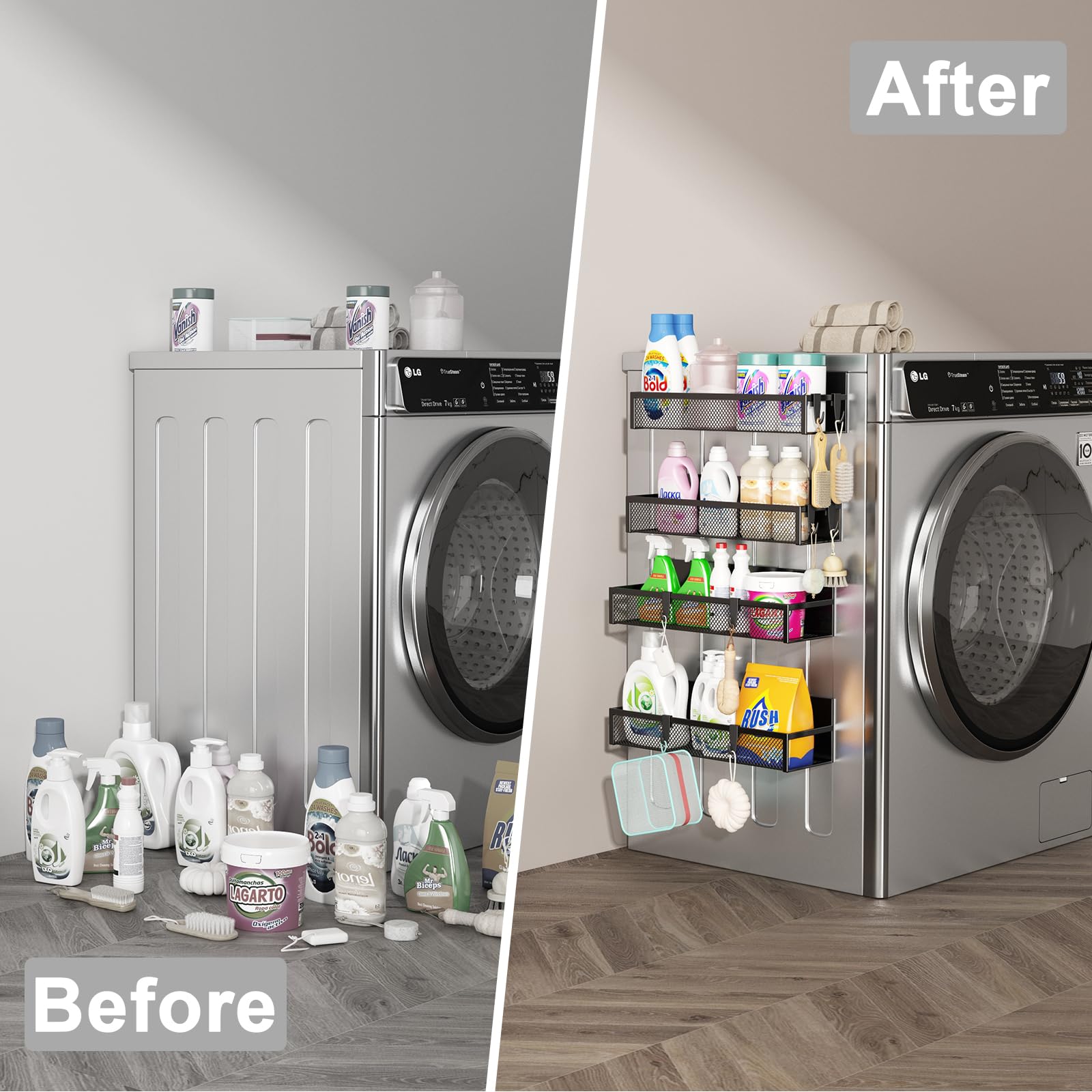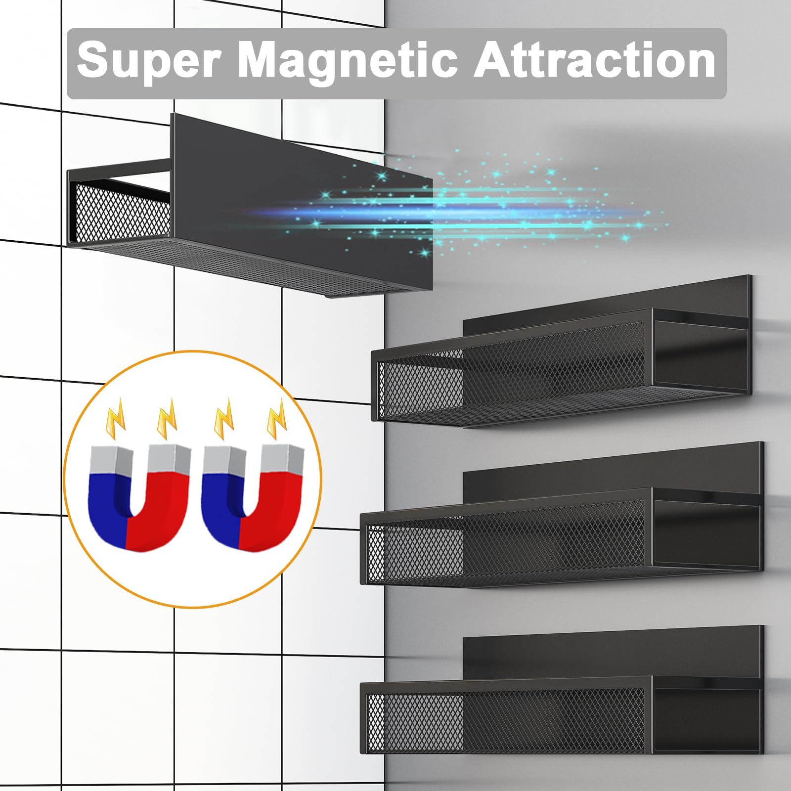AUFWORLD Magnet-Gewürzregal für Kühlschrank – bohrfrei & platzsparend4 x Magnetregal (schwarz) 1 x Hakenleiste mit 8 festen Haken 8 x einzeln bewegbare Zusatz-HakenEine sofort startbereite Organisationslösung – montagefrei! Starke Magnete für maximalen Halt & hohe TragkraftDie verbauten verbreiterten Hochleistungsmagnete gewährleisten einen extrem sicheren Halt an allen magnetischen Oberflächen. Jedes Regal ist für den täglichen Gebrauch konzipiert – stabil, zuverlässig und rutschfest.Durchdachtes Design für Sicherheit & VielseitigkeitErhöhte Seitenränder verhindern ein versehentliches Herunterfallen von Gegenständen.Belüfteter Gitterboden in den Regalen sorgt für Luftzirkulation und beugt Feuchtigkeit vor.Flexible Zusatz-Haken lassen sich nach Bedarf an der Seitenleiste anbringen und versetzen.Einfache Installation – in Sekunden fertigKein Werkzeug, kein Bohren, kein Kleben. Platzieren Sie die Regale einfach an der gewünschten Position auf einer magnetischen Fläche – und schon ist Ihr persönliches Ordnungssystem einsatzbereit. Die starke Magnetkraft hält sicher, auch bei voller Belastung.Viel mehr als nur ein Gewürzregal – nutzen Sie es überall!Die Möglichkeiten dieses magnetischen Organizers gehen weit über die Küche hinaus:Im Haushalt: An Waschmaschine oder Trockner für Waschmittel, Weichspüler und Pflegeutensilien.Im Home-Office oder Kinderzimmer: An Whiteboards oder Stahlwänden als Ordnungshelfer für Stifte, Scheren, Kleber und Notizen.In der Werkstatt oder Garage: An Werkzeugwänden oder Maschinen für Schrauben, Bits und kleine Teile.Im Bad: Als platzsparender Aufbewahrer für Zahnbürsten, Cremes und Kosmetikartikel an geeigneten Flächen.Für wen ist dieses Set ideal?Besitzer kleiner Küchen mit begrenzter Lagerfläche.Alle, die ohne Bohren und Aufwand mehr Ordnung schaffen möchten.Vielseitige Nutzer, die ein flexibles System für Küche, Haushalt, Büro oder Hobby suchen.