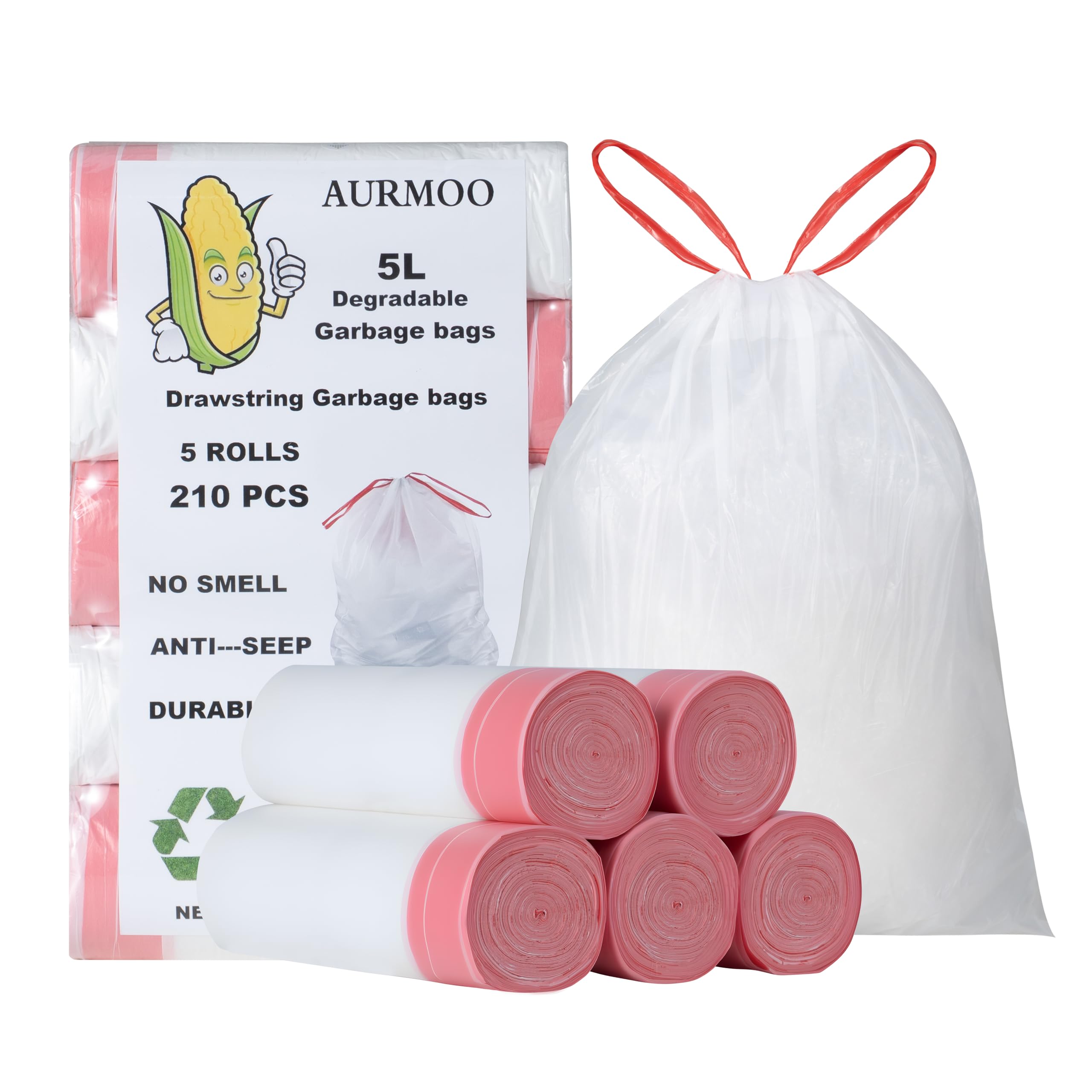 AURMOO Reissfest Müllbeutel 5L mit Zugband, Abbaubar Biomüllbeutel, 210 Stück, Tropfsichere Mülltüten mit Zugband, Reissfeste Müllsäcke für Mülleimer, B32XH35cm, Weiss