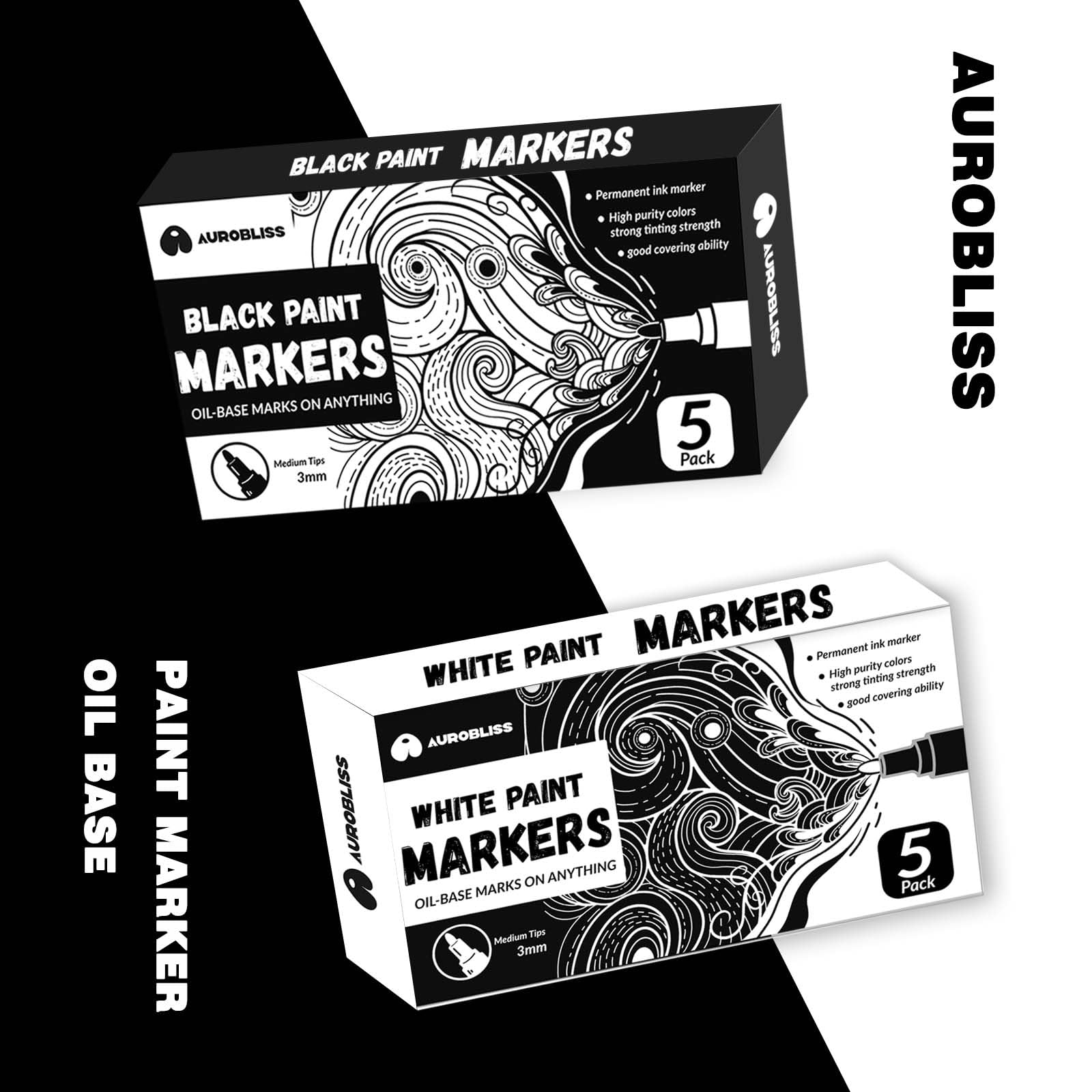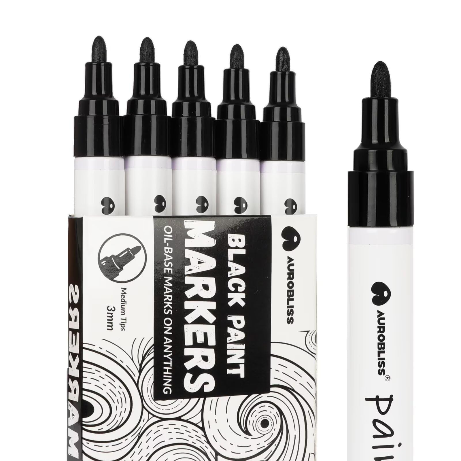 Aurobliss Lackmarker Schwarz 5 Stück, Lackstift Wasserfeste Stifte für Holz, Steine, Schiefer, Gummi, Metall, Glas, Plastik, Textilien Permanent Marker Schwarz Dicke Spitze