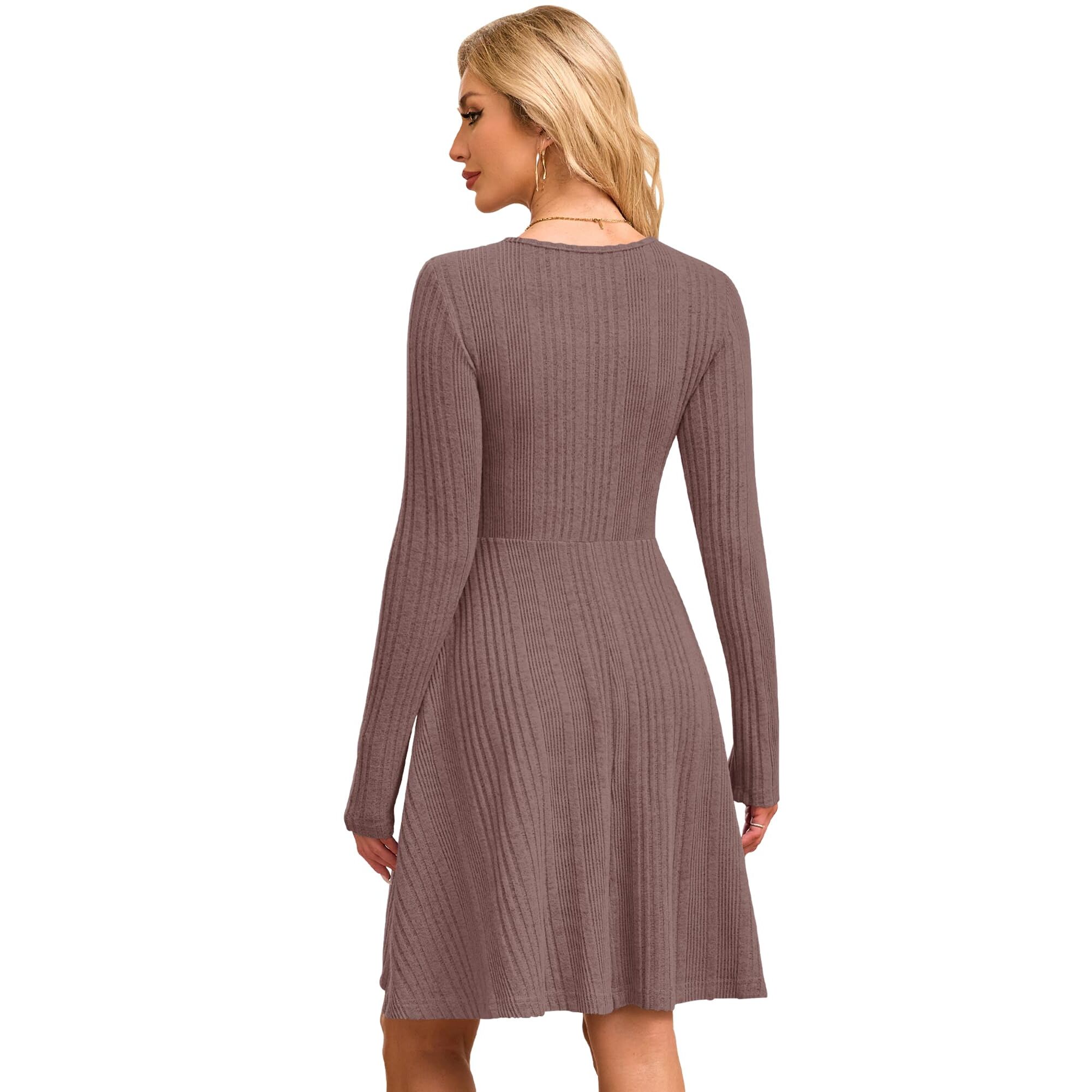 AUSELILY Langarm Winter Kleid Damen Gestrickt Rundhalsausschnitt Pullover Kleid mit Taschen