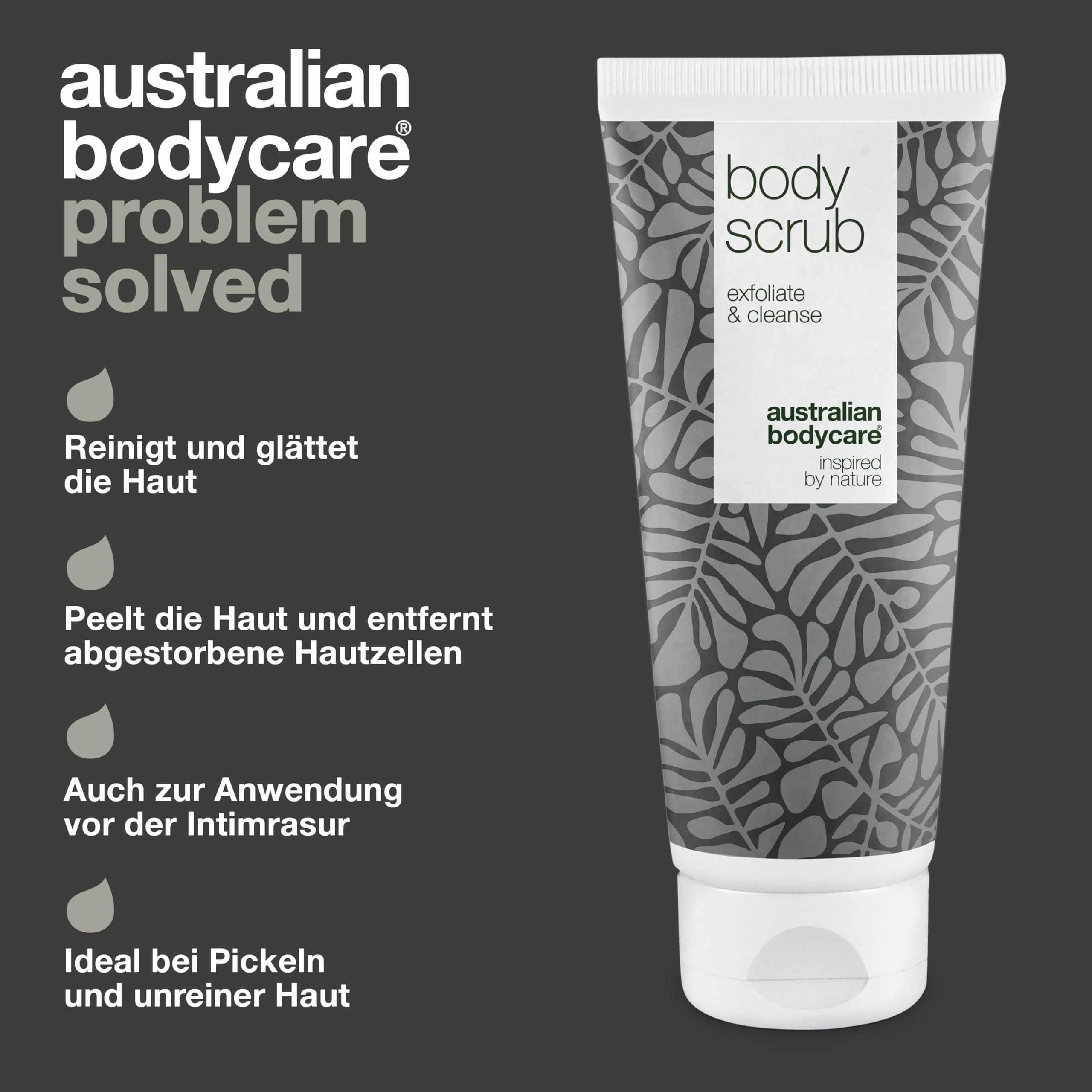 Australian Bodycare Body Scrub 200ml – Körperpeeling bei Pickeln, Unreiner Haut, Eingewachsenen Haaren, Reibeisenhaut, Erdbeerbeinen, Mit Teebaumöl, 100% Vegan