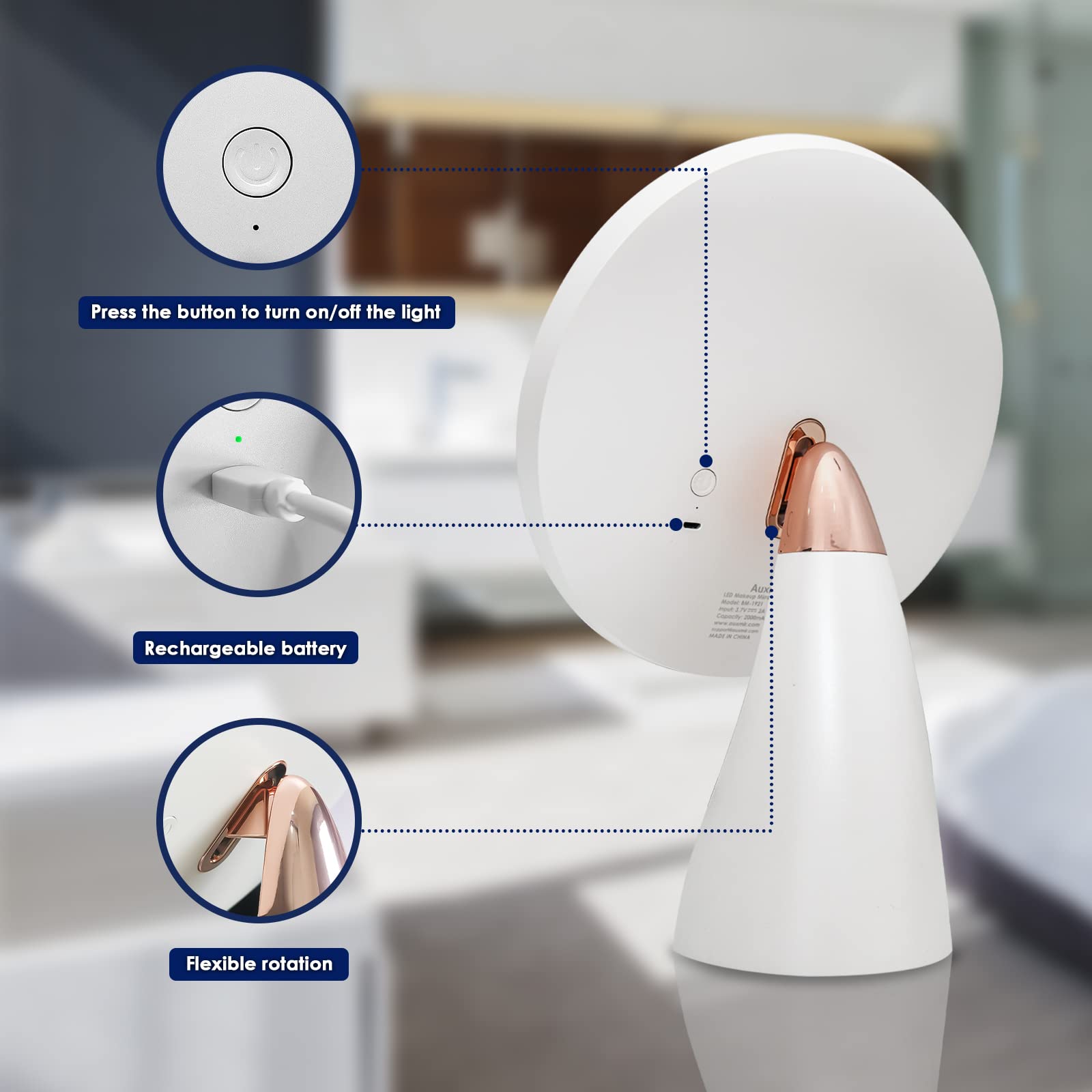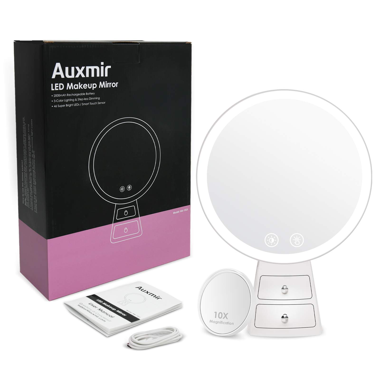 Auxmir Kosmetikspiegel LED Beleuchtet mit 3 Lichtfarben und Dimmbarer Helligkeit, Touchschalter, USB Aufladbar, Premium Schminkspiegel mit 2 Schubladen für Schminken Rasieren und Gesichtspflege