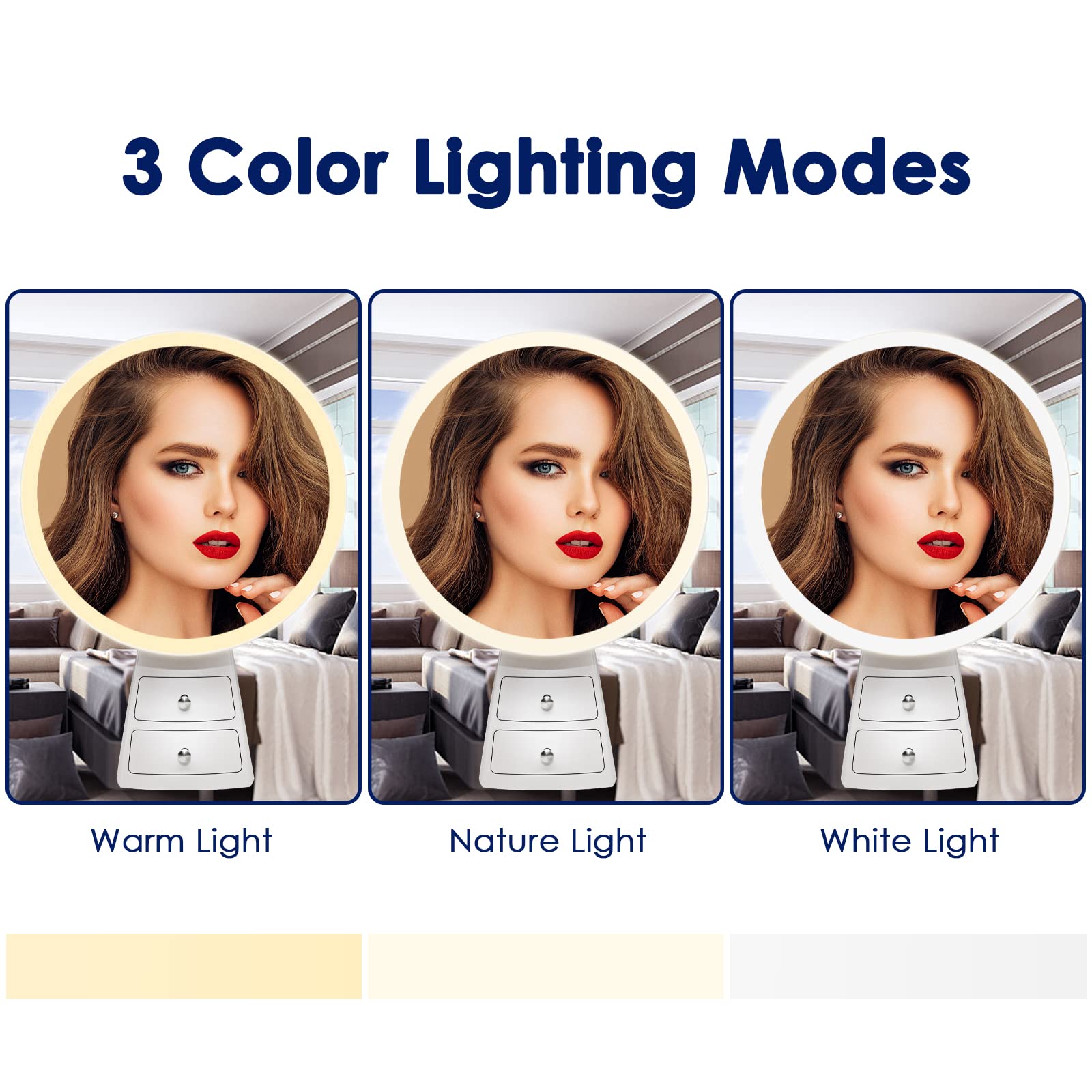 Auxmir LED-Schminkspiegel Wenn Sie auf der Suche nach einem Schminkspiegel sind, was mit Delucs mit LEDo die Vergrösserungsfunktion? Sie dürfen diese fantastische Gelegenheit also nicht verpassen! 2 Vergrösserungsstufen: Dieser grosse Spiegel ist 1-fach normal und ein kleiner runder Spiegel mit 10-facher Vergrösserung im Lieferumfang enthalten. Sie können es auf dem grossen Spiegel installieren oder selbst verwenden! Perfekte Beleuchtung: Wenn Ihre Make-up-Umgebung nicht gut ist, wird unser Spiegel Ihre Probleme lösen, verstellbare Lichter und Farbwechsel erhellen Ihr Gesicht! Mit LED-Make-up-Spiegel, können Sie einfach Make-up auftragen, Kontaktlinsen tragen, Akne beseitigen, Ihre Haut jeden Tag pflegen! Gleichmässige Beleuchtung: Es gibt 46 hochwertige helle LED-Leuchten um den Kosmetikspiegel, die ein gleichmässiges und stabiles Licht abgeben, ohne die Augen zu verletzen. Besonderheiten: 2 Schubladen zur Aufbewahrung von kleinem Zubehör; runder Spiegel mit 10-facher Vergrösserung; schaltet sich automatisch nach 30 Minuten aus; aufladbar über USB-Kabel. 2 Touch-Tasten: Die linke Touch-Taste dient zum Ändern der Lichtfarbe und die rechte Touch-Taste dient zum Einstellen der Helligkeit. Dieses Design erleichtert die Verwendung. Was Sie bekommen: 1 x Auxmir LED-Schminkspiegel. 1 x kleiner 10-facher Spiegel. 1 x USB-Kabel. 1 x Bedienungsanleitung