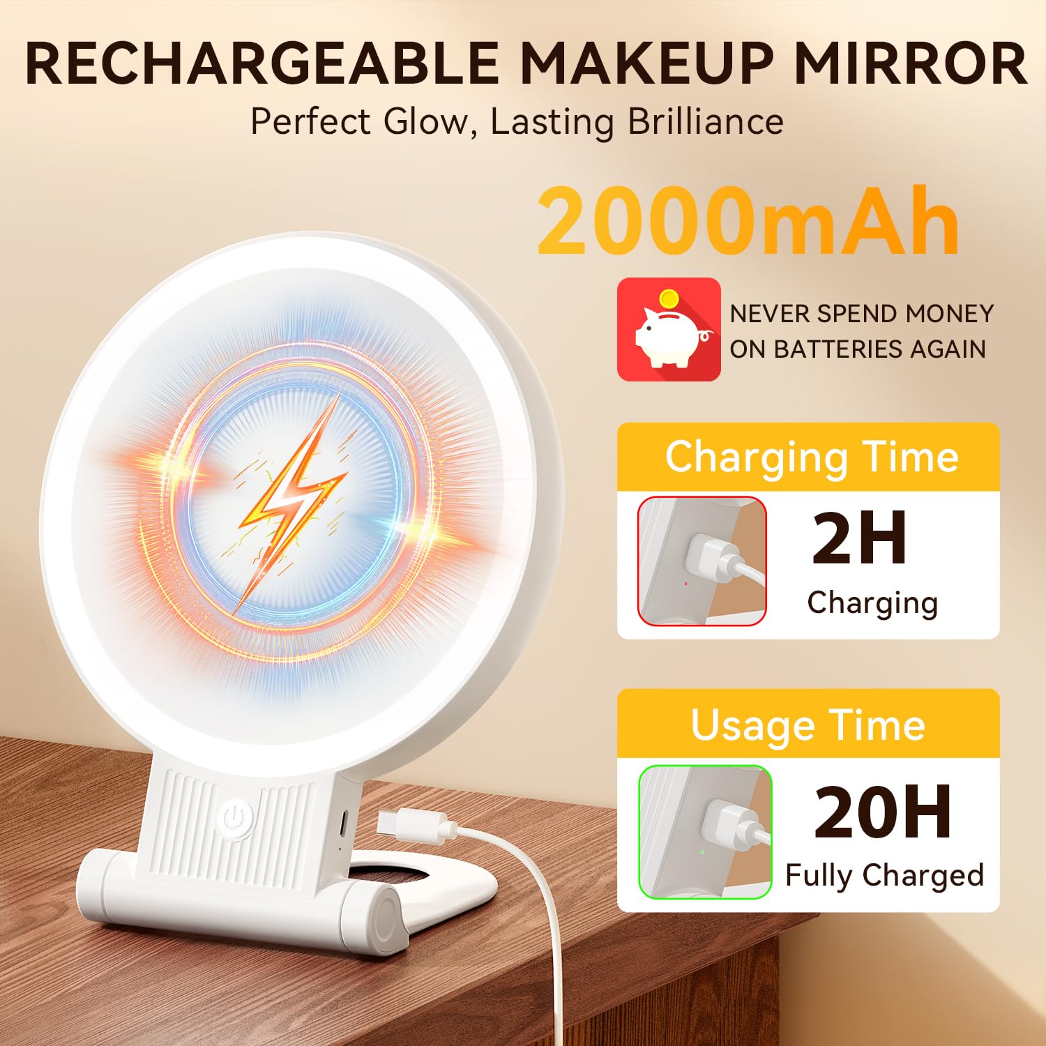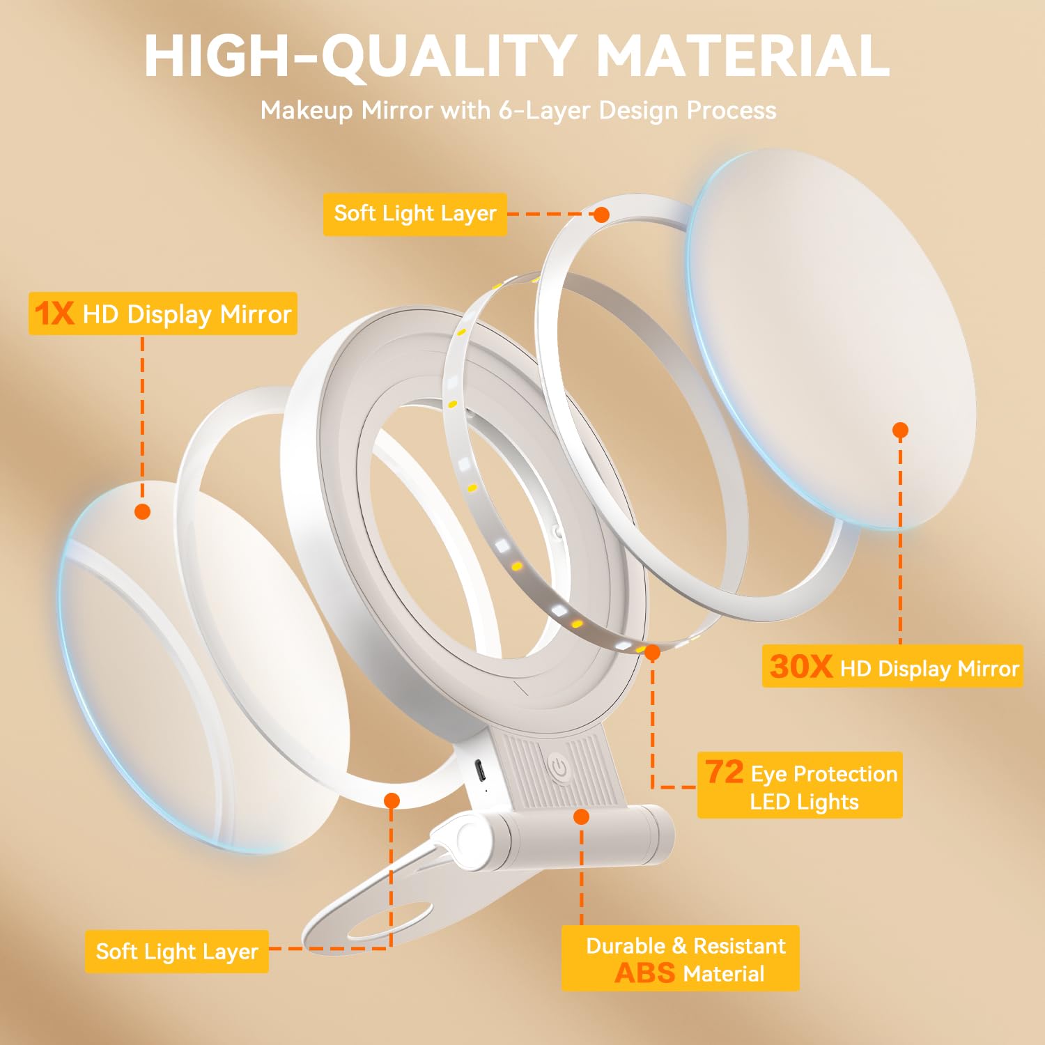 Auxmir Kosmetikspiegel mit Beleuchtung, 30X/1X Doppelseitig Schminkspiegel mit Licht, Dimmbar Tischspiegel, 3 Farblichter Handspiegel, 2000 mAh, Faltbar Vergrösserungsspiegel für Zuhause Reise Kosmetik