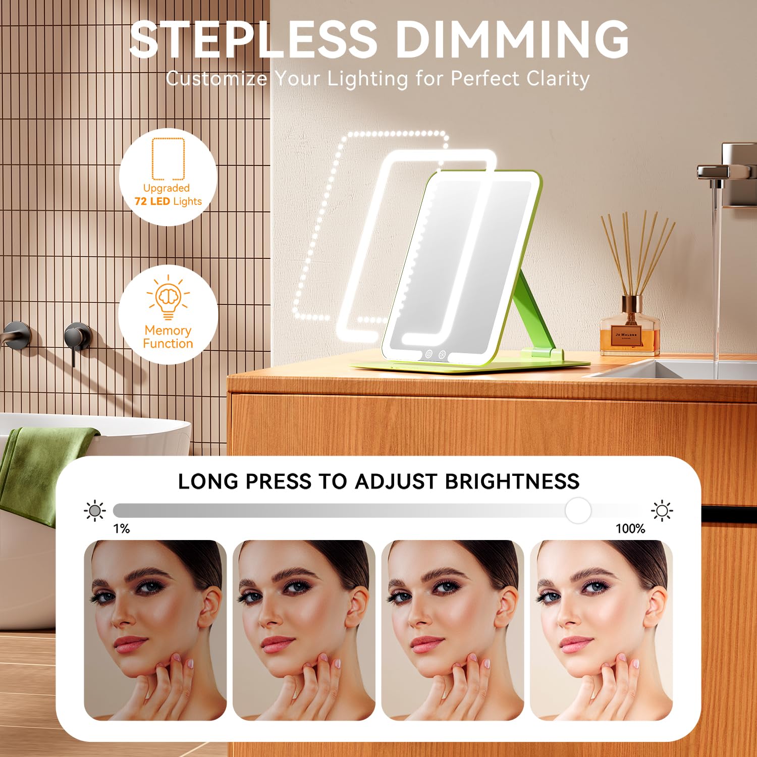 Geeignet für Make-up, Hautpflege, Rasur, Augenbrauenstyling oder das Einsetzen von Kontaktlinsen. Die gleichmässige LED-Ausleuchtung sorgt für klare Sicht und präzise Ergebnisse.