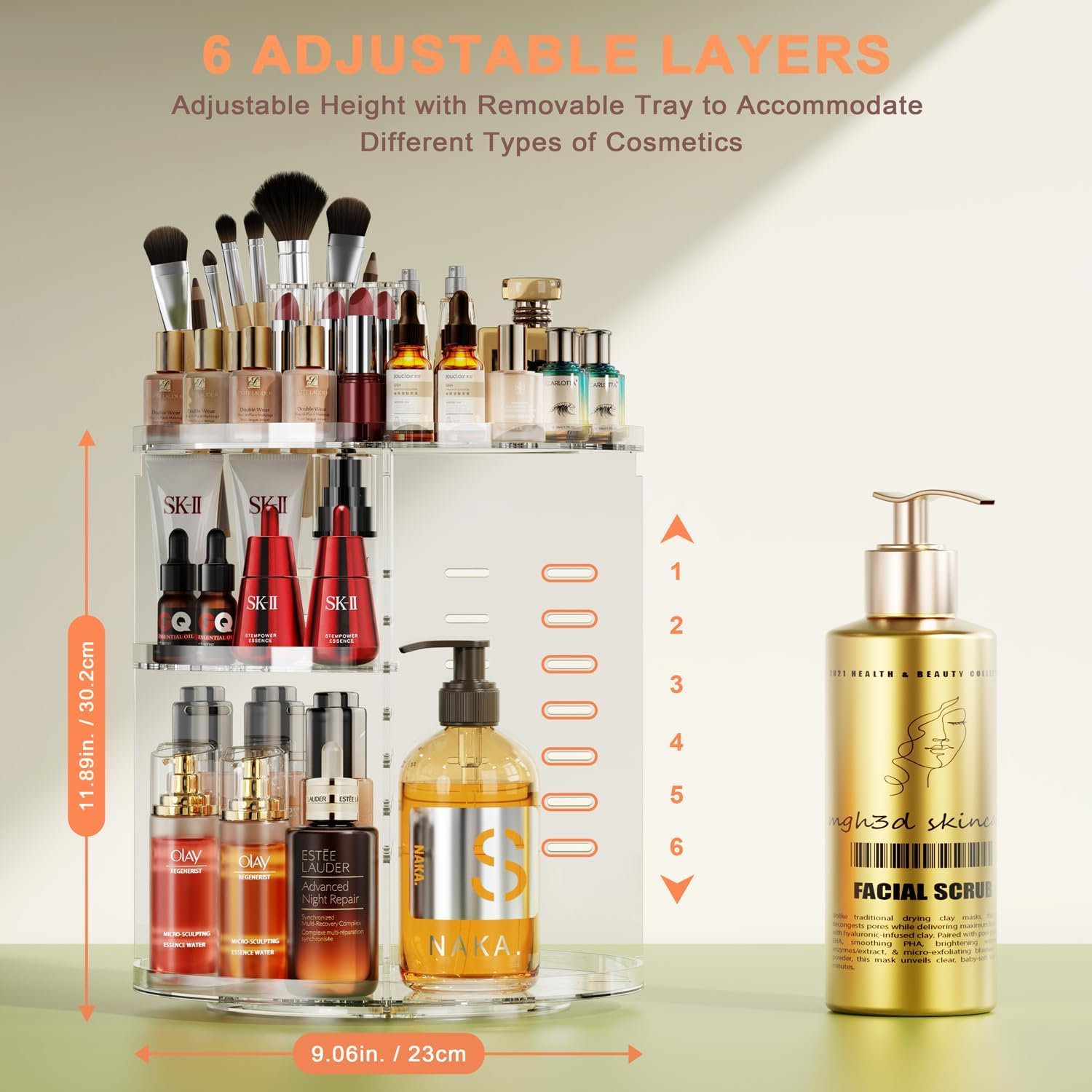 Durch die 360-Grad-Drehung lassen sich Lippenstifte, Make-up Pinsel, Eyeliner, Nagelgel und weitere Kosmetikartikel jederzeit bequem erreichen. Ein sanftes Drehen genuegt, um alle Produkte uebersichtlich im Blick zu behalten, was die taegliche Schmink- und Pflegeroutine deutlich erleichtert.