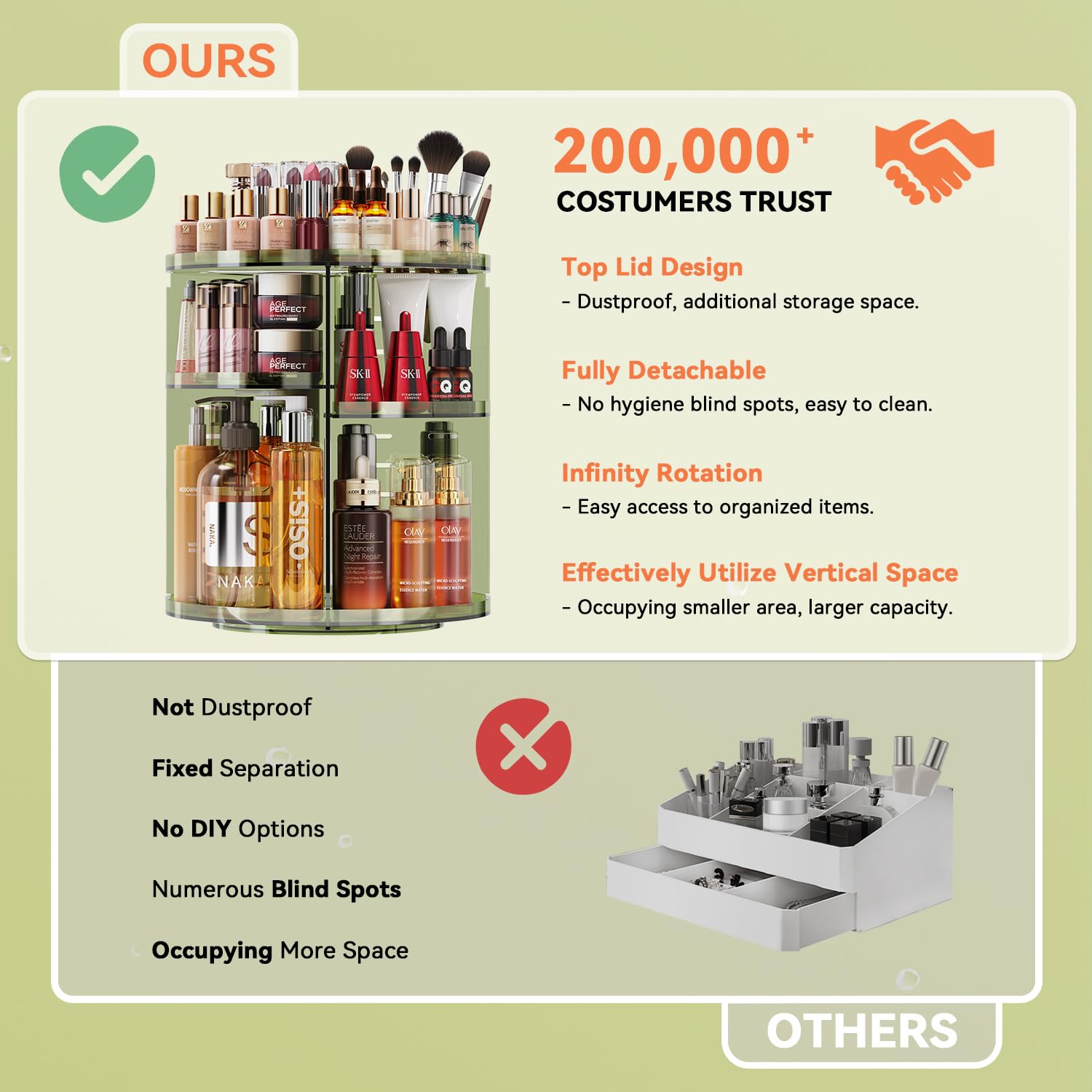 Der extra grosse Stauraum sorgt fuer eine uebersichtliche Organisation und ausreichend Platz fuer Make-up, Pflegeprodukte und Accessoires. Dadurch wird die taegliche Beauty- und Skincare Routine deutlich effizienter und angenehmer. Der Organizer eignet sich ideal fuer den Einsatz im Schlafzimmer, Badezimmer oder auf dem Schminktisch.