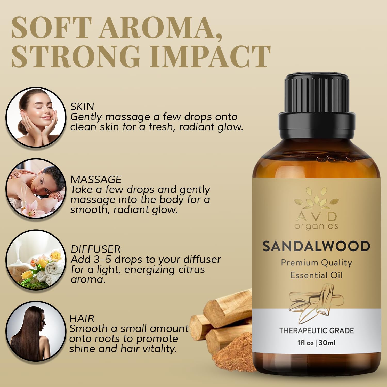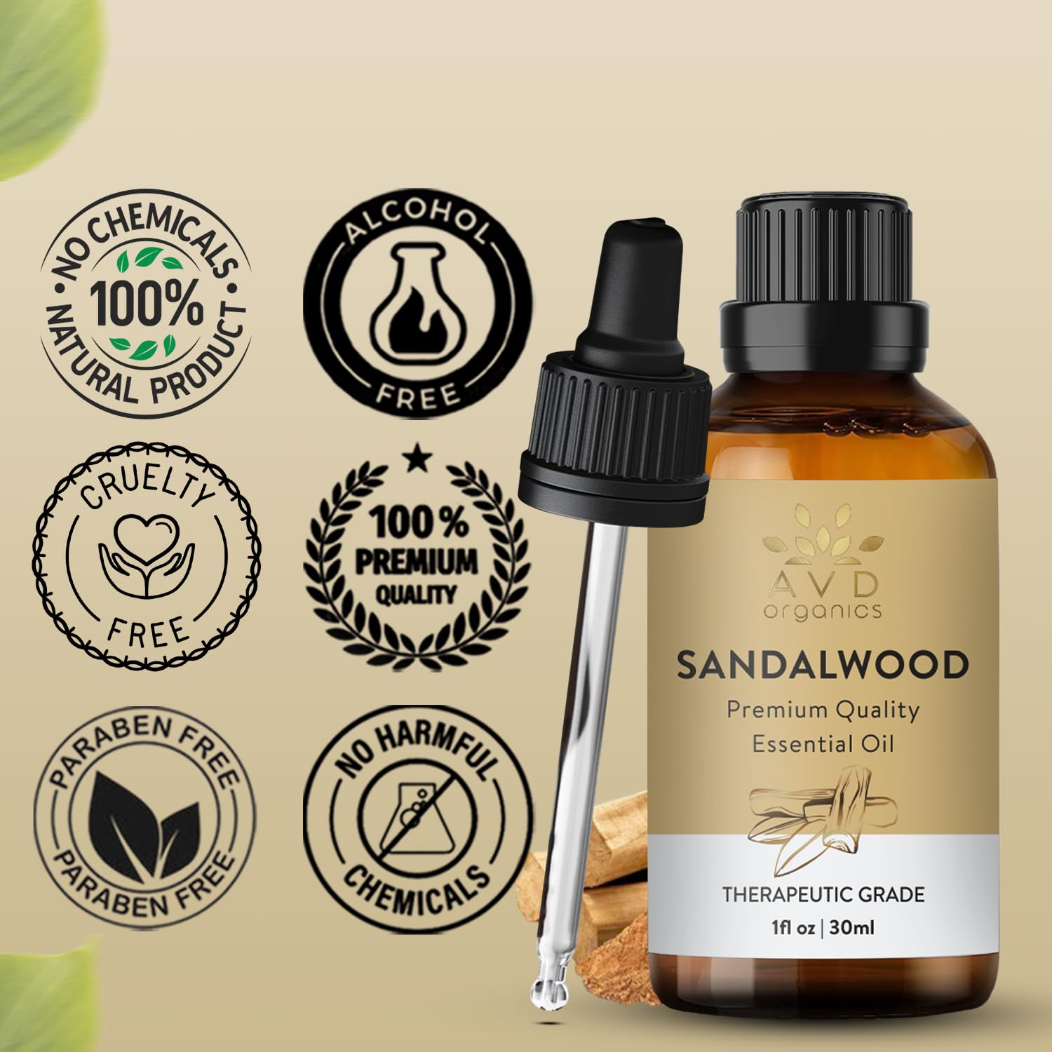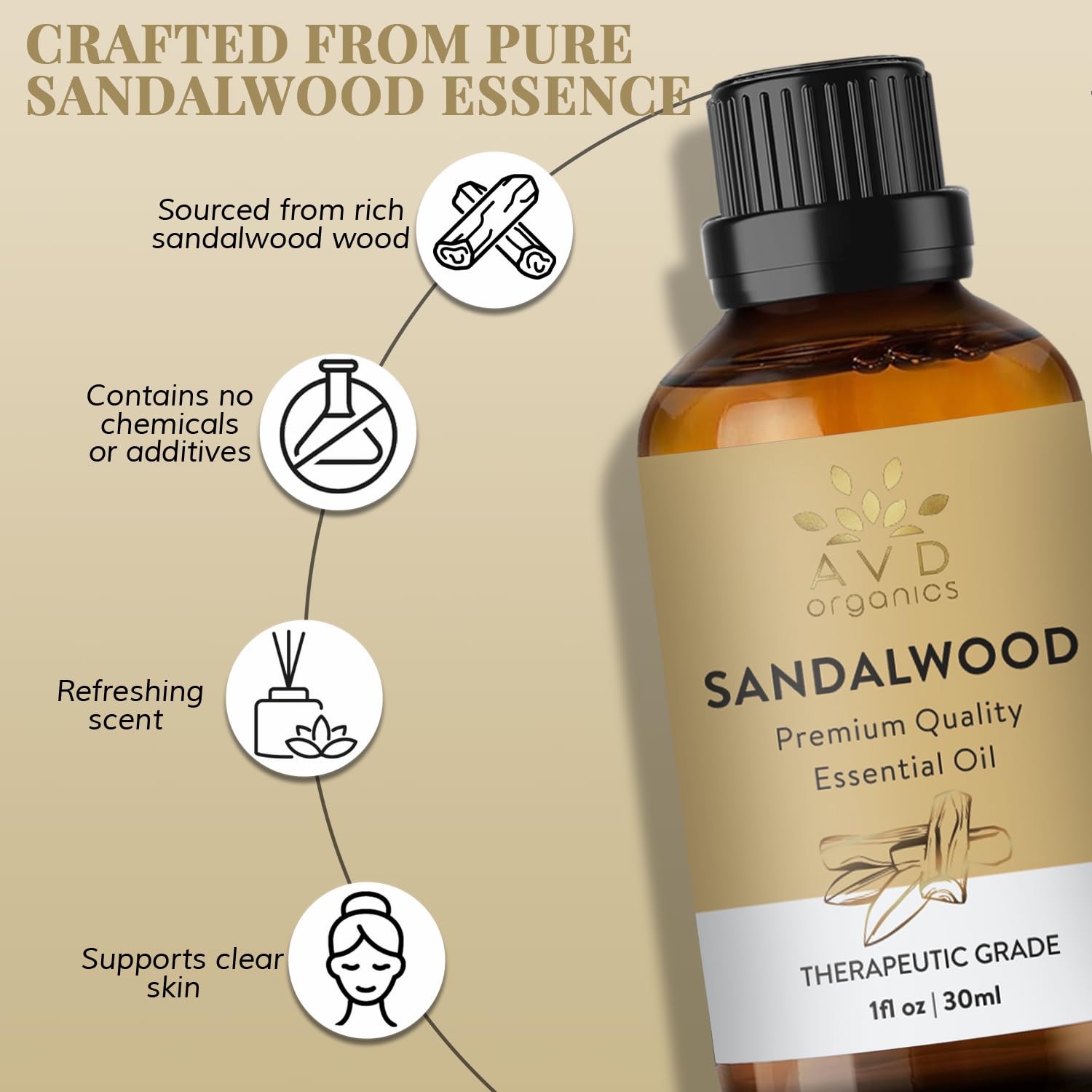 AVD ORGANICS Ätherisches Sandelholzöl 30 ml | 100% rein & natürlich | Sandelholzöl therapeutische Qualität für Haut, Diffusor, Aromatherapie & Klarheit | 1 fl. oz.