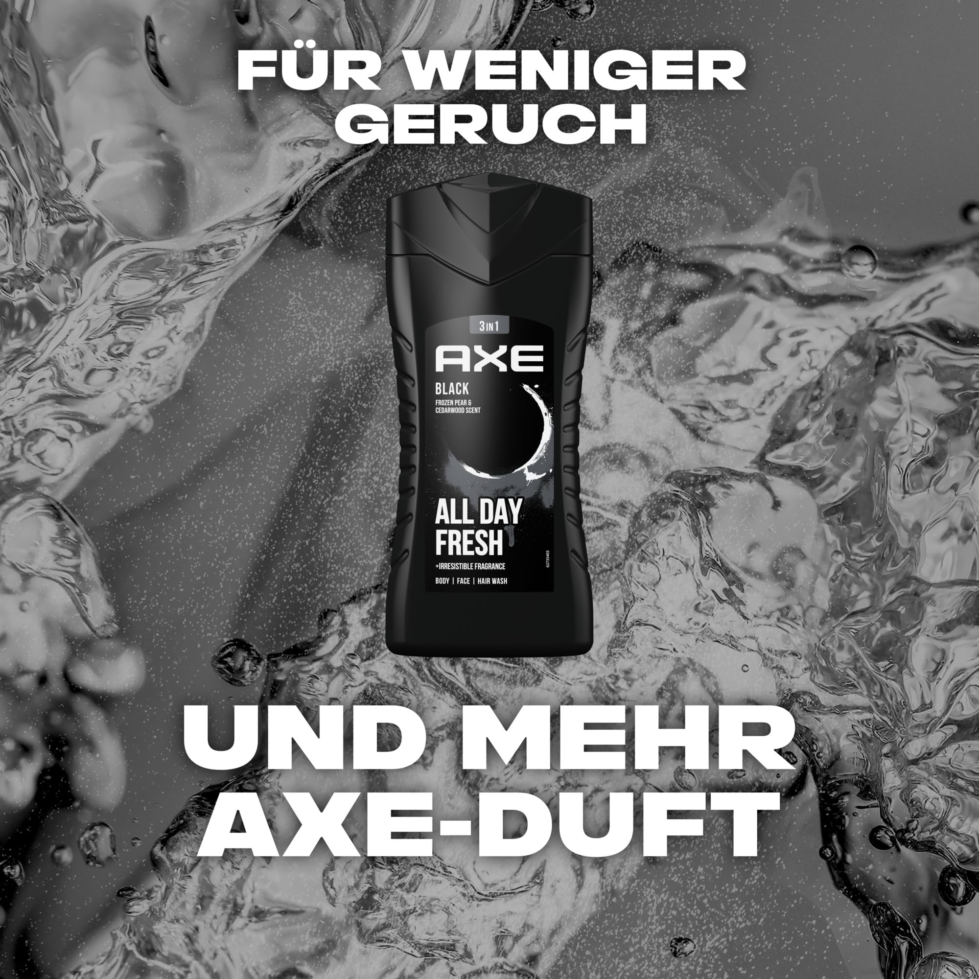 • Ganztägige Frische: AXE 3-in-1 Duschgel & Shampoo Black pflegt Körper, Gesicht und Haar und sorgt für ein langanhaltendes Duft- und Frischegefühl nach der Dusche.