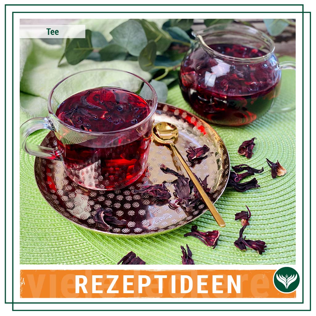 • Der abgekühlte Hibiskustee ist eine perfekte Grundlage für Smoothies – etwa mit Orange, Ashwagandha oder einem Hauch Chili. In Kombination mit Gewürzen wie Pfeffer und Ingwer entstehen besondere Gewürzmischungen und Dressings. Auch als farbenfrohes Topping auf Müsli, Bowls oder Desserts sorgen die leicht zerkrümelten Blüten für Geschmack und optische Highlights.