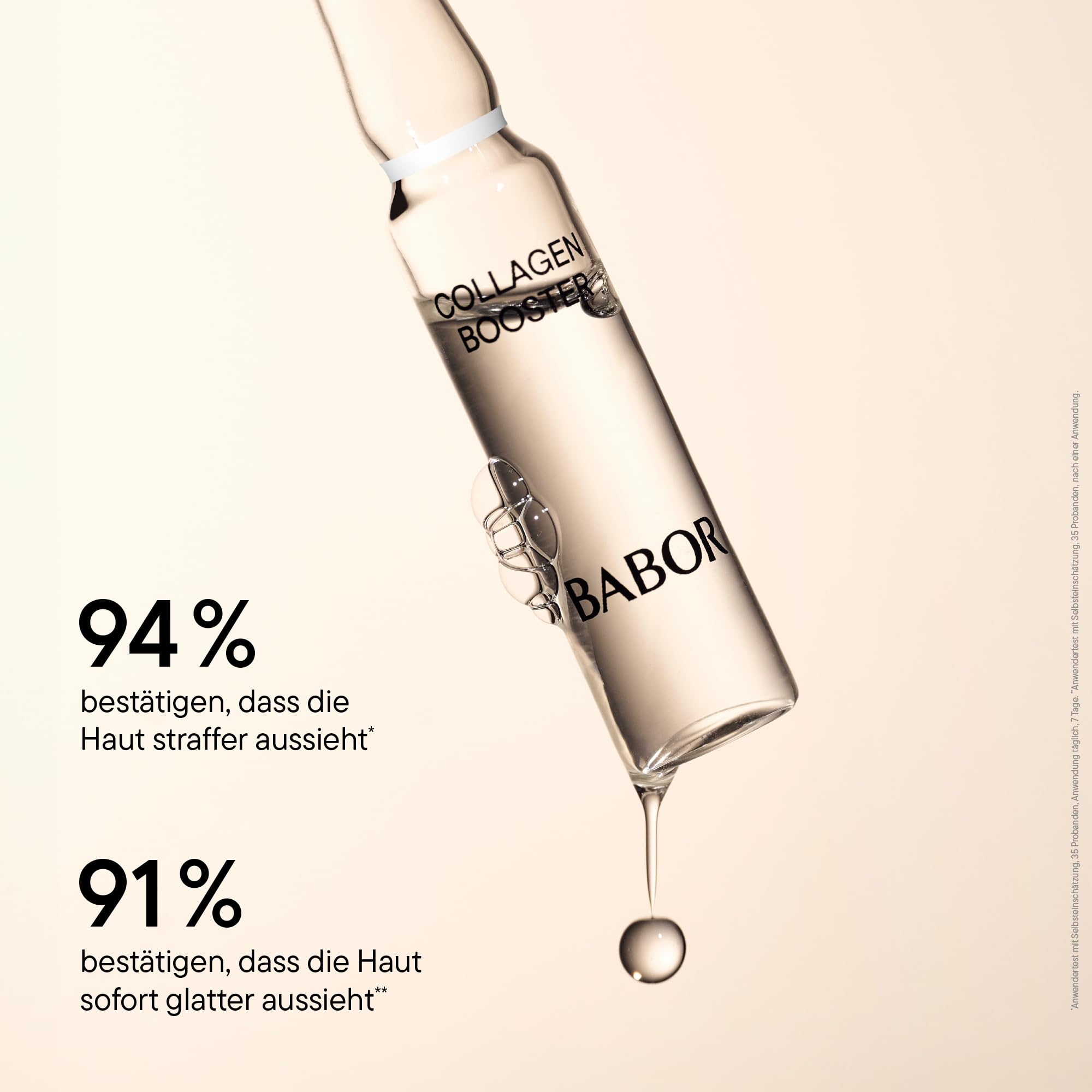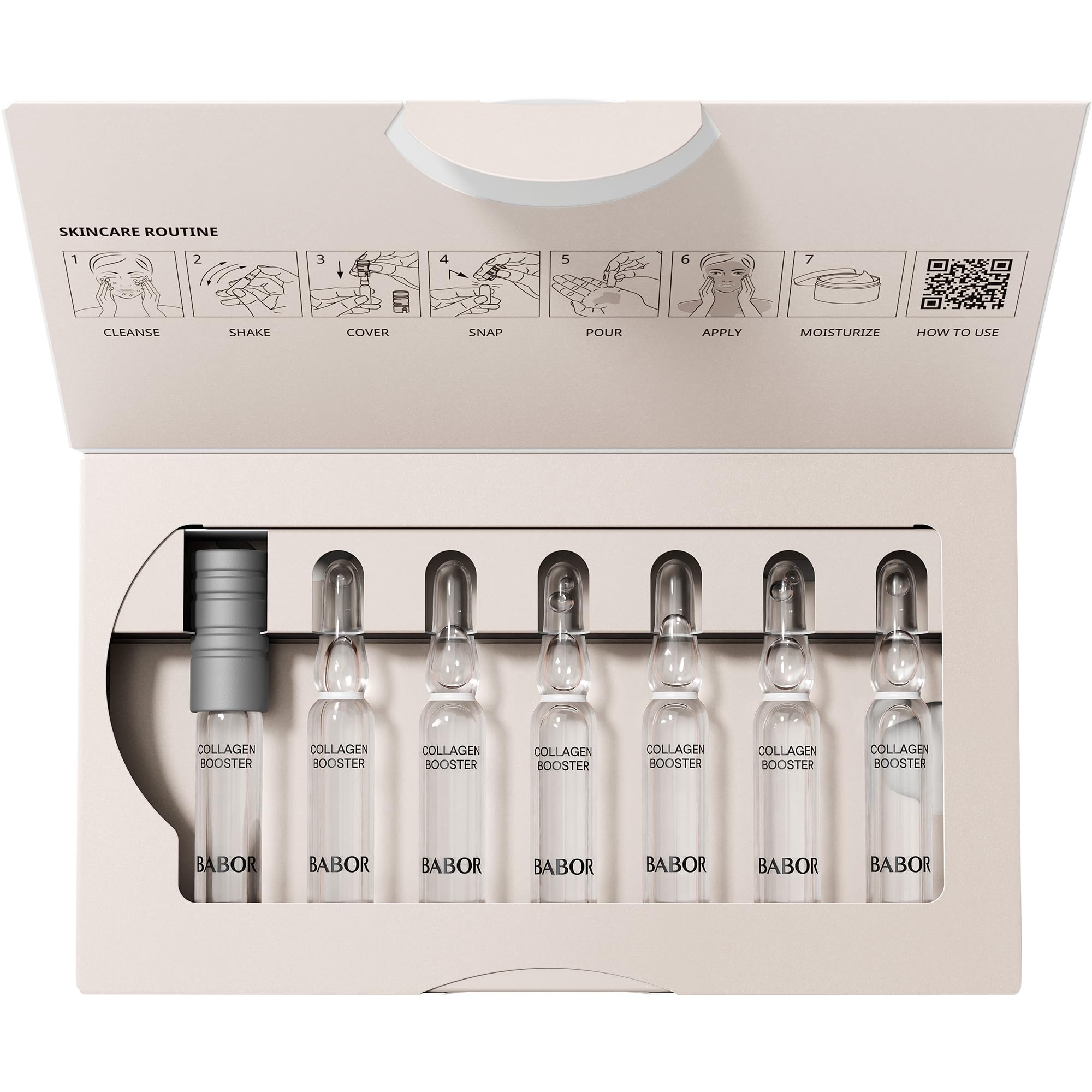 Luxuriöse Gesichtspflege für Männer und Frauen jeden Alters: Die BABOR Beauty Ampullen sind mehr als ein blosses Anti-Falten Serum für das Gesicht. Die gläsernen Collagen Booster Ampullen mit Tripeptid regen die hauteigene Kollagensynthese an. Ein pflanzlicher Aminosäurekomplex unterstützt die Hautregeneration, während Fucogel feuchtigkeitsspendend und Panthenol beruhigend wirkt. Die Ampullen sind speziell für Haut mit Elastizitätsverlust und für jeden Hauttyp geeignet, ob für feuchtigkeitsarme, trockene Haut, normale Haut, unreine Haut oder Mischhaut. Die straffenden BABOR Ampullen wirken aufpolsternd und glättend. Die Anti Aging Ampullen für das Gesicht von BABOR können als Intensivkur täglich für max. 4 Wochen als fester Bestandteil der Beauty Routine oder nach Bedarf als auffrischende Gesichtspflege zwischendurch verwendet werden. Die Packung mit 7 Ampullen reicht für entweder 7 einzelne Anwendungen, z.B. zum Auffrischen der Haut vor dem Ausgehen, für eine Wochenkur oder als Nachtpflege. Sie wird nach der Gesichtsreinigung anstatt des Serums für das Gesicht verwendet: Dafür einfach die Ampulle schütteln, aufbrechen, in die Handflächen geben, auf dem gereinigten Gesicht, Hals und Dekolleté verteilen und mit den Fingern leicht einklopfen. Die sehr leichte und schnell einziehende Gesichtskur hinterlässt keine Rückstände. Das BABOR Serum bietet die ideale Ergänzung zur BABOR Gesichtsreinigung und zu BABOR Anti-Aging Cremes. Sie sind vegan und frei von Silikonen, Parabenen, Mikroplastik, synthetischen Farbstoffen und Mineralöl - für ein noch besseres Gefühl für die Haut und Umwelt. Produkt nur für die äussere Anwendung geeignet. Von Schleimhäuten fernhalten. Anti-Falten Fluid nicht für die Anwendung auf den Lippen geeignet.