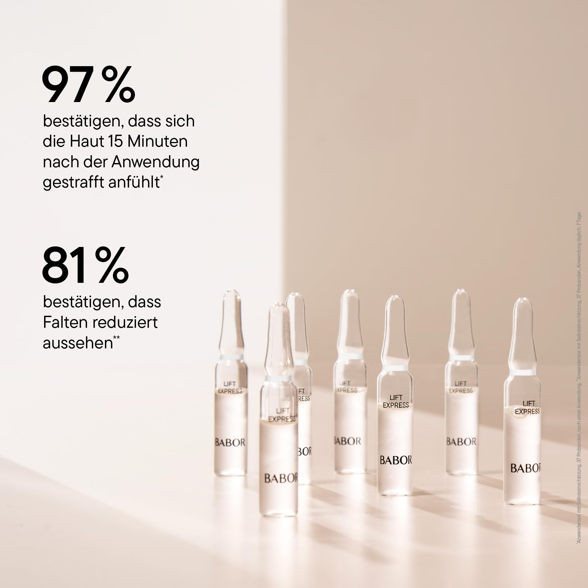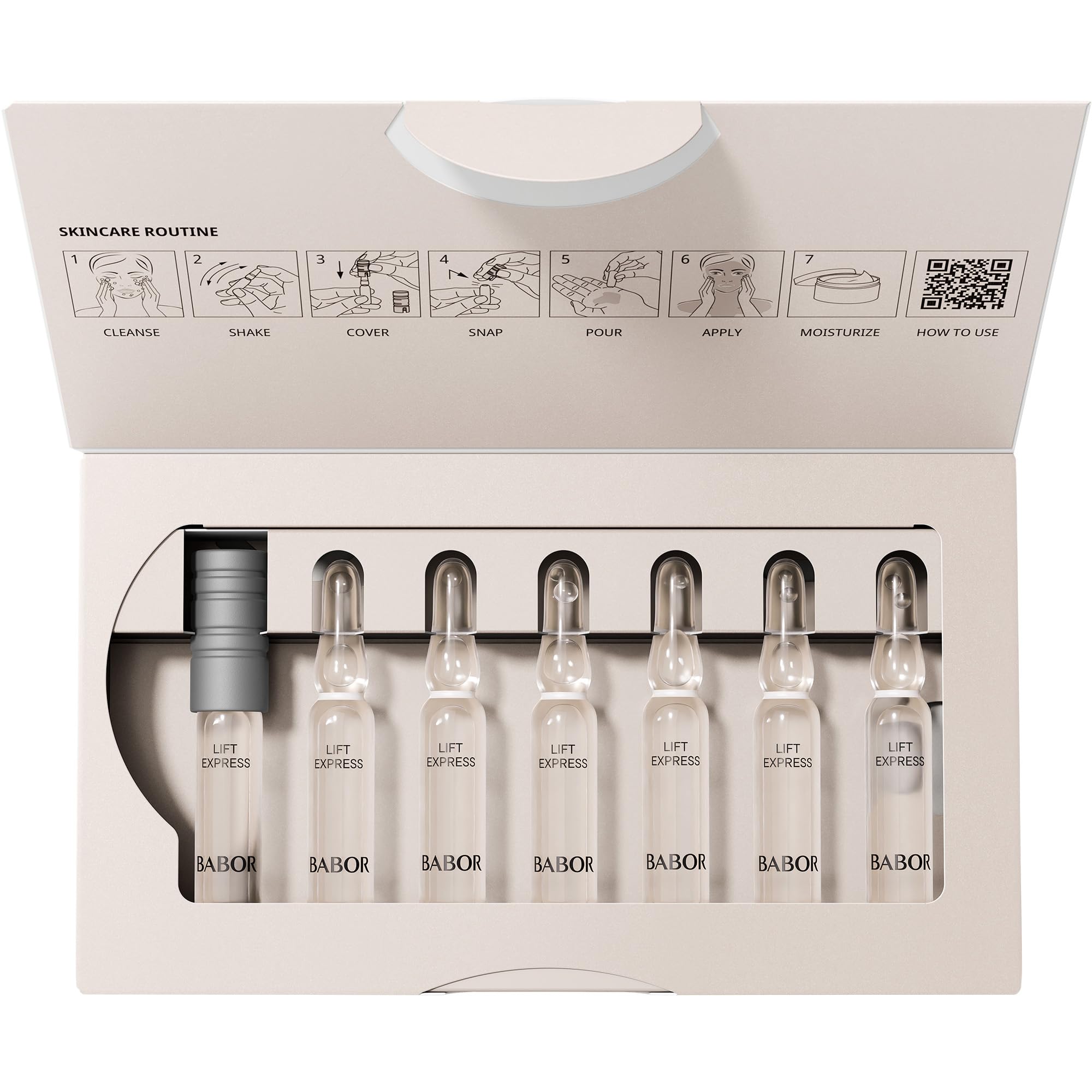 Luxuriöse Gesichtspflege für Männer und Frauen jeden Alters: Die BABOR Beauty Ampullen sind mehr als ein blosses Anti-Falten Serum für das Gesicht. Die gläsernen Lift Express Ampullen mit InstantLIFT Effekt, feuchtigkeitsspendendem Fucogel und beruhigendem Betain sind für anspruchsvolle Haut mit Falten und für jeden Hauttyp geeignet, ob für feuchtigkeitsarme, trockene Haut, normale Haut, unreine Haut oder Mischhaut. Marines Exopolysaccharid legt sich mit seiner speziellen Struktur auf das Hautrelief und füllt innerhalb von 15 Minuten Falten und Unebenheiten über mehrere Stunden anhaltend sichtbar auf. Die straffenden BABOR Ampullen reduzieren so im Handumdrehen Linien und Falten im Gesicht und die Haut fühlt sich fester an. Der sofort spürbare Straffungseffekt hält bis zu 6 Stunden. Die Anti Aging Ampullen für das Gesicht von BABOR können als Intensivkur täglich für max. 4 Wochen als fester Bestandteil der Beauty Routine oder nach Bedarf als auffrischende Gesichtspflege zwischendurch verwendet werden. Die Packung mit 7 Ampullen reicht für entweder 7 einzelne Anwendungen, z.B. zum Auffrischen der Haut vor dem Ausgehen, für eine Wochenkur oder als Nachtpflege. Sie wird nach der Gesichtsreinigung anstatt des Serums für das Gesicht verwendet: Dafür einfach die Ampulle schütteln, aufbrechen, in die Handflächen geben, auf dem gereinigten Gesicht, Hals und Dekolleté verteilen und mit den Fingern leicht einklopfen. Die sehr leichte und schnell einziehende Gesichtskur hinterlässt keine Rückstände. Das BABOR Serum bietet die ideale Ergänzung zur BABOR Gesichtsreinigung und zu BABOR Anti-Aging Cremes. Sie sind vegan und frei von Silikonen, Parabenen, Mikroplastik, synthetischen Farbstoffen und Mineralöl - für ein noch besseres Gefühl für die Haut und Umwelt. Produkt nur für die äussere Anwendung geeignet. Von Schleimhäuten fernhalten. Anti-Falten Fluid nicht für die Anwendung auf den Lippen geeignet.