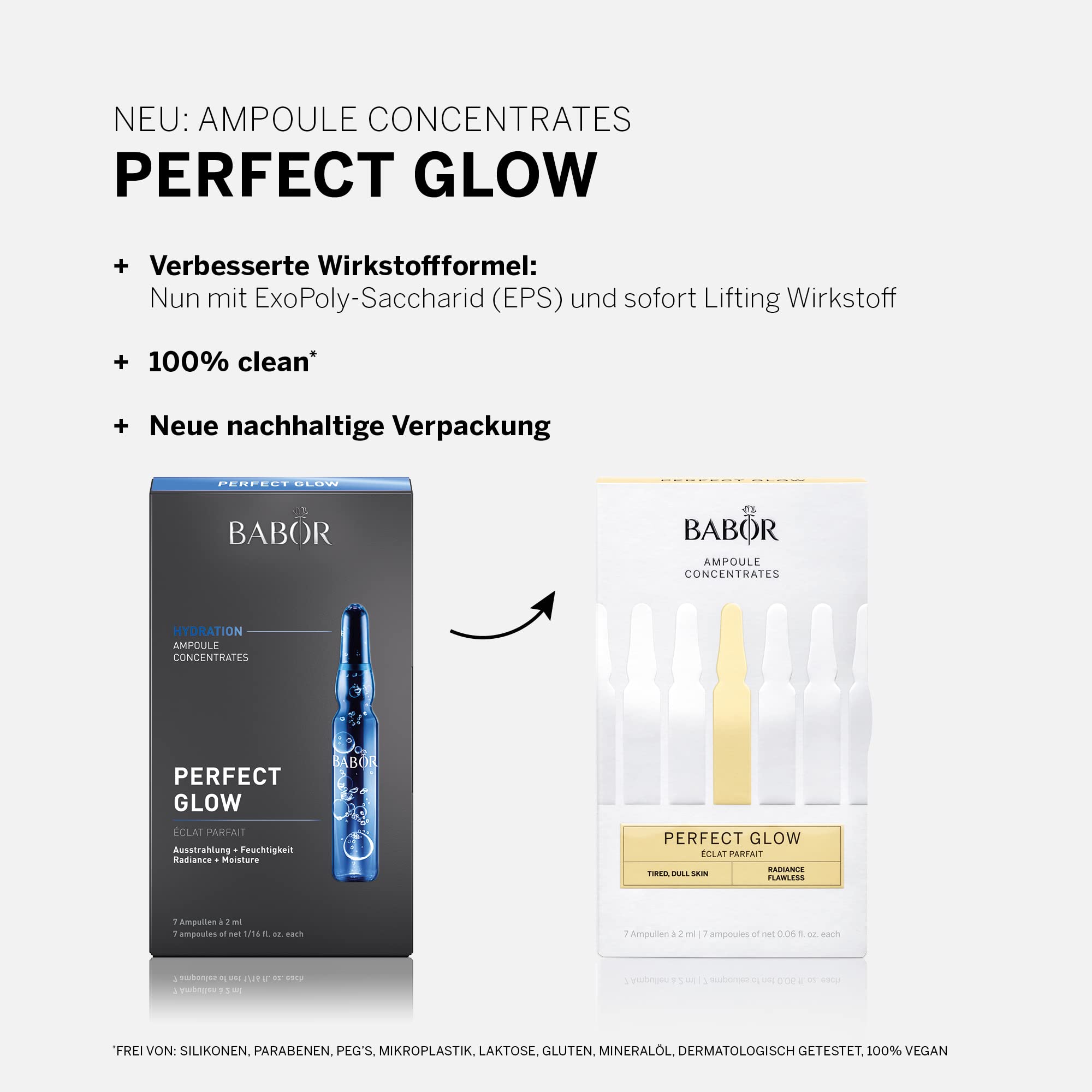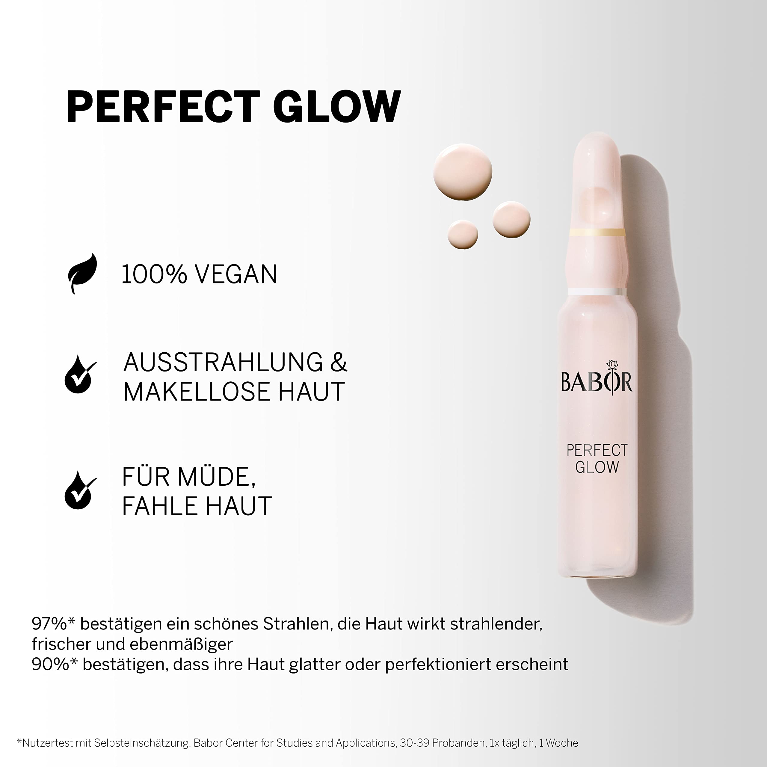 Die BABOR Perfect Glow Serum Ampullen sind ein hochkonzentriertes Beauty-Treatment, das entwickelt wurde, um deiner Haut sofortige Strahlkraft, eine ebenmässige Ausstrahlung und einen frischen Glow zu verleihen. Die Formel kombiniert zarte Glow-Pigmente, die das Licht reflektieren und einen “Soft-Focus”-Effekt erzeugen, mit einer leistungsstarken Wirkstoffmischung, die die Haut glatter, hydratisierter und gesünder erscheinen lässt – ideal für alle, die ihren Teint revitalisieren möchten.