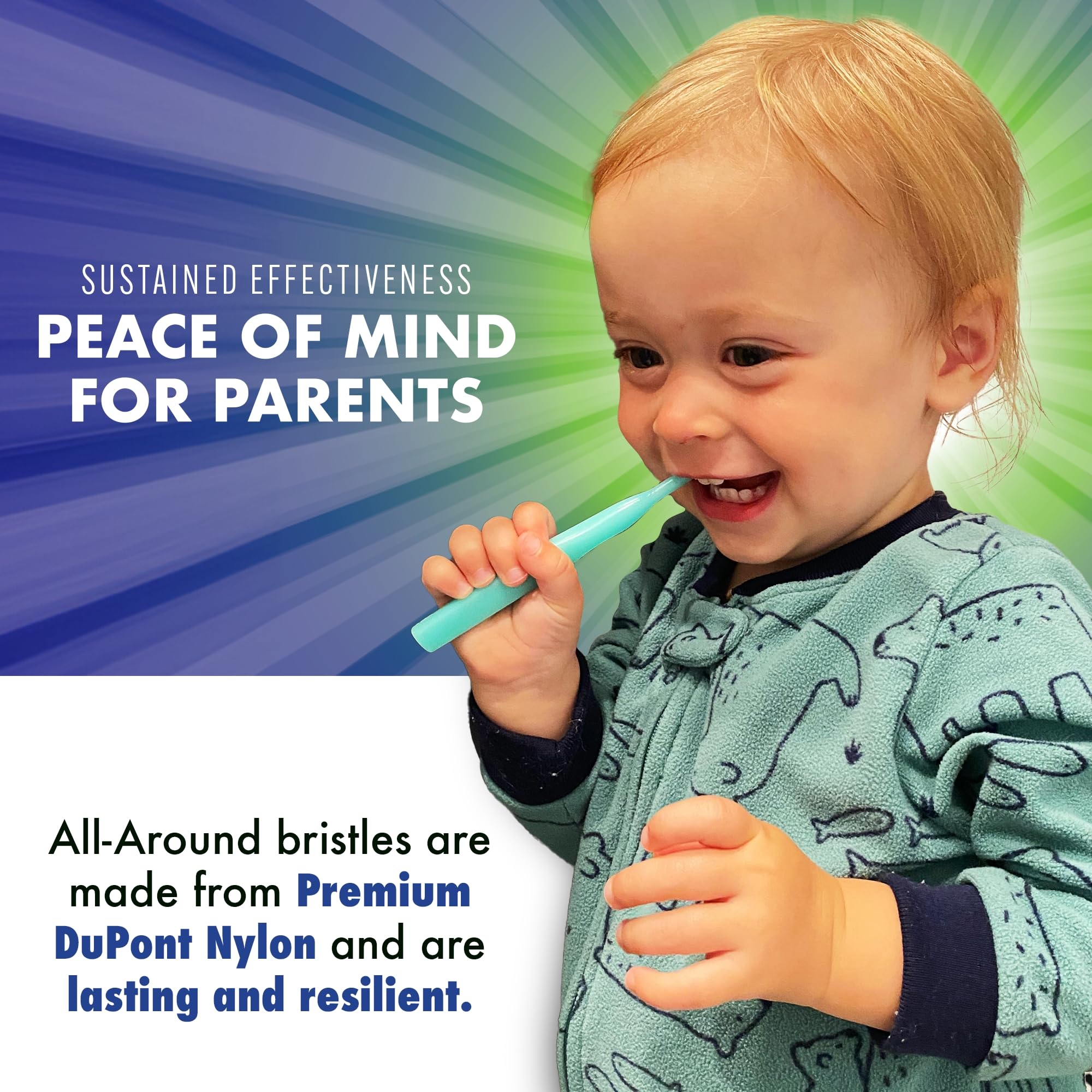 Die neue 360-Grad-Zahnbürste von Baby Buddy ist wirklich innovativ – sie ist die weltweit erste 360-Grad-Zahnbürste. Es wurde im Osaka University Dental Hospital of Japan entwickelt. Die Zahnbürste hat eine unvergleichliche Reinigungskraft dank der 10.000 mikrofeinen Borsten – 10-mal mehr als die durchschnittliche Zahnbürste. Kreisringe halten die Borsten fest an Ort und Stelle, während die Unterlegscheiben zwischen den Borstenschichten es effektiver machen, Plaque zu entfernen und die Bürste sauber zu halten. Funktioniert hervorragend für die Reinigung der Zunge und zur Massage des Zahnfleischs. Schritt 1 verfügt über 0,07 mm Borsten und ist für Kinder von 4 bis 24 Monaten gedacht. 1) Unterschied in den Borsten: Die Borsten der 360 Zahnbürste sind kurz, aber aus weicher, hochelastischer, ultrafeiner Mikrofaser. 2) Unterschied in der Patenttechnologie: Das patentierte Design der 360-Zahnbürste verfügt über Unterlegscheiben, die zwischen den Borstenschichten überbrücken, sodass die Zahnbürste schnell trocknet und sauber ist. 3) Unterschied im einzigartigen Design: Die 360-Grad-Zahnbürste hat keine Rillen für Borsten wie übliche Zahnbürsten, die Kupferdraht verwenden, um die Borsten an Ort und Stelle zu halten. Zahnpasta, Fett und Protein können in diesen Rillen der üblichen Zahnbürsten stecken bleiben und so eine Umgebung schaffen, in der Keime überleben und wachsen können. 4) Unterschied beim Zähneputzen: Die 360-Grad-Zahnbürste wurde entwickelt, um jeden Winkel des Mundes, der Zähne, des Zahnfleisches und der Zunge zu erreichen und zu reinigen. - Bürsten Sie seitlich, nach oben und unten und in jede Richtung, um die Zähne sauber zu halten. - Verbraucher behaupten die höchste Wirksamkeit bei der Zungenreinigung. Weiche, ultrafeine mikrofeine Borsten ermöglichen das Bürsten nur mit Wasser. Sie müssen sich keine Sorgen machen, dass Kinder Zahnpasta schlucken und unter Magenverstimmungen leiden. Dies ist für viele Mütter zu einem wichtigen Grund geworden. 5) Unterschied in der Haltbarkeit: Die 360 Zahnbürste hält laut Kundenrezensionen ca. 3–6 Monate.