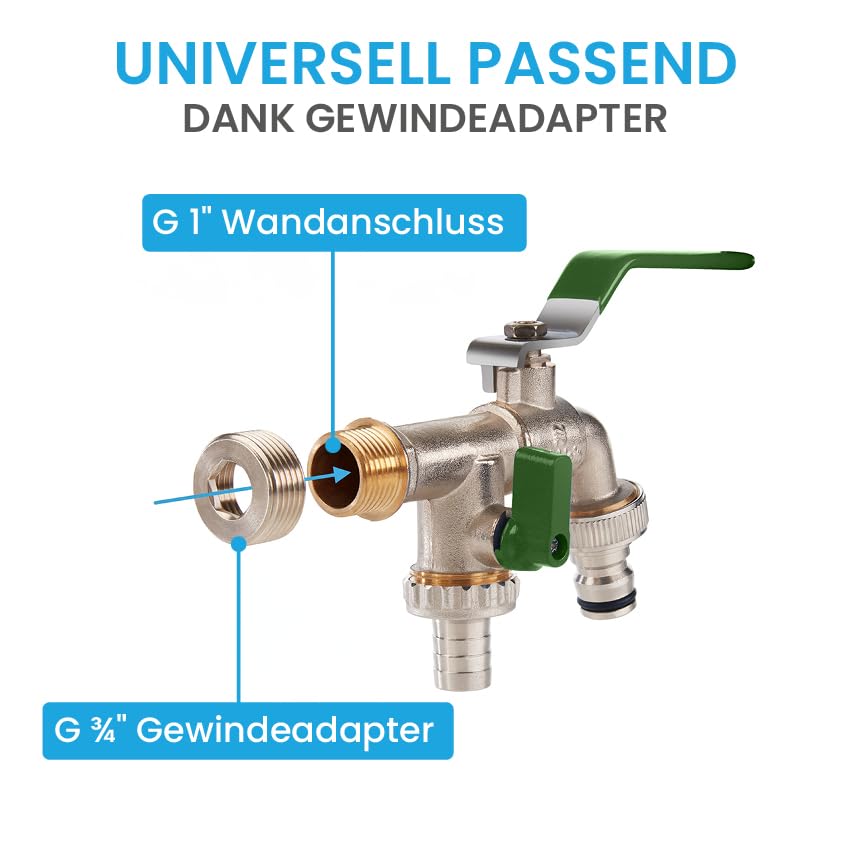 Bächlein Universal Doppel Auslaufhahn mit Reduzierungs-adapter für 1" Wandanschluss - Auslaufhahn mit 1/2 Zoll Anschluss und 1 Zoll Adapter