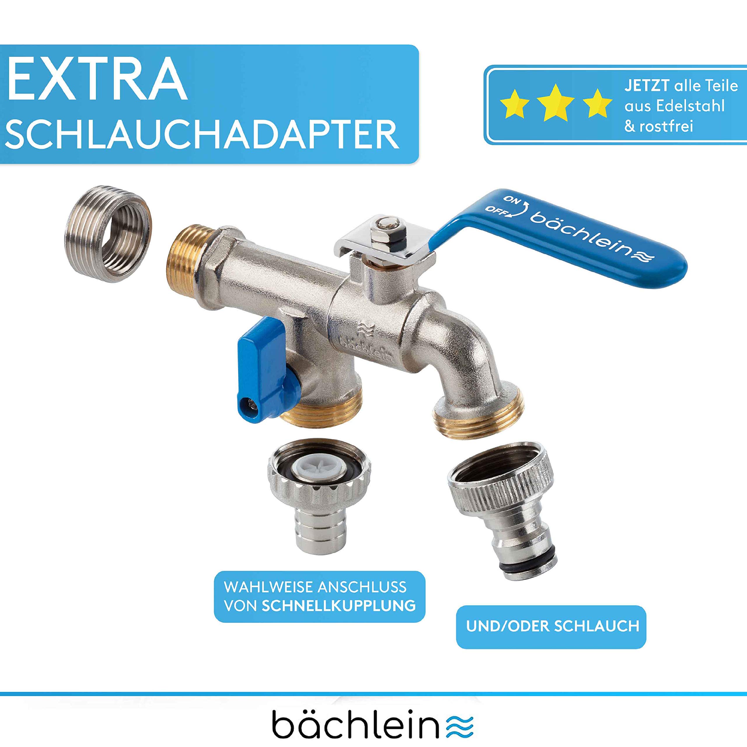 Bächlein Universal Doppel Auslaufhahn für den Garten [blau] inkl. 2 Schlauchanschlüssen - edler Doppelwasserhahn mit 1/2 Zoll Anschluss und 3/4 Zoll Adapter, Doppel Kugel-Auslaufventil