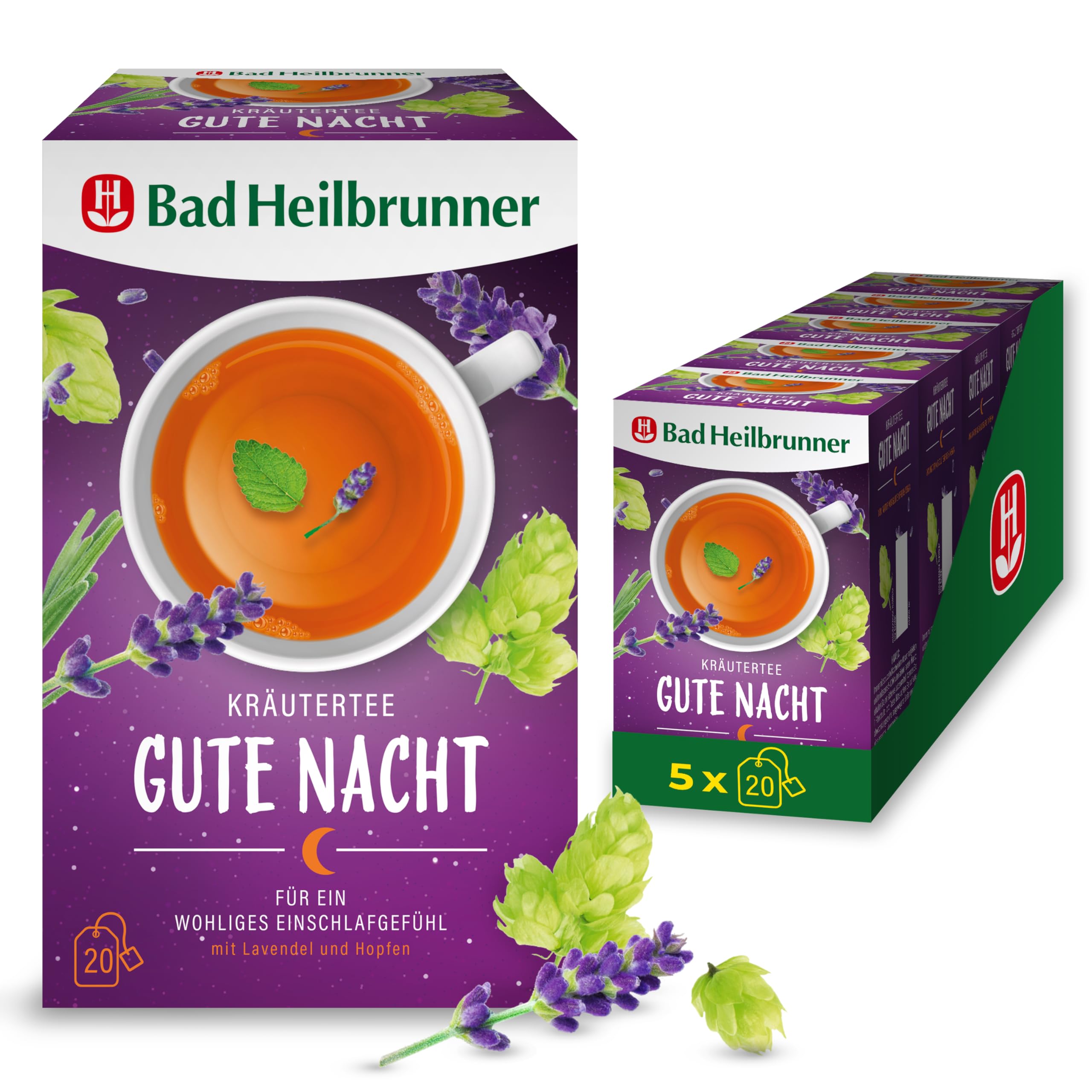Bad Heilbrunner Gute Nacht Tee - Kräutertee im Filterbeutel - Melisse, Lavendel, Hopfenzapfen - für ein wohliges Einschlafgefühl - bei innerer Unruhe & Einschlafproblemen (5 x 20 Filterbeutel)
