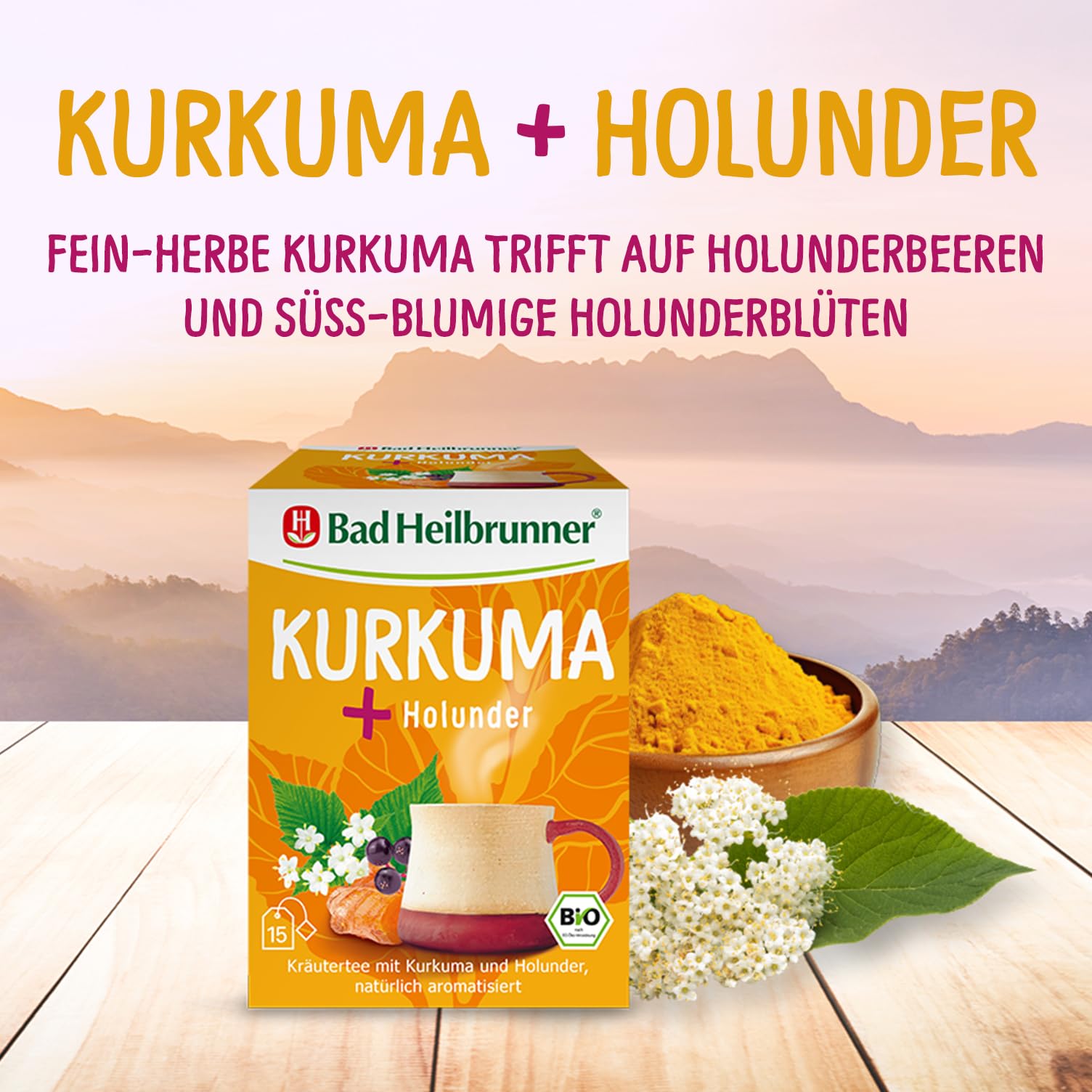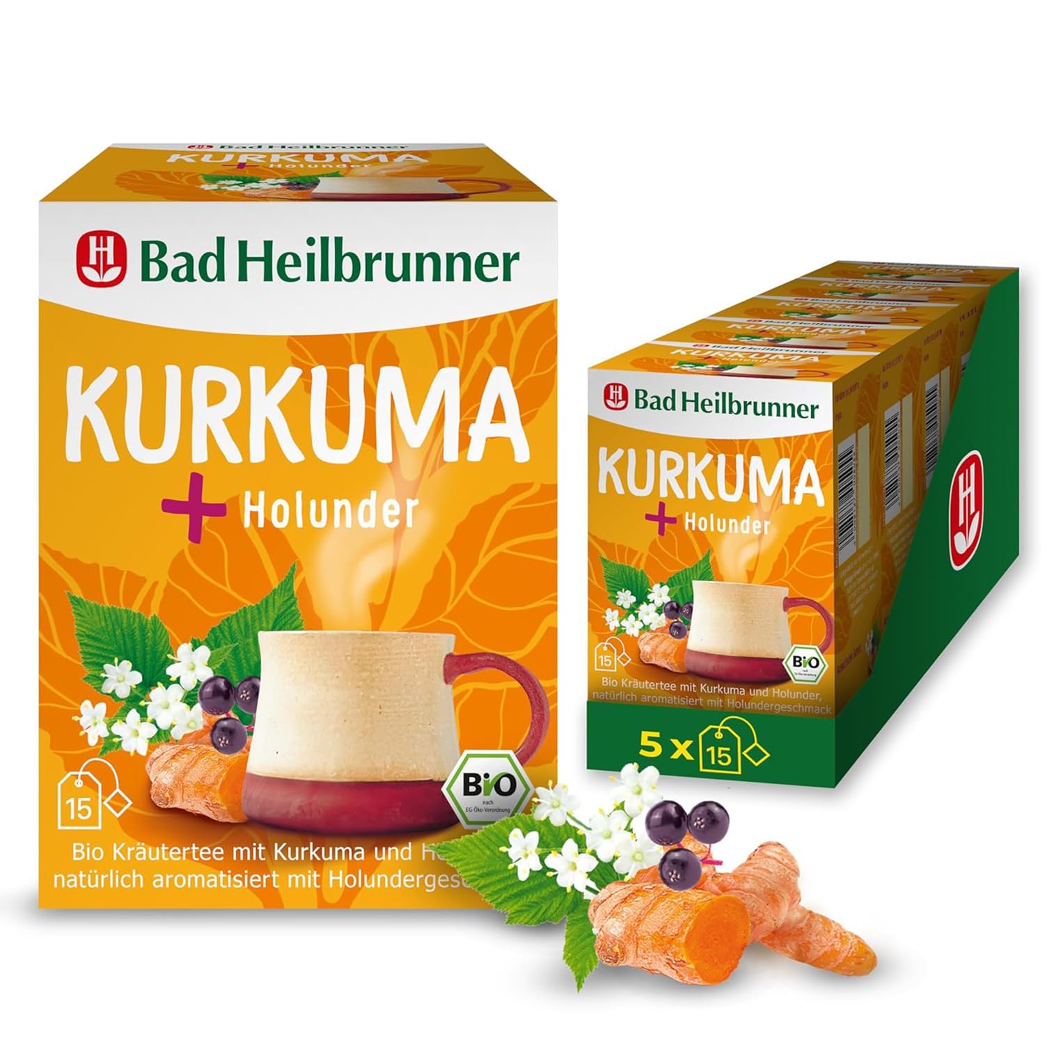 Bad Heilbrunner Kurkuma+ Holunder Tee – Bio-Kräutertee mit Kurkuma, Holunderbeeren und Holunderblüten, natürlich aromatisiert, (5 x 15 Filterbeutel)