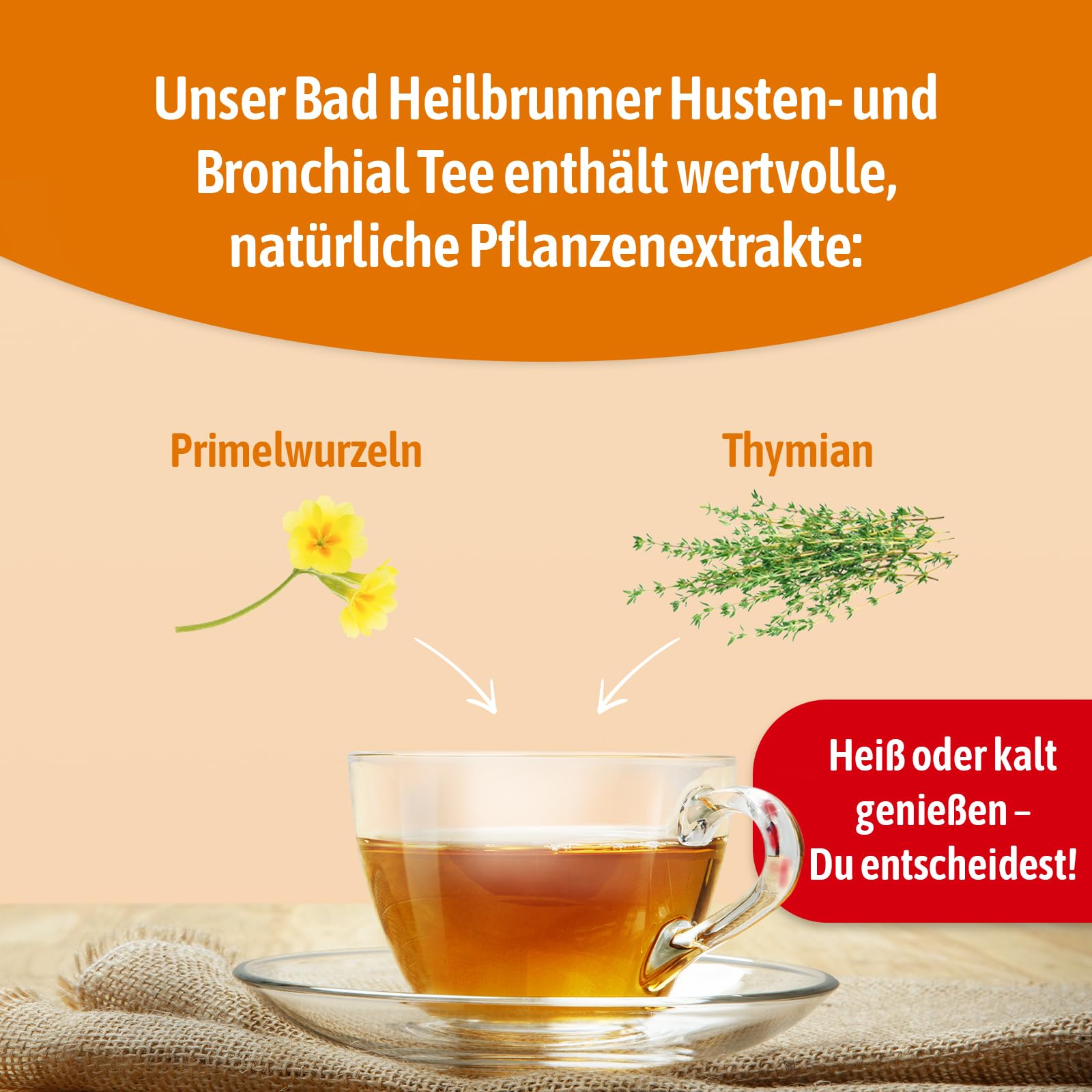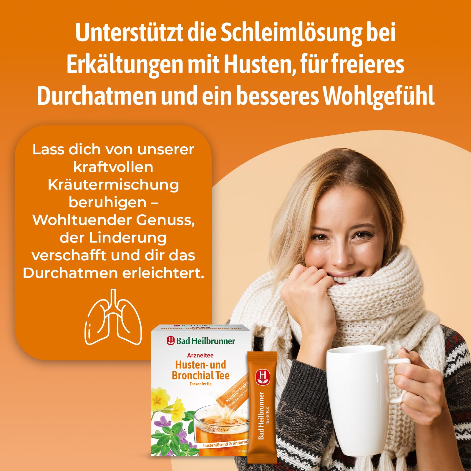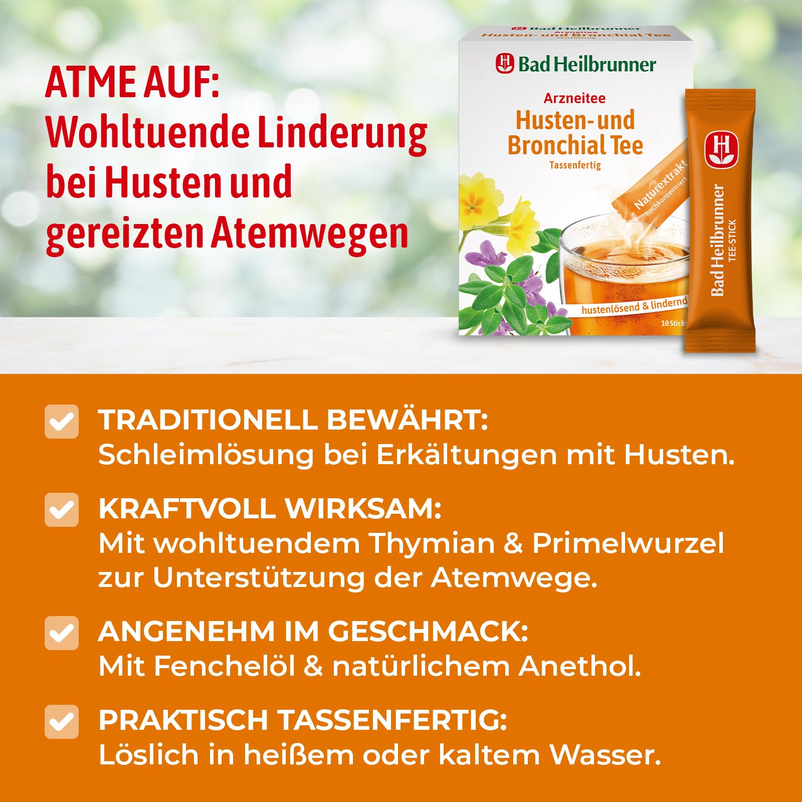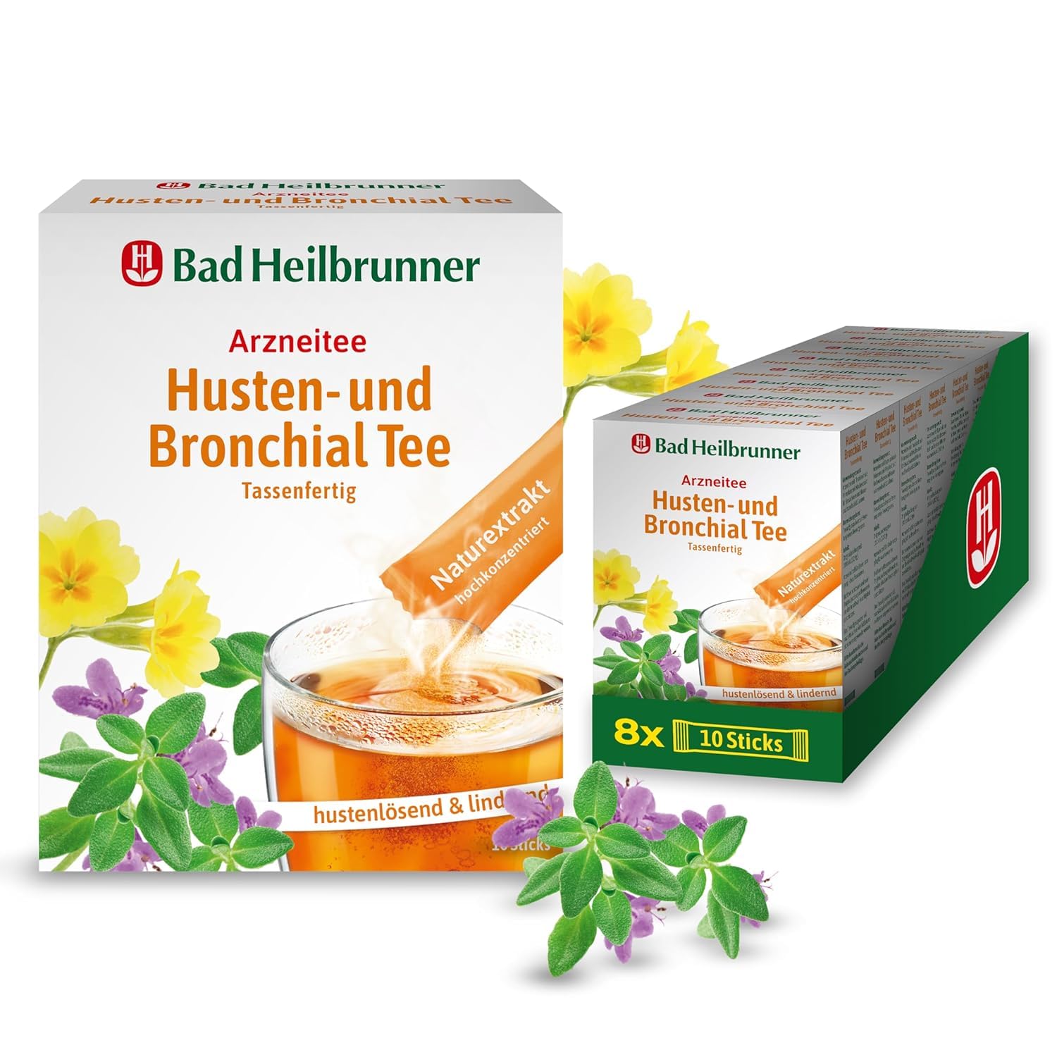 Bad Heilbrunner Husten- & Bronchial - Arzneitee im Stick - Tassenfertig - Spitzwegerich, Thymian & Bitterer Fenchel - reizlindernd bei Bronchitis, trockenem Husten & Erkältungen (8 x 10 Sticks)