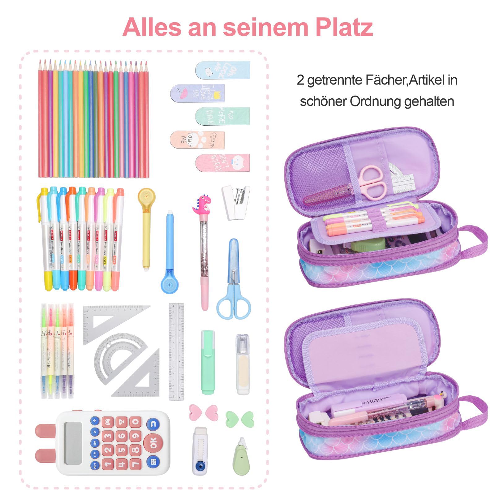 Bagseri Federmäppchen für MädchenSpeziell für Mädchen, die ihrem Schulalltag gerne einen Hauch von Stil verleihen! Dieses Federmäppchen im „Glitter Purple Tie-dye“-Design bietet eine einzigartige Kombination aus Kapazität, Haltbarkeit und Mode und ist damit die perfekte Wahl für Kinder, Jugendliche und alle dazwischen, die auf witzige und funkelnde Weise Ordnung halten möchten.Das Bagseri Spezial-Federmäppchen ist nicht nur optisch ein Hingucker; es ist aus hochwertigem, wasserabweisendem 900D-Gewebe gefertigt und hält dem täglichen Gebrauch stand. Die langlebige Konstruktion, hervorgehoben durch zwei robuste Reissverschlüsse, macht dieses Federmäppchen zu einem zuverlässigen Begleiter für die täglichen Anforderungen des Schulalltags.Es eignet sich jedoch für mehr als nur Bleistifte und Kugelschreiber. Dieses vielseitige Etui eignet sich perfekt zur sicheren Aufbewahrung von Elektronik, Bastelbedarf oder sogar Make-up und ist somit ein wunderbares Geschenk. Ob für die Schule oder auf Reisen, dieses Federmäppchen für Kinder passt mühelos in jeden Rucksack oder Schreibtisch.Dank der praktischen Öffnung im Buchstil und des leichten Designs müssen Sie nie wieder nach einem versteckten Stift suchen. Stattdessen haben Sie alles, was Sie brauchen, direkt zur Hand und vereinen Funktionalität mit Benutzerfreundlichkeit und Stil.Wählen Sie das süsse Federmäppchen von Bagseri als Schulaccessoire, das auffällt, hält und aufmuntert – bestehen Sie darauf, organisiert und stilvoll zugleich zu sein!