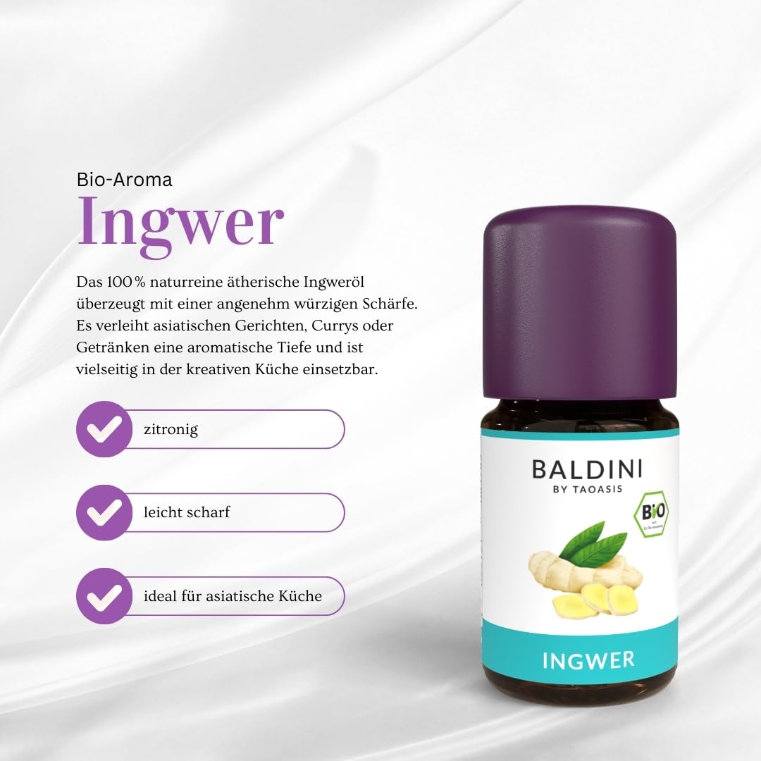 Mit dem Baldini Bioaroma Ingwer bringst du Wärme, Energie und eine kraftvolle Würznote in dein Zuhause und geniesst die vielseitigen Vorteile eines hochwertigen ätherischen Ingweröls.