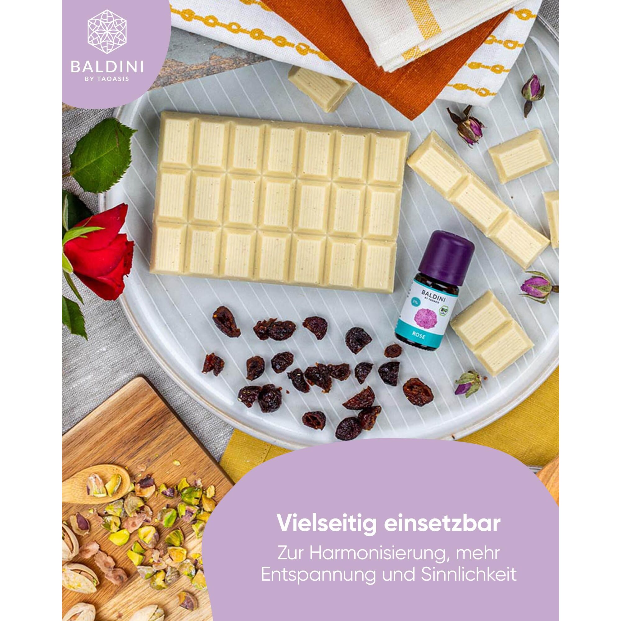 Mindestanzahl für die Bestellung von "Baldini Bio Rosenöl 5ml - 100% Naturreines Ätherisches Öl - Lebensmittelqualität - Vegan - für Speisen, Getränke & Aroma Diffuser - aus Bulgarien" ist 1.