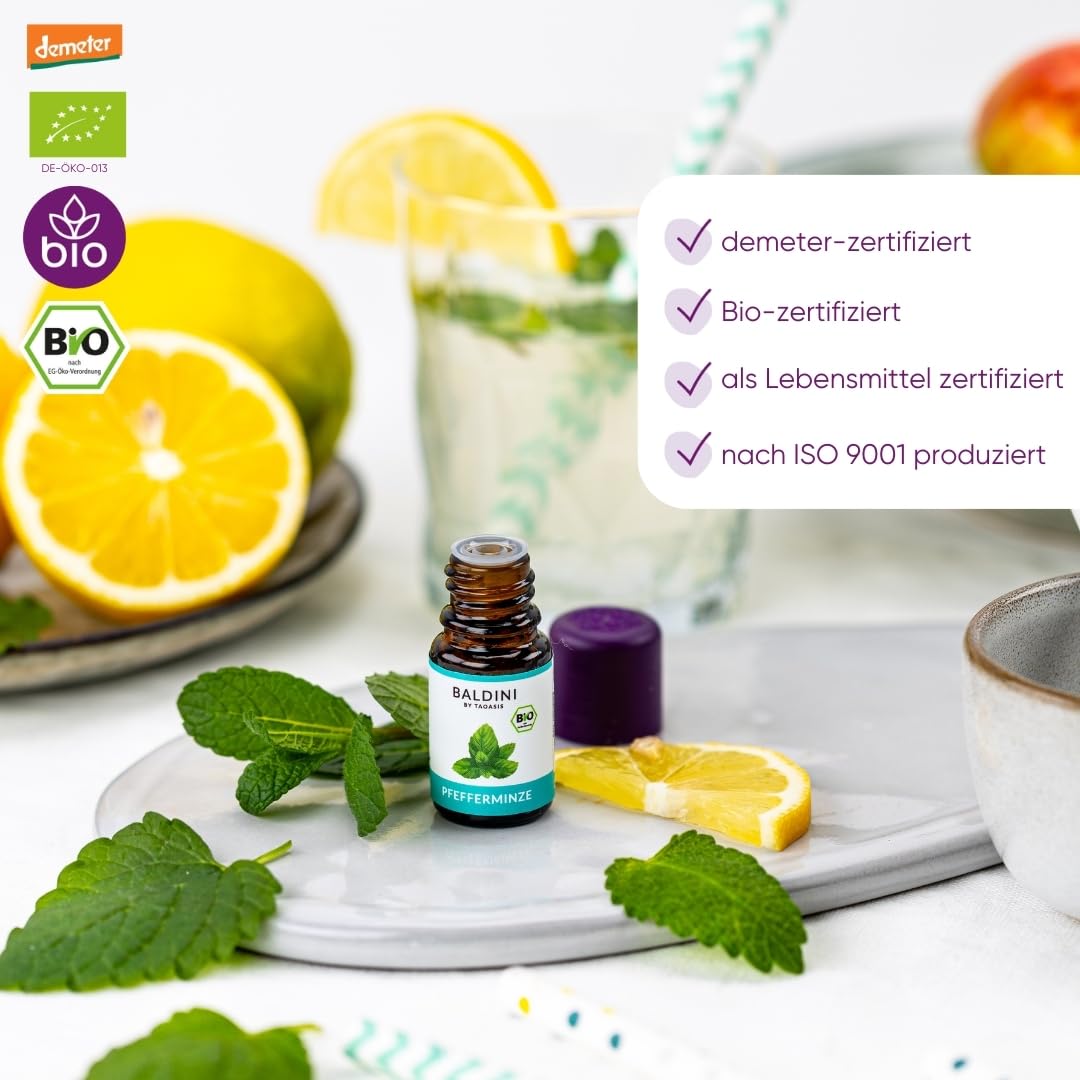 Mindestanzahl für die Bestellung von "Baldini Bio-Aroma Pfefferminze – 100 % naturreines ätherisches Öl (Mentha piperita) – Demeter- und lebensmittelzertifiziert – Vielseitig einsetzbar für Küche, Duftlampe & Hautpflege – 5 ml" ist 1.
