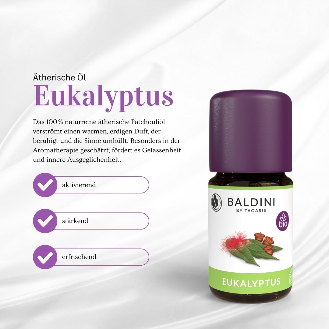 Baldini Eukalyptusöl in bewährter Bio Qualität aktiviert und fördert die Konzentration. Das Öl ergänzt jede Aromatherapie-Apotheke perfekt, kann aber auch beispielsweise als Raumduft genutzt werden.