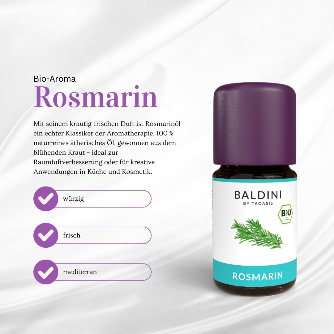 Mit dem Baldini Bio Rosmarinöl bringst du mediterrane Frische, Klarheit und die vielseitigen Vorteile eines hochwertigen ätherischen Rosmarinöls in Bio-Qualität in deinen Alltag.